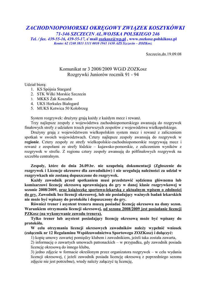 ZACHODNIOPOMORSKI OKRĘGOWY ZWIĄZEK KOSZYKÓWKI 71-346 SZCZECIN AL.WOJSKA POLSKIEGO 246 Tel. / fax. 439-55-16, 439-55-17, e`mail [email protected] , www.zozkosz.polskikosz.pl Konto: 62 1240 3813 1111 0010 1941 1430 AZS Szczecin – ZOZKosz Szczecin,dn.19.09.08 Komunikat nr 3 2008/2009 WGiD ZOZKosz Rozgrywki Juniorów rocznik 91 - 94 Udział biorą: 1. KS Spójnia Stargard 2. STK Wilki Morskie Szczecin 3. MKKS Żak Koszalin 4. UKS Herkules Białogard 5. MUKS Kotwica 50 Kołobrzeg System rozgrywek: drużyny grają każdy z każdym mecz i rewanż. Trzy najlepsze zespoły z województwa zachodniopomorskiego awansują do rozgrywek finałowych strefy z udziałem trzech pierwszych zespołów z województwa wielkopolskiego. Drużyny grają z województwem wielkopolskim system mecz i rewanż z zaliczeniem spotkań w swoich województwach. Cztery najlepsze zespoły awansują do rozgrywek w regionie. Cztery zespoły ze strefy wielkopolskie-zachodniopomorskie rozgrywają mecz i rewanż z zespołami ze strefy łódzkie – kujawsko-pomorskie, z zaliczeniem wyników z rozgrywek w strefie. Z regionu cztery zespoły awansują do półfinałowych rozgrywek na szczeblu centralnym. Zespoły, które do dnia 26.09.br. nie uzupełnią dokumentacji (Zgłoszenie do rozgrywek i Licencje okresowe dla zawodników) i nie uregulują należności za udział w rozgrywkach nie zostaną dopuszczone do rozgrywek. Każdy zawodnik przed spotkaniem musi przedstawić sędziemu głównemu lub komisarzowi licencję okresową uprawniającą do gry w danej klasie rozgrywkowej w sezonie 2008/2009, oraz książeczkę sportowo-lekarską z aktualnym wpisem o zdolności do gry. Zawodnik bez licencji okresowej, lub nie posiadający ważnych badań lekarskich nie może być wpisany do protokółu i dopuszczony do gry. Również trener i asystent trenera muszą posiadać licencję okresowa na dany sezon. Warunkiem otrzymania licencji okresowej, od sezonu 2008/2009 jest posiadanie licencji PZKosz (na wykonywanie zawodu trenera). Tylko trener lub asystent posiadający licencję okresową może być wpisany do protokółu. W celu otrzymania licencji okresowych zawodników należy wypełnić wniosek (załącznik nr 12 Regulaminu Współzawodnictwa Sportowego ZOZKosz) i dołączyć: 1) kopię umowy zawartej pomiędzy klubem i zawodnikiem, jeżeli taka została zawarta, 2) informację o zawartych umowach patronackich – w przypadku, gdy zawodnik posiada licencję okresową do innego klubu, 3) jedno zdjęcie w formacie określonym przez organizatora rozgrywek – w celu wydania licencji okresowej, ( jeżeli zawodnik posiada licencję okresową z poprzedniego sezonu zdjęcie nie jest potrzebne), wtedy należy załączyć tą licencję, 4) w przypadku zawodnika zmieniającego barwy klubowe – list czystości, 5) w przypadku zawodnika wypożyczonego – kopię umowy o wypożyczeniu zawartą między klubami na jeden sezon wraz ze zgodą zawodnika na to wypożyczenie, 6) kserokopię wpłaty za licencje okresowe. Na dowodzie wpłaty należy wyszczególnić, z jakiego tytułu jest dokonywana wpłata ( np. za udział młodzików 150 zł, juniorów 300 zł, lic. okr. młodzików 15x20=300 zł, juniorów 12x40=480 zł, razem 1230 zł ). Jeżeli w terminarzu nie ma podanej godziny i/lub miejsca spotkania to gospodarz zobowiązany jest zawiadamiać, do końca rundy ZOZKosz, przeciwnika, sędziów i referenta obsad – Tomasz Trawicki – tel. 0601-943-556, oraz odpowiedzialne osoby za obsadę stolika sędziowskiego w poszczególnych rejonach; Koszalin i okolice Przemysław Jabłoński - tel. 0604-442-115, Kołobrzeg - Mirosław Kabaciński – tel. 0608-331-363, Stargard Szczeciński - Romuald Żukowski – tel. 0880-667-715 co najmniej na 7 dni przed zawodami. Również w przypadku zmiany dnia, godziny lub miejsca spotkania powyższy obowiązek spoczywa na gospodarzu lub gościach, jeżeli to na ich prośbę nastąpiła zmiana. Przełożenie spotkania z ważnych przyczyn może nastąpić za zgodą WGiD, po przedłożeniu pisemnej prośby drużyny, do której należy dołączyć zgodę przeciwnika, oraz w przypadku drugiej i następnej prośby w sezonie ksero opłaty (50zł). Każda drużynie ma prawo do jednego bezpłatnego przełożenia. Przełożenie spotkania bez zgody WGiD – kara 100 zł. Spotkanie może być przełożone tylko na termin wcześniejszy przed planowanym, ze względu na brak wolnych terminów i konieczność zakończenia rozgrywek do 01.02.09. Obowiązkiem sędziego głównego jest podanie SMS’em wyniku (bez podawania wyników poszczególnych kwart) wszystkich meczy Ligi Zachodniopomorskiej najpóźniej, na 2h po zakończeniu zawodów, na nr Jerzego Buczkowskiego 605 -190 440 wg następującego wzoru: „liga juniorów AZS Koszalin I - Kusy Szczecin II 56:55 Jan Kowalski”. Obowiązek ten dotyczy również rozgrywek w strefie i w regionie. Wówczas wynik przesyła sędzia reprezentujący ZOZKosz (niezależnie czy jest sędzią głównym, czy pomocniczym. TERMINARZ ROZGRYWEK I RUNDA I. 04.10./sobota/ 1. Żak Koszalin – Herkules Białogard g.12.00 2. STK Wilki Morskie Szczecin – Spójnia Stargard 05.10.niedziela!!! g.13.00 pauza - Kotwica 50 Kołobrzeg II. 11.10./sobota / 3. Herkules Białogard – STK Wilki Morskie Szczecin g.11.00 4. Kotwica 50 Kołobrzeg – Żak Koszalin 12.10.niedziela!!! g.13.00 pauza – Spójnia Stargard III. 19.10./niedziela / 5. STK Wilki Morskie Szczecin – Kotwica 50 Kołobrzeg 6. Spójnia Stargard – Herkules Białogard 18.10/sobota/!!! pauza - Żak Koszalin g.13.00 g.11.00 IV. 25.10./sobota / 7. Kotwica 50 Kołobrzeg – Spójnia Stargard 8. Żak Koszalin – STK Wilki Morskie Szczecin pauza - Herkules Białogard g.13.00 g.12.00 V. 08.11./sobota / 9. Spójnia Stargard - Żak Koszalin 10. Herkules Białogard – Kotwica 50 Kołobrzeg pauza – STK Wilki Morskie Szczecin g.11.00 g.11.00 II RUNDA VI. 22.11./sobota / 11. Herkules Białogard – Żak Koszalin 12. Spójnia Stargard – STK Wilki Mors