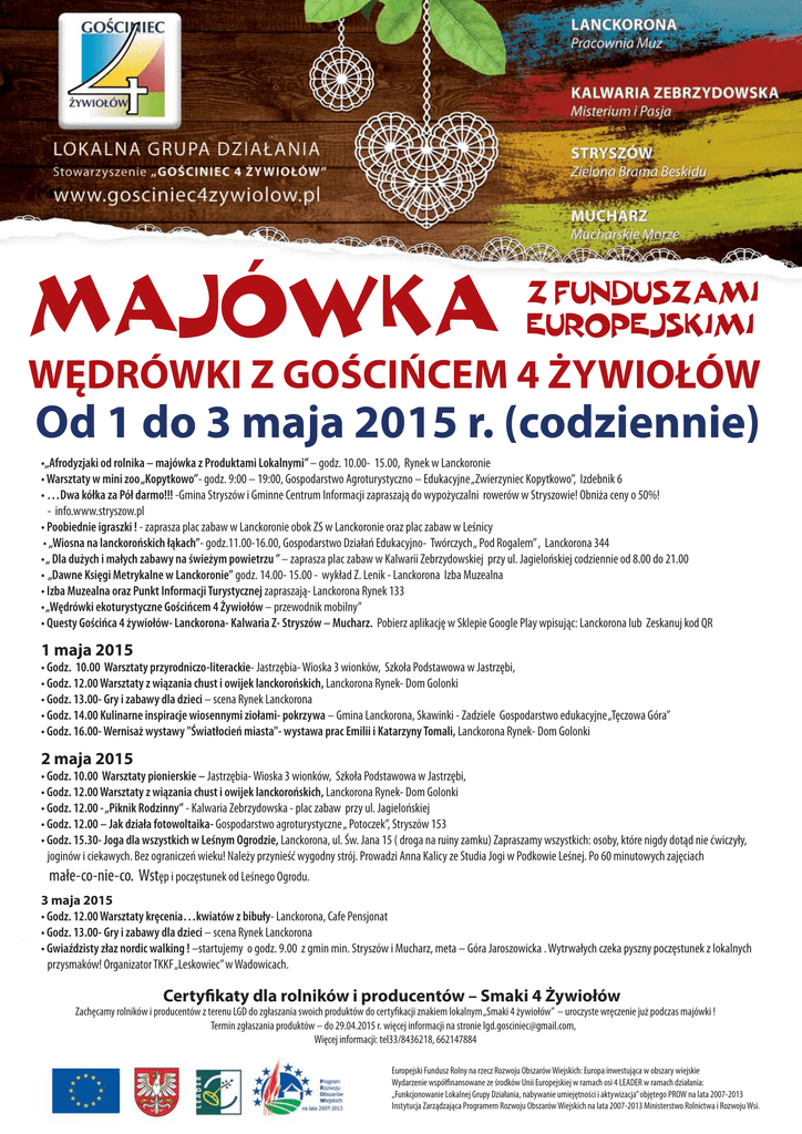 MAJÓWKA Z FUNDUSZAMI EUROPEJSKIMI WĘDRÓWKI Z GOŚCIŃCEM 4 ŻYWIOŁÓW Od 1 do 3 maja 2015 r. (codziennie) •„Afrodyzjaki od rolnika – majówka z Produktami Lokalnymi” – godz. 10.00- 15.00, Rynek w Lanckoronie • Warsztaty w mini zoo „Kopytkowo”- godz. 9:00 – 19:00, Gospodarstwo Agroturystyczno – Edukacyjne „Zwierzyniec Kopytkowo”, Izdebnik 6 • …Dwa kółka za Pół darmo!!! -Gmina Stryszów i Gminne Centrum Informacji zapraszają do wypożyczalni rowerów w Stryszowie! Obniża ceny o 50%! - info.www.stryszow.pl • Poobiednie igraszki ! - zaprasza plac zabaw w Lanckoronie obok ZS w Lanckoronie oraz plac zabaw w Leśnicy • „Wiosna na lanckorońskich łąkach”- godz.11.00-16.00, Gospodarstwo Działań Edukacyjno- Twórczych „ Pod Rogalem” , Lanckorona 344 • „ Dla dużych i małych zabawy na świeżym powietrzu ” – zaprasza plac zabaw w Kalwarii Zebrzydowskiej przy ul. Jagielońskiej codziennie od 8.00 do 21.00 • „Dawne Księgi Metrykalne w Lanckoronie” godz. 14.00- 15.00 - wykład Z. Lenik - Lanckorona Izba Muzealna • Izba Muzealna oraz Punkt Informacji Turystycznej zapraszają- Lanckorona Rynek 133 • „Wędrówki ekoturystyczne Gościńcem 4 Żywiołów – przewodnik mobilny” • Questy Gościńca 4 żywiołów- Lanckorona- Kalwaria Z- Stryszów – Mucharz. Pobierz aplikację w Sklepie Google Play wpisując: Lanckorona lub Zeskanuj kod QR 1 maja 2015 • Godz. 10.00 Warsztaty przyrodniczo-literackie- Jastrzębia- Wioska 3 wionków, Szkoła Podstawowa w Jastrzębi, • Godz. 12.00 Warsztaty z wiązania chust i owijek lanckorońskich, Lanckorona Rynek- Dom Golonki • Godz. 13.00- Gry i zabawy dla dzieci – scena Rynek Lanckorona • Godz. 14.00 Kulinarne inspiracje wiosennymi ziołami- pokrzywa – Gmina Lanckorona, Skawinki - Zadziele Gospodarstwo edukacyjne „Tęczowa Góra” • Godz. 16.00- Wernisaż wystawy "Światłocień miasta"- wystawa prac Emilii i Katarzyny Tomali, Lanckorona Rynek- Dom Golonki 2 maja 2015 • Godz. 10.00 Warsztaty pionierskie – Jastrzębia- Wioska 3 wionków, Szkoła Podstawowa w Jastrzębi, • Godz. 12.00 Warsztaty z wiązania chust i owijek lanckorońskich, Lanckorona Rynek- Dom Golonki • Godz. 12.00 - „Piknik Rodzinny” - Kalwaria Zebrzydowska - plac zabaw przy ul. Jagielońskiej • Godz. 12.00 – Jak działa fotowoltaika- Gospodarstwo agroturystyczne „ Potoczek”, Stryszów 153 • Godz. 15.30- Joga dla wszystkich w Leśnym Ogrodzie, Lanckorona, ul. Św. Jana 15 ( droga na ruiny zamku) Zapraszamy wszystkich: osoby, które nigdy dotąd nie ćwiczyły, joginów i ciekawych. Bez ograniczeń wieku! Należy przynieść wygodny strój. Prowadzi Anna Kalicy ze Studia Jogi w Podkowie Leśnej. Po 60 minutowych zajęciach małe-co-nie-co. Wstęp i poczęstunek od Leśnego Ogrodu. 3 maja 2015 • Godz. 12.00 Warsztaty kręcenia…kwiatów z bibuły- Lanckorona, Cafe Pensjonat • Godz. 13.00- Gry i zabawy dla dzieci – scena Rynek Lanckorona • Gwiaździsty złaz nordic walking ! –startujemy o godz. 9.00 z gmin min. Stryszów i Mucharz, meta – Góra Jaroszowicka . Wytrwałych czeka pyszny poczęstunek z lokalnych przysmaków! Organizator TKKF „Leskowiec” w Wadowicach. Certyfikaty dla rolników i producentów – Smaki 4 Żywiołów Zachęcamy rolników i producentów z terenu LGD do zgłaszania swoich produktów do certyfikacji znakiem lokalnym „Smaki 4 żywiołów” – uroczyste wręczenie już podczas majówki ! Termin zgłaszania produktów – do 29.04.2015 r. więcej informacji na stronie [email protected], Więcej informacji: tel33/8436218, 662147884 Europejski Fundusz Rolny na rzecz Rozwoju Obszarów Wiejskich: Europa inwestująca w obszary wiejskie Wydarzenie współfinansowane ze środków Unii Europejskiej w ramach osi 4 LEADER w ramach działania: „Funkcjonowanie Lokalnej Grupy Działania, nabywanie umiejętności i aktywizacja” objętego PROW na lata 2007-2013 Instytucja Zarządzająca Programem Rozwoju Obszarów Wiejskich na lata 2007-2013 Ministerstwo Rolnictwa i Rozwoju Wsi.