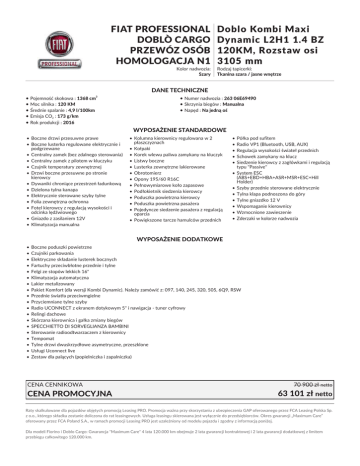 FIAT PROFESSIONAL DOBLÒ CARGO PRZEWÓZ OSÓB HOMOLOGACJA N1 Kolor nadwozia: Szary Doblo Kombi Maxi Dynamic L2H1 1.4 BZ 120KM, Rozstaw osi 3105 mm Rodzaj tapicerki: Tkanina szara / jasne wnętrze DANE TECHNICZNE • Pojemność skokowa : 1368 cm • Moc silnika : 120 KM • Średnie spalanie : 4,9 l/100km • Emisja CO2 : 173 g/km • Rok produkcji : 2016 3 • Numer nadwozia : 263 06E69490 • Skrzynia biegów : Manualna • Napęd : Na jedną oś WYPOSAŻENIE STANDARDOWE • Boczne drzwi przesuwne prawe • Boczne lusterka regulowane elektrycznie i podgrzewane • Centralny zamek (bez zdalnego sterowania) • Centralny zamek z pilotem w kluczyku • Czujnik temperatury zewnętrznej • Drzwi boczne przesuwne po stronie kierowcy • Dywaniki chroniące przestrzeń ładunkową • Dzielona tylna kanapa • Elektrycznie sterowane szyby tylne • Folia zewnętrzna ochronna • Fotel kierowcy z regulacją wysokości i odcinka lędźwiowego • Gniazdo z zasilaniem 12V • Klimatyzacja manualna • Kolumna kierownicy regulowana w 2 płaszczyznach • Kołpaki • Korek wlewu paliwa zamykany na kluczyk • Listwy boczne • Lusterka zewnętrzne lakierowane • Obrotomierz • Opony 195/60 R16C • Pełnowymiarowe koło zapasowe • Podłokietnik siedzenia kierowcy • Poduszka powietrzna kierowcy • Poduszka powietrzna pasażera • Pojedyncze siedzenie pasażera z regulacją oparcia • Powiększone tarcze hamulców przednich • • • • • • • • • • • • Półka pod sufitem Radio VP1 (Bluetooth, USB, AUX) Regulacja wysokości świateł przednich Schowek zamykany na klucz Siedzenie kierowcy z zagłówkami i regulacją typu "Passive" System ESC (ABS+EBD+HBA+ASR+MSR+ESC+Hill Holder) Szyby przednie sterowane elektrycznie Tylna klapa podnoszona do góry Tylne gniazdko 12 V Wspomaganie kierownicy Wzmocnione zawieszenie Zderzaki w kolorze nadwozia WYPOSAŻENIE DODATKOWE • • • • • • • • • • • • • • • • • • • Boczne poduszki powietrzne Czujniki parkowania Elektryczne składanie lusterek bocznych Fartuchy przeciwbłotne przednie i tylne Felgi ze stopów lekkich 16" Klimatyzacja automatyczna Lakier metalizowany Pakiet Komfort (dla wersji Kombi Dynamic). Należy zamówić z: 097, 140, 245, 320, 505, 6Q9, RSW Przednie światła przeciwmgielne Przyciemniane tylne szyby Radio UCONNECT z ekranem dotykowym 5" i nawigacja - tuner cyfrowy Relingi dachowe Skórzana kierownica i gałka zmiany biegów SPECCHIETTO DI SORVEGLIANZA BAMBINI Sterowanie radioodtwarzaczem z kierownicy Tempomat Tylne drzwi dwuskrzydłowe asymetryczne, przeszklone Usługi Uconnect live Zestaw dla palących (popielniczka i zapalniczka) CENA CENNIKOWA CENA PROMOCYJNA 70 900 zł netto 63 101 zł netto Raty skalkulowane dla pojazdów objętych promocją Leasing PRO. Promocja ważna przy skorzystaniu z ubezpieczenia GAP oferowanego przez FCA Leasing Polska Sp. z o.o., którego składka zostanie doliczona do rat leasingowych. Usługa leasingu skierowana jest wyłącznie do przedsiębiorców. Okres gwarancji „Maximum Care” oferowany przez FCA Poland S.A., w ramach promocji Leasing PRO jest uzależniony od modelu pojazdu i zgodny z informacją poniżej. Dla modeli Fiorino i Doblo Cargo: Gwarancja "Maximum Care" 4 lata 120.000 km obejmuje 2 lata gwarancji kontraktowej i 2 lata gwarancji dodatkowej z limitem przebiegu całkowitego 120.000 km. Dla modeli Talento i Ducato: Gwarancja "Maximum Care" 4 lata 160.000 km obejmuje 2 lata gwarancji kontraktowej i 2 lata gwarancji dodatkowej z limitem przebiegu całkowitego 160.000 km. Dla modelu Fullback: Gwarancja "Maximum Care" 5 lat 150.000 km obejmuje 3 lata gwarancji kontraktowej i 2 lata gwarancji dodatkowej z limitem przebiegu całkowitego 150.000 km. Oferta dotyczy samochodów z rocznika produkcji 2016. Ilość samochodów ograniczona. Niniejsze ogłoszenie jest wyłącznie informacją handlową i nie stanowi oferty w myśl art. 66, § 1. Kodeksu Cywilnego. Sprzedający nie odpowiada za ewentualne błędy lub nieaktualność ogłoszenia.