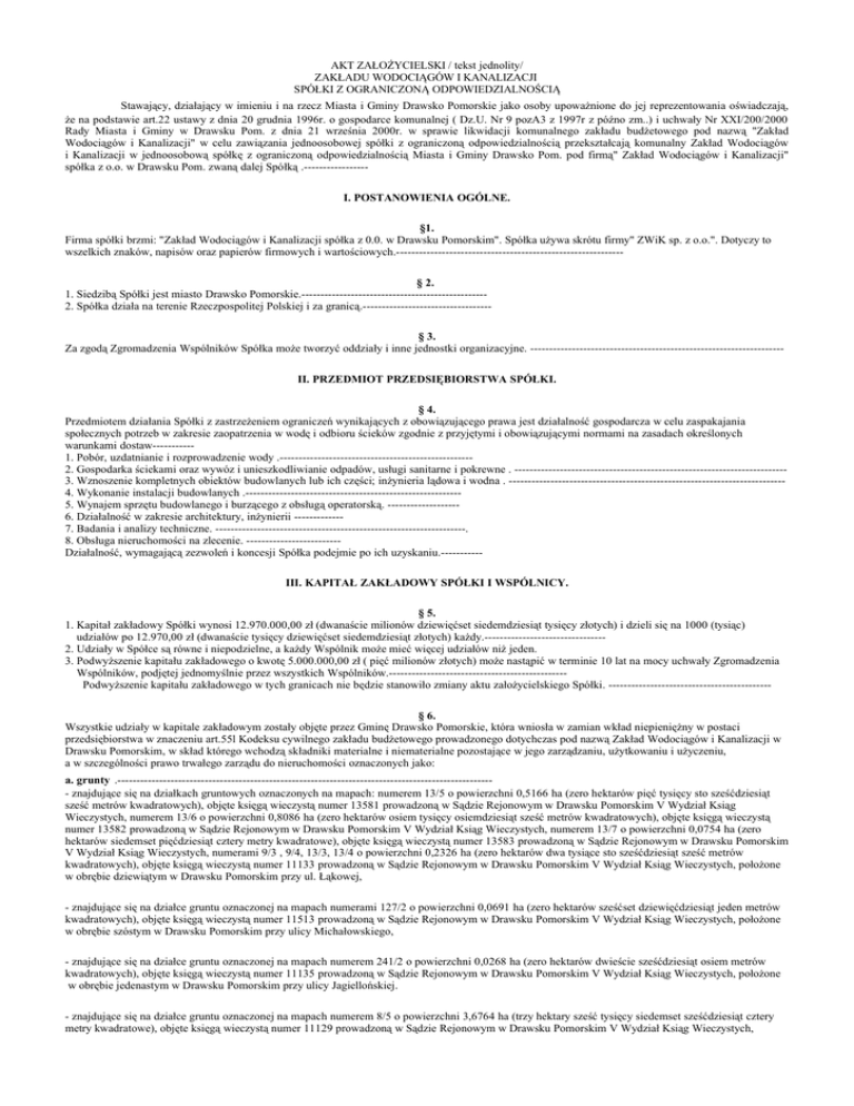 AKT ZAŁOŻYCIELSKI / tekst jednolity/ ZAKŁADU WODOCIĄGÓW I KANALIZACJI SPÓŁKI Z OGRANICZONĄ ODPOWIEDZIALNOŚCIĄ Stawający, działający w imieniu i na rzecz Miasta i Gminy Drawsko Pomorskie jako osoby upoważnione do jej reprezentowania oświadczają, że na podstawie art.22 ustawy z dnia 20 grudnia 1996r. o gospodarce komunalnej ( Dz.U. Nr 9 pozA3 z 1997r z późno zm..) i uchwały Nr XXI/200/2000 Rady Miasta i Gminy w Drawsku Pom. z dnia 21 września 2000r. w sprawie likwidacji komunalnego zakładu budżetowego pod nazwą "Zakład Wodociągów i Kanalizacji" w celu zawiązania jednoosobowej spółki z ograniczoną odpowiedzialnością przekształcają komunalny Zakład Wodociągów i Kanalizacji w jednoosobową spółkę z ograniczoną odpowiedzialnością Miasta i Gminy Drawsko Pom. pod firmą" Zakład Wodociągów i Kanalizacji" spółka z o.o. w Drawsku Pom. zwaną dalej Spółką .----------------I. POSTANOWIENIA OGÓLNE. §1. Firma spółki brzmi: "Zakład Wodociągów i Kanalizacji spółka z 0.0. w Drawsku Pomorskim". Spółka używa skrótu firmy" ZWiK sp. z o.o.". Dotyczy to wszelkich znaków, napisów oraz papierów firmowych i wartościowych.-----------------------------------------------------------§ 2. 1. Siedzibą Spółki jest miasto Drawsko Pomorskie.------------------------------------------------2. Spółka działa na terenie Rzeczpospolitej Polskiej i za granicą.---------------------------------§ 3. Za zgodą Zgromadzenia Wspólników Spółka może tworzyć oddziały i inne jednostki organizacyjne. ------------------------------------------------------------------II. PRZEDMIOT PRZEDSIĘBIORSTWA SPÓŁKI. § 4. Przedmiotem działania Spółki z zastrzeżeniem ograniczeń wynikających z obowiązującego prawa jest działalność gospodarcza w celu zaspakajania społecznych potrzeb w zakresie zaopatrzenia w wodę i odbioru ścieków zgodnie z przyjętymi i obowiązującymi normami na zasadach określonych warunkami dostaw----------1. Pobór, uzdatnianie i rozprowadzenie wody .--------------------------------------------------2. Gospodarka ściekami oraz wywóz i unieszkodliwianie odpadów, usługi sanitarne i pokrewne . -----------------------------------------------------------------------3. Wznoszenie kompletnych obiektów budowlanych lub ich części; inżynieria lądowa i wodna . ------------------------------------------------------------------------4. Wykonanie instalacji budowlanych .--------------------------------------------------------5. Wynajem sprzętu budowlanego i burzącego z obsługą operatorską. ------------------6. Działalność w zakresie architektury, inżynierii ------------7. Badania i analizy techniczne. ------------------------------------------------------------------. 8. Obsługa nieruchomości na zlecenie. ------------------------Działalność, wymagającą zezwoleń i koncesji Spółka podejmie po ich uzyskaniu.----------III. KAPITAŁ ZAKŁADOWY SPÓŁKI I WSPÓLNICY. § 5. 1. Kapitał zakładowy Spółki wynosi 12.970.000,00 zł (dwanaście milionów dziewięćset siedemdziesiąt tysięcy złotych) i dzieli się na 1000 (tysiąc) udziałów po 12.970,00 zł (dwanaście tysięcy dziewięćset siedemdziesiąt złotych) każdy.-------------------------------2. Udziały w Spółce są równe i niepodzielne, a każdy Wspólnik może mieć więcej udziałów niż jeden. 3. Podwyższenie kapitału zakładowego o kwotę 5.000.000,00 zł ( pięć milionów złotych) może nastąpić w terminie 10 lat na mocy uchwały Zgromadzenia Wspólników, podjętej jednomyślnie przez wszystkich Wspólników.----------------------------------------------Podwyższenie kapitału zakładowego w tych granicach nie będzie stanowiło zmiany aktu założycielskiego Spółki. ------------------------------------------§ 6. Wszystkie udziały w kapitale zakładowym zostały objęte przez Gminę Drawsko Pomorskie, która wniosła w zamian wkład niepieniężny w postaci przedsiębiorstwa w znaczeniu art.55l Kodeksu cywilnego zakładu budżetowego prowadzonego dotychczas pod nazwą Zakład Wodociągów i Kanalizacji w Drawsku Pomorskim, w skład którego wchodzą składniki materialne i niematerialne pozostające w jego zarządzaniu, użytkowaniu i użyczeniu, a w szczególności prawo trwałego zarządu do nieruchomości oznaczonych jako: a. grunty .--------------------------------------------------------------------------------------------------- znajdujące się na działkach gruntowych oznaczonych na mapach: numerem 13/5 o powierzchni 0,5166 ha (zero hektarów pięć tysięcy sto sześćdziesiąt sześć metrów kwadratowych), objęte księgą wieczystą numer 13581 prowadzoną w Sądzie Rejonowym w Drawsku Pomorskim V Wydział Ksiąg Wieczystych, numerem 13/6 o powierzchni 0,8086 ha (zero hektarów osiem tysięcy osiemdziesiąt sześć metrów kwadratowych), objęte księgą wieczystą numer 13582 prowadzoną w Sądzie Rejonowym w Drawsku Pomorskim V Wydział Ksiąg Wieczystych, numerem 13/7 o powierzchni 0,0754 ha (zero hektarów siedemset pięćdziesiąt cztery metry kwadratowe), objęte księgą wieczystą numer 13583 prowadzoną w Sądzie Rejonowym w Drawsku Pomorskim V Wydział Ksiąg Wieczystych, numerami 9/3 , 9/4, 13/3, 13/4 o powierzchni 0,2326 ha (zero hektarów dwa tysiące sto sześćdziesiąt sześć metrów kwadratowych), objęte księgą wieczystą numer 11133 prowadzoną w Sądzie Rejonowym w Drawsku Pomorskim V Wydział Ksiąg Wieczystych, położone w obrębie dziewiątym w Drawsku Pomorskim przy ul. Łąkowej, - znajdujące się na działce gruntu oznaczonej na mapach numerami 127/2 o powierzchni 0,0691 ha (zero hektarów sześćset dziewięćdziesiąt jeden metrów kwadratowych), objęte księgą wieczystą numer 11513 prowadzoną w Sądzie Rejonowym w Drawsku Pomorskim V Wydział Ksiąg Wieczystych, położone w obrębie szóstym w Drawsku Pomorskim przy ulicy Michałowskiego, - znajdujące się na działce gruntu oznaczonej na