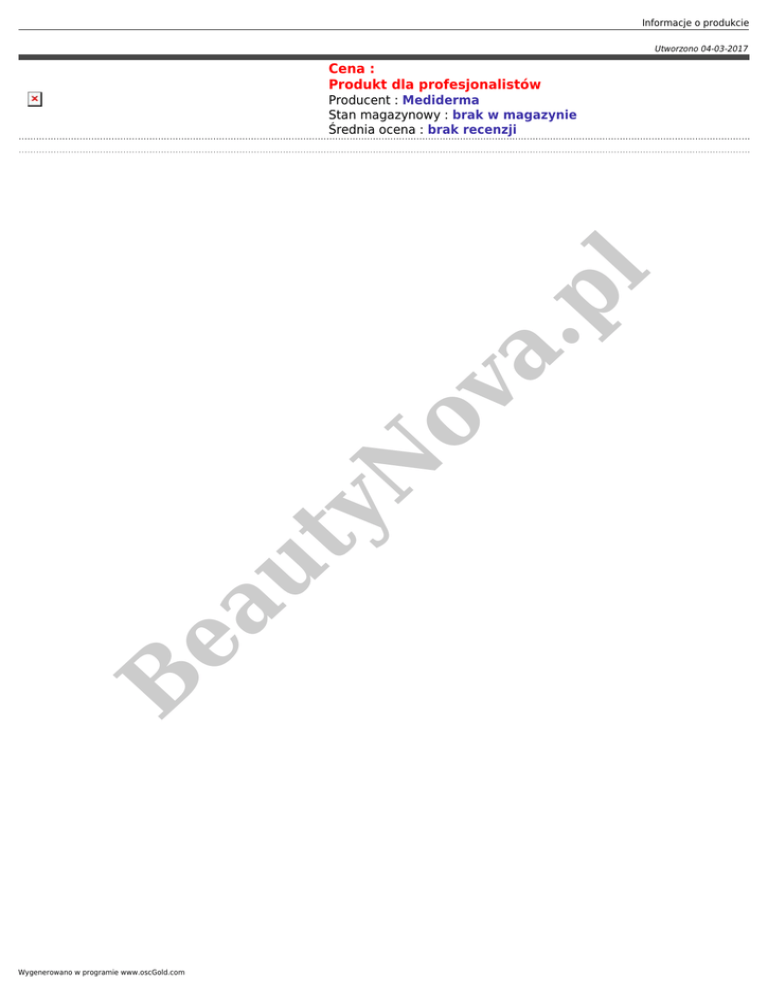 Informacje o produkcie Utworzono 04-03-2017 Cena : Produkt dla profesjonalistów B ea ut yN ov a. pl Producent : Mediderma Stan magazynowy : brak w magazynie Średnia ocena : brak recenzji Wygenerowano w programie www.oscGold.com