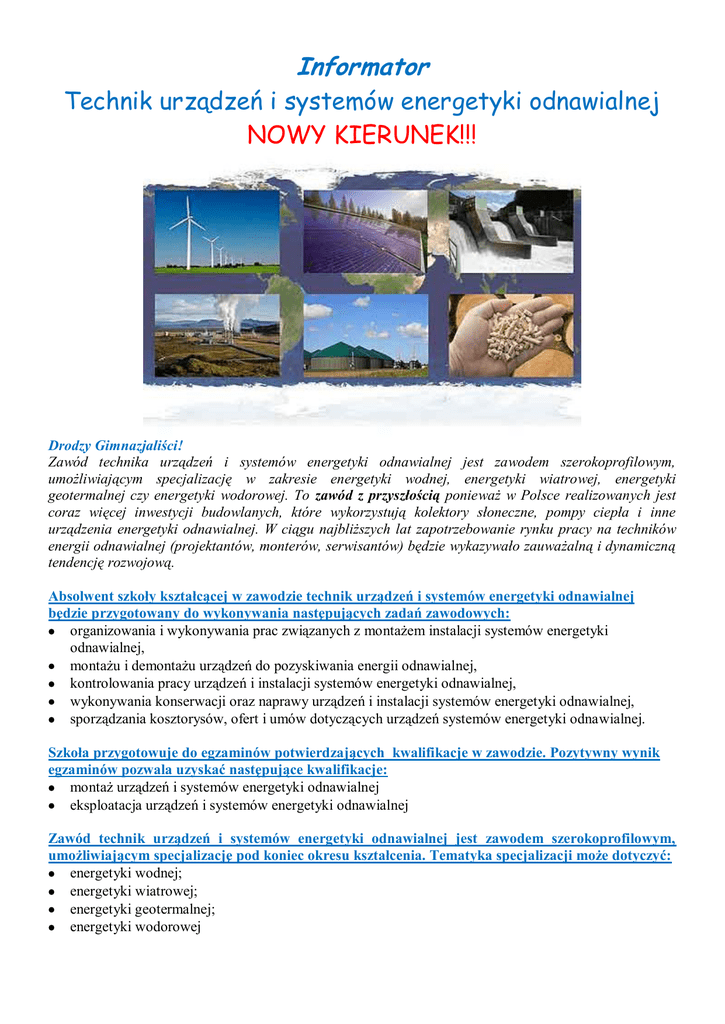 Informator Technik urządzeń i systemów energetyki odnawialnej NOWY KIERUNEK!!! Drodzy Gimnazjaliści! Zawód technika urządzeń i systemów energetyki odnawialnej jest zawodem szerokoprofilowym, umożliwiającym specjalizację w zakresie energetyki wodnej, energetyki wiatrowej, energetyki geotermalnej czy energetyki wodorowej. To zawód z przyszłością ponieważ w Polsce realizowanych jest coraz więcej inwestycji budowlanych, które wykorzystują kolektory słoneczne, pompy ciepła i inne urządzenia energetyki odnawialnej. W ciągu najbliższych lat zapotrzebowanie rynku pracy na techników energii odnawialnej (projektantów, monterów, serwisantów) będzie wykazywało zauważalną i dynamiczną tendencję rozwojową. Absolwent szkoły kształcącej w zawodzie technik urządzeń i systemów energetyki odnawialnej będzie przygotowany do wykonywania następujących zadań zawodowych: organizowania i wykonywania prac związanych z montażem instalacji systemów energetyki odnawialnej, montażu i demontażu urządzeń do pozyskiwania energii odnawialnej, kontrolowania pracy urządzeń i instalacji systemów energetyki odnawialnej, wykonywania konserwacji oraz naprawy urządzeń i instalacji systemów energetyki odnawialnej, sporządzania kosztorysów, ofert i umów dotyczących urządzeń systemów energetyki odnawialnej. Szkoła przygotowuje do egzaminów potwierdzających kwalifikacje w zawodzie. Pozytywny wynik egzaminów pozwala uzyskać następujące kwalifikacje: montaż urządzeń i systemów energetyki odnawialnej eksploatacja urządzeń i systemów energetyki odnawialnej Zawód technik urządzeń i systemów energetyki odnawialnej jest zawodem szerokoprofilowym, umożliwiającym specjalizację pod koniec okresu kształcenia. Tematyka specjalizacji może dotyczyć: energetyki wodnej; energetyki wiatrowej; energetyki geotermalnej; energetyki wodorowej REALIZACJA PROGRAMU NAUCZANIA Nauka w naszej szkole odbywać się będzie z wykorzystaniem pomocy dydaktycznych, programów komputerowych do projektowania, kosztorysowania, grafiki komputerowej, w trakcie wycieczek dydaktycznych i lekcji terenowych, we współpracy z firmami specjalizującymi się w projektowaniu, wykonawstwie i dystrybucji systemów i urządzeń energetyki odnawialnej oraz wyższymi uczelniami technicznymi. Przedmioty zawodowe realizowane w 4-letnim cyklu kształcenia: Podstawy energetyki, Prawo budowlane, Technologia, Systemy energetyki odnawialnej, Instalacje budowlane, Mechanika płynów, Elektrotechnika, Język obcy zawodowy, Pracownia instalacji budowlanych, Pracownia systemów energetyki odnawialnej, Pracownia elektrotechniki i elektroniki, Pracownia dokumentacji technicznej, Praktyka zawodowa. Przedmioty realizowane w trybie rozszerzonym to: geografia i informatyka. PERSPEKTYWY ZATRUDNIENIA Absolwenci mogą znaleźć zatrudnienie w: firmach zajmujących się projektowaniem i montażem kotłowni ekologicznych, w przedsiębiorstwach i firmach zajmujących się instalacją i produkcją kolektorów słonecznych, ogniw fotowoltaicznych, pomp ciepła, pieców na biomasę i urządzeń energetyki odnawialnej, w serwisach w/w urządzeń, w firmach dystrybutorskich i doradczych zajmujących się urządzeniami odnawialnych źródeł energii, w centrach ekologicznych systemów grzewczych, hurtowniach instalatorstwa sanitarnego, w przedsiębiorstwach zajmujących się przepisami prawa i normami dotyczącymi ochrony środowiska, w ramach własnej działalności gospodarczej. KONTYNUACJA KSZTAŁCENIA Energetyka odnawialna znalazła się na liście dziedzin kluczowych dla rozwoju gospodarki w ramach rządowego programu kierunków zamawialnych co daje naszym potencjalnym absolwentom perspektywę kontynuowania nauki. Absolwent może kontynuować naukę na każdej wyższej uczelni np. Politechnice lub Akademii Rolniczej. Zapraszamy!!!