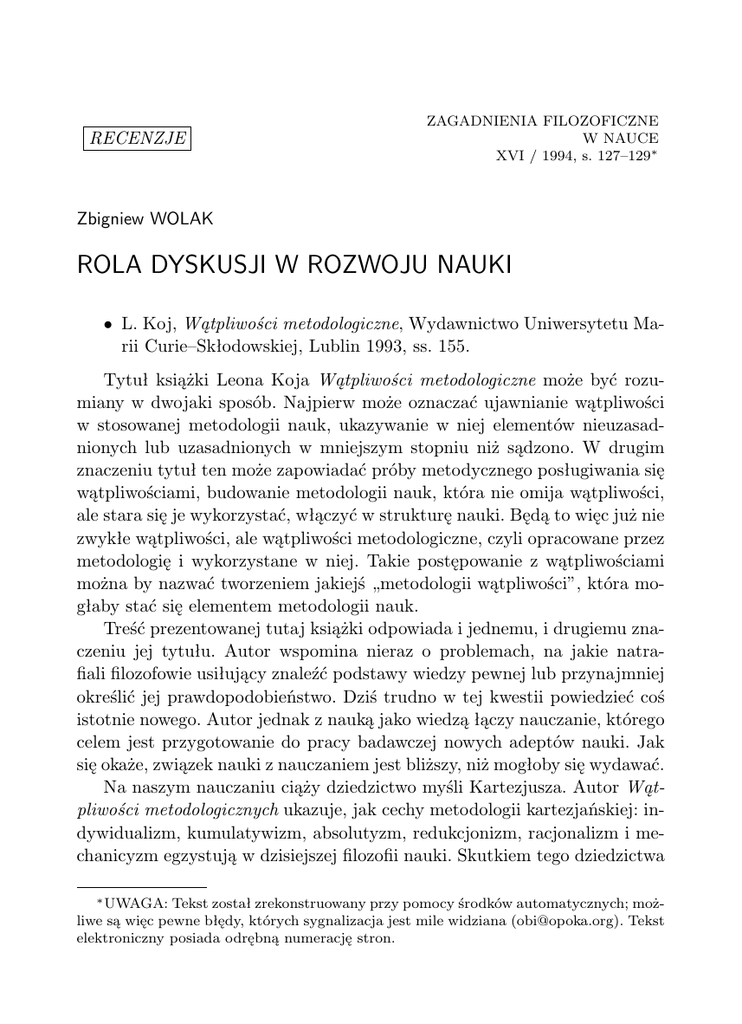 RECENZJE ZAGADNIENIA FILOZOFICZNE W NAUCE XVI / 1994, s. 127–129∗ Zbigniew WOLAK ROLA DYSKUSJI W ROZWOJU NAUKI • L. Koj, Wątpliwości metodologiczne, Wydawnictwo Uniwersytetu Marii Curie–Skłodowskiej, Lublin 1993, ss. 155. Tytuł książki Leona Koja Wątpliwości metodologiczne może być rozumiany w dwojaki sposób. Najpierw może oznaczać ujawnianie wątpliwości w stosowanej metodologii nauk, ukazywanie w niej elementów nieuzasadnionych lub uzasadnionych w mniejszym stopniu niż sądzono. W drugim znaczeniu tytuł ten może zapowiadać próby metodycznego posługiwania się wątpliwościami, budowanie metodologii nauk, która nie omija wątpliwości, ale stara się je wykorzystać, włączyć w strukturę nauki. Będą to więc już nie zwykłe wątpliwości, ale wątpliwości metodologiczne, czyli opracowane przez metodologię i wykorzystane w niej. Takie postępowanie z wątpliwościami można by nazwać tworzeniem jakiejś „metodologii wątpliwości”, która mogłaby stać się elementem metodologii nauk. Treść prezentowanej tutaj książki odpowiada i jednemu, i drugiemu znaczeniu jej tytułu. Autor wspomina nieraz o problemach, na jakie natrafiali filozofowie usiłujący znaleźć podstawy wiedzy pewnej lub przynajmniej określić jej prawdopodobieństwo. Dziś trudno w tej kwestii powiedzieć coś istotnie nowego. Autor jednak z nauką jako wiedzą łączy nauczanie, którego celem jest przygotowanie do pracy badawczej nowych adeptów nauki. Jak się okaże, związek nauki z nauczaniem jest bliższy, niż mogłoby się wydawać. Na naszym nauczaniu ciąży dziedzictwo myśli Kartezjusza. Autor Wątpliwości metodologicznych ukazuje, jak cechy metodologii kartezjańskiej: indywidualizm, kumulatywizm, absolutyzm, redukcjonizm, racjonalizm i mechanicyzm egzystują w dzisiejszej filozofii nauki. Skutkiem tego dziedzictwa ∗ UWAGA: Tekst został zrekonstruowany przy pomocy środków automatycznych; możliwe są więc pewne błędy, których sygnalizacja jest mile widziana ([email protected]). Tekst elektroniczny posiada odrębną numerację stron. 2 Zbigniew WOLAK kartezjanizmu jest też sposób nauczania polegający na zapamiętywaniu odkrytych już prawd i opanowaniu metod, prowadzących niezawodnie do odkrywania prawd nowych. Przy takiej metodzie nauczania nie jest wskazane poznawanie poglądów dyskusyjnych, sprzecznych z podręcznikowymi. W ten sposób zarysowuje się pewien paradoks: nauczanie przebiega w ten sposób, jakby istniała wiedza pewna i metoda pozwalająca taką wiedzę zyskiwać, a filozofia nauki stwierdza, że taka wiedza nie istnieje i istnieć nie może. Trzeba więc poprawić metodologię nauki lub nauczania, lub obie równocześnie. Autor proponuje wspólną koncepcję nauczania i nauki, która pozwoli zlikwidować ten paradoks, można by tę koncepcję nazwać „dyskusyjną”. Według niej rozwój nauki jest w większym stopniu efektem wymiany poglądów różnych uczonych, racjonalnych dyskusji pomiędzy nimi niż wynikiem sumowania indywidualnych osiągnięć. Podstawą takiej koncepcji postępu poznania naukowego jest najpierw wielokrotnie stwierdzana niemożliwość ufundowania naszego poznania na jakichś nielicznych, nieobalalnych składnikach tego poznania, które mogłyby stanowić trwały fundament nauki. Uczony więc znajduje się w sytuacji tego poety, który pisze, że to, co budował na skale i piasku, zawaliło się, teraz więc zacznie budować od dymu z komina (L. Staff). Okazuje się, że intuicja poety odkryła prawdę, do której doszła również racjonalna filozofia. Na dymie też można budować, byle było go wystarczająco dużo. Profesor Koj twierdzi, że pewność naszego poznania można ufundować na wielkiej liczbie zmieniających się przekonań, które — jak się okazuje — mimo tej zmienności najczęściej uzasadniają te same teorie: „to tak, jak gdyby nasze poznanie ogólnie opierało się nie na stabilnych i nielicznych twierdzeniach, jakby na słupach mocno wbitych w grunt, ale na chwiejnym, rozległym i grubym kożuchu roślin porastających moczary niewiedzy”. Teoretyczne podstawy dla takiej koncepcji nauki daje pierwszy artykuł zamieszczony w książce O zasadności przekonań. Autor wyróżnia przekonania spontaniczne i refleksyjne i uzasadnia słuszność redukcji przekonań refleksyjnych do spontanicznych, które są podstawą wszelkiego poznania. Nie są podstawą niezmienną, gdyż przekonania te możemy zmieniać, jeśli mamy ku temu słuszne powody. Rozważanie tych powodów sprawia jednak, że wtedy przechodzimy na poziom przekonań refleksyjnych, które nadal oparte są na spontanicznych. ROLA DYSKUSJI W ROZWOJU NAUKI 3 Spontaniczność tych wyjściowych przekonań wiąże się z tym, że nie mamy kryterium oceny ich prawdziwości, co więcej, z góry zakładamy, że niektóre z nich mogą być mylne. W jaki sposób możemy więc zwiększyć pewność poznania opartego na tak niepewnych podstawach? Odpowiedź jest prosta: trzeba zadbać o to, by tych przekonań spontanicznych, na których funduje się poznanie naukowe, było jak najwięcej. Stanie się tak wtedy, gdy wielu uczonych w dobrych, porządnie prowadzonych dyskusjach będzie wymieniać swoje przekonania. Dyskutować w ten sposób nie jest łatwo, dlatego autor Wątpliwości metodologicznych w kilku artykułach wyjaśnia zasady racjonalnej dyskusji i wyraża przekonanie, że tej ważnej umiejętności dyskutowania trzeba uczyć w szkołach i na uczelniach. W ostatnim artykule zamieszczonym w książce znajdujemy przyczynek do dyskusji pewnej kwestii naukowej. Zawiera on mianowicie ocenę metodologiczną testu C 14, a został, jak pisze autor, spowodowany irytacją, wywołaną wyraźnie niedbale wykonanymi czynnościami badawczymi i partactwem metodologicznym, związanym z testowaniem wieku Całunu Turyńskiego. Okazuje się bowiem, że w badaniu wieku tego całunu całkowicie przemilczano podstawową przesłankę. Ujawnien