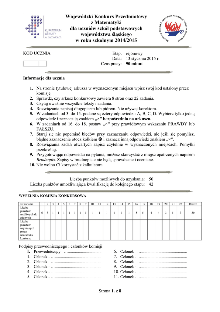 Wojewódzki Konkurs Przedmiotowy z Matematyki dla uczniów szkół podstawowych województwa śląskiego w roku szkolnym 2014/2015 KOD UCZNIA Etap: rejonowy Data: 13 stycznia 2015 r. Czas pracy: 90 minut Informacje dla ucznia 1. Na stronie tytułowej arkusza w wyznaczonym miejscu wpisz swój kod ustalony przez komisję. 2. Sprawdź, czy arkusz konkursowy zawiera 8 stron oraz 22 zadania. 3. Czytaj uważnie wszystkie teksty i zadania. 4. Rozwiązania zapisuj długopisem lub piórem. Nie używaj korektora. 5. W zadaniach od 3. do 15. podane są cztery odpowiedzi: A, B, C, D. Wybierz tylko jedną odpowiedź i zaznacz ją znakiem „×” bezpośrednio na arkuszu. 6. W zadaniach od 16. do 18. postaw „×” przy prawidłowym wskazaniu PRAWDY lub FAŁSZU. 7. Staraj się nie popełniać błędów przy zaznaczaniu odpowiedzi, ale jeśli się pomylisz, błędne zaznaczenie otocz kółkiem i zaznacz inną odpowiedź znakiem „×”. 8. Rozwiązania zadań otwartych zapisz czytelnie w wyznaczonych miejscach. Pomyłki przekreślaj. 9. Przygotowując odpowiedzi na pytania, możesz skorzystać z miejsc opatrzonych napisem Brudnopis. Zapisy w brudnopisie nie będą sprawdzane i oceniane. 10. Nie wolno Ci korzystać z kalkulatora. Liczba punktów możliwych do uzyskania: 50 Liczba punktów umożliwiająca kwalifikację do kolejnego etapu: 42 WYPEŁNIA KOMISJA KONKURSOWA Nr zadania Liczba punktów możliwych do zdobycia Liczba punktów uzyskanych przez uczestnika konkursu 1 2 3 4 5 6 7 8 9 10 11 12 13 14 15 16 17 18 19 20 21 22 Razem 6 3 1 1 1 1 1 1 1 1 1 1 1 1 1 5 5 4 4 3 4 3 50 Podpisy przewodniczącego i członków komisji: I. Przewodniczący - …................................. 1. Członek - …............................................. 2. Członek - …............................................. 3. Członek - …............................................. 4. Członek - …............................................. 5. Członek - …............................................. 6. Członek - …............................................. 7. Członek - …............................................. 8. Członek - …............................................. 9. Członek - …............................................. 10. Członek - …............................................. 11. Członek - …............................................. Strona 1. z 8 Zadanie 1. (0-6) W puste białe pola „liczbowej krzyżówki” wstaw liczby tak, aby wszystkie działania i równości były poprawne. . _ 1 + 6 + 40 : = _ 4 _ 4 20 = 10 + . = _ _ 2 _ . 3 + 2 = = = _ = . . = + 2 12 + + : . _ _ _ _ 3 _ . + 3 2 30 = = + Zadanie 2. (0-3) W poniższych wyrażeniach wstaw nawiasy tak, aby otrzymać równości: A) 100 · 2 – 1 · 9 – 8 = 100 100 · 2 – 1 · 9 – 8 = 199 C) 100 · 2 – 1 · 9 – 8 = – 1500 B) W zadaniach od 3. do 15. tylko jedna odpowiedź jest poprawna. Zadanie 3. (0-1) Jakie największe pole może mieć prostokąt o obwodzie 14 i bokach, których długości są liczbami naturalnymi? A. 49 B. 48 C. 12 D. 10 Zadanie 4. (0-1) Dwanaście kilogramów gruszek kosztuje 30 zł. Ile kg gruszek można kupić za 62,50 zł? A. 15 B. 20 C. 25 D. 30 Strona 2. z 8 Zadanie 5. (0-1) Na zbiórce pewnej drużyny harcerskiej było nieobecnych 6 uczniów, co 2 stanowiło wszystkich członków tej drużyny. Z tego wynika, że 9 drużyna ta liczy A. 54 uczniów. B. 27 uczniów. C. 18 uczniów. D. 36 uczniów. Zadanie 6. (0-1) Chodnik ułożono z 1240 płytek o wymiarach 25 cm × 30 cm. Ile płytek o wymiarach 20 cm × 25 cm należałoby użyć aby ułożyć ten sam chodnik? A. 1860 B. 1680 C. 1420 D. 1806 Zadanie 7. (0-1) Platforma służąca do przewozu konstrukcji stalowych ma masę 15 ton, czyli A. 150 000 kg B. 1 500 000 dag C. 150 000 dag D. 150 000 000 g Zadanie 8. (0-1) Iloraz różnicy liczb 5 i 3 przez ich sumę jest równy A. 16 B. 1 8 C. 4 D. 1 4 Zadanie 9. (0-1) Samochód zużywa 16 litrów paliwa na każde 200 km drogi. Jaki najdłuższy odcinek drogi może przejechać ten samochód, mając w zbiorniku 20 litrów paliwa? A. 225 km B. 300 km C. 275 km D. 250 km Strona 3. z 8 BRUDNOPIS Zadanie 10. (0-1) Które zdanie jest fałszywe? A. kwadrat to taki romb, który ma wszystkie kąty proste B. kwadrat to taki prostokąt, który ma wszystkie boki równe C. kwadrat to taki równoległobok, który ma wszystkie boki równej długości D. kwadrat to taki równoległobok, w którym przekątne są tej samej długości i przecinają się pod kątem prostym Zadanie 11. (0-1) Ulica w pewnym mieście ma długość 0,3 km. Na planie miasta w skali 1:15000 ulica ta ma długość: A. 0,2 cm B. 0,2 dm C. 4,5 cm D. 2 dm Zadanie 12. (0-1) O ile centymetrów kwadratowych zwiększy się pole rombu o przekątnych 10 cm i 8 cm, jeżeli długość każdej przekątnej zwiększy się o 2 cm? A. o 40 cm² B. o 4 cm² C. o 20 cm² D. o 60 cm² Zadanie 13. (0-1) Która z poniższych liczb nie jest liczbą złożoną? A. 111111 B. 10101 C. 111 D. 101 Zadanie 14. (0-1) Bartek ma dokładnie dwa razy więcej pieniędzy niż jego kolega Leszek. Ile pieniędzy mogą mieć łącznie obaj koledzy? A. 35 zł B. 64 zł C. 10 zł D. 21 zł Zadanie 15. (0-1) km , dojeżdża do szkoły w ciągu h 15 minut. O ile szybciej musiałby jechać, aby czas jazdy do szkoły był o 5 minut krótszy? A. o 3 km/h B. o 4 km/h C. o 5 km/h D. o 6 km/h Janek, jadąc rowerem z prędkością 12 Strona 4. z 8 BRUDNOPIS W zadaniach od 16. Do 18. Oceń, czy podane zdania są prawdziwe czy fałszywe. Zaznacz właściwą odpowiedź. Zadanie 16. (0-5) I. II. Liczba 14 – 15 + 16 – 17 + 18 – 19 jest ujemna. Liczba 2015 · 2014 – 2014 · 2013 jest PRAWDA FAŁSZ PRAWDA FAŁSZ PRAWDA FAŁSZ PRAWDA FAŁSZ PRAWDA FAŁSZ dodatnia. III. IV. V. Liczba 1234 – 5678 + 4444 jest równa zero. 1 Liczba 3 − 3 ⋅ 2 jest liczbą naturalną. 3 Liczba 2 2 − 4 2 + 5 2 − 3 2 jest liczbą naturalną podzielną przez 2 2 . Zadanie 17. (0-5) Długość 1