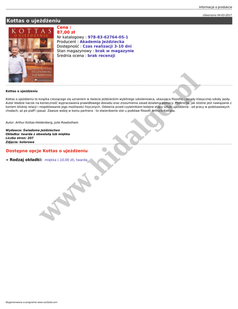 Informacje o produkcie Utworzono 04-03-2017 Kottas o ujeżdżeniu Cena : 87,00 zł l Nr katalogowy : 978-83-62764-05-1 Producent : Akademia Jeździecka Dostępność : Czas realizacji 3-10 dni Stan magazynowy : brak w magazynie Średnia ocena : brak recenzji .p Kottas o ujeżdżeniu al go Kottas o ujeżdżeniu to książka cieszącego się uznaniem w świecie jeździeckim wybitnego szkoleniowca, ukazująca filozofię i zasady klasycznej szkoły jazdy. Autor kładzie nacisk na konieczność wypracowania prawidłowego dosiadu oraz zrozumienia zasad działania pomocy. Podkreśla, jak istotne jest nawiązanie z koniem bliskiej relacji i respektowanie jego możliwości fizycznych. Odsłania przed czytelnikiem kolejne etapy sztuki ujeżdżenia - od pracy w podstawowych chodach, aż po piaff i pasaż. Zawsze widzę w koniu partnera - to stwierdzenie stoi u podstaw filozofii Arthura Kottasa. Autor: Arthur Kottas-Heldenberg, Julie Rowbotham Dostępne opcje Kottas o ujeżdżeniu id Wydawca: Świadome Jeździectwo Okładka: twarda z obwolutą lub miękka Liczba stron: 207 Zdjęcia: kolorowe w w w .h » Rodzaj okładki: miękka (-10,00 zł), twarda. Wygenerowano w programie www.oscGold.com