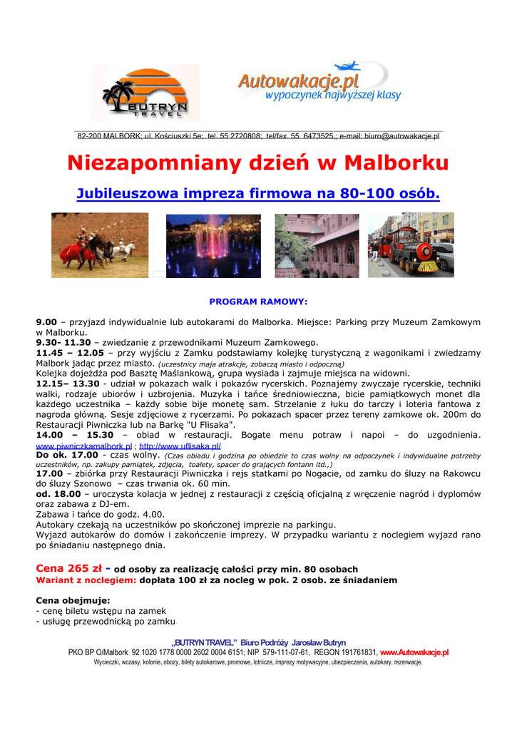 _________________________________________________________________________________________________ 82-200 MALBORK; ul. Kościuszki 5e; tel. 55 2720808; tel/fax. 55 6473525,; e-mail: [email protected] Niezapomniany dzień w Malborku Jubileuszowa impreza firmowa na 80-100 osób. PROGRAM RAMOWY: 9.00 – przyjazd indywidualnie lub autokarami do Malborka. Miejsce: Parking przy Muzeum Zamkowym w Malborku. 9.30- 11.30 – zwiedzanie z przewodnikami Muzeum Zamkowego. 11.45 – 12.05 – przy wyjściu z Zamku podstawiamy kolejkę turystyczną z wagonikami i zwiedzamy Malbork jadąc przez miasto. (uczestnicy maja atrakcje, zobaczą miasto i odpoczną) Kolejka dojeżdża pod Basztę Maślankową, grupa wysiada i zajmuje miejsca na widowni. 12.15– 13.30 - udział w pokazach walk i pokazów rycerskich. Poznajemy zwyczaje rycerskie, techniki walki, rodzaje ubiorów i uzbrojenia. Muzyka i tańce średniowieczna, bicie pamiątkowych monet dla każdego uczestnika – każdy sobie bije monetę sam. Strzelanie z łuku do tarczy i loteria fantowa z nagroda główną. Sesje zdjęciowe z rycerzami. Po pokazach spacer przez tereny zamkowe ok. 200m do Restauracji Piwniczka lub na Barkę "U Flisaka". 14.00 – 15.30 – obiad w restauracji. Bogate menu potraw i napoi – do uzgodnienia. www.piwniczkamalbork.pl ; http://www.uflisaka.pl/ Do ok. 17.00 - czas wolny. (Czas obiadu i godzina po obiedzie to czas wolny na odpoczynek i indywidualne potrzeby uczestników, np. zakupy pamiątek, zdjęcia, toalety, spacer do grających fontann itd.,) 17.00 – zbiórka przy Restauracji Piwniczka i rejs statkami po Nogacie, od zamku do śluzy na Rakowcu do śluzy Szonowo – czas trwania ok. 60 min. od. 18.00 – uroczysta kolacja w jednej z restauracji z częścią oficjalną z wręczenie nagród i dyplomów oraz zabawa z DJ-em. Zabawa i tańce do godz. 4.00. Autokary czekają na uczestników po skończonej imprezie na parkingu. Wyjazd autokarów do domów i zakończenie imprezy. W przypadku wariantu z noclegiem wyjazd rano po śniadaniu następnego dnia. Cena 265 zł - od osoby za realizację całości przy min. 80 osobach Wariant z noclegiem: dopłata 100 zł za nocleg w pok. 2 osob. ze śniadaniem Cena obejmuje: - cenę biletu wstępu na zamek - usługę przewodnicką po zamku „BUTRYN TRAVEL” Biuro Podróży Jarosław Butryn PKO BP O/Malbork 92 1020 1778 0000 2602 0004 6151; NIP 579-111-07-61, REGON 191761831, www.Autowakacje.pl Wycieczki, wczasy, kolonie, obozy, bilety autokarowe, promowe, lotnicze, imprezy motywacyjne, ubezpieczenia, autokary, rezerwacje. _________________________________________________________________________________________________ 82-200 MALBORK; ul. Kościuszki 5e; tel. 55 2720808; tel/fax. 55 6473525,; e-mail: [email protected] - przejażdżkę kolejką turystyczną - rejs statkiem po Nogacie - obiad dwudaniowy w restauracji koło zamku - pokaz walk rycerskich przy Baszcie Maślankowej obok Zamku - bicie pamiątkowej monety w czasie pokazów walk - uroczysta kolacja z daniami na ciepło i zakąskami, napoje oraz powitalny drink wraz z dyskoteką i znanym DJ-em - opiekę przedstawicieli biura przez cały czas imprezy - podatek vat „BUTRYN TRAVEL” Biuro Podróży Jarosław Butryn PKO BP O/Malbork 92 1020 1778 0000 2602 0004 6151; NIP 579-111-07-61, REGON 191761831, www.Autowakacje.pl Wycieczki, wczasy, kolonie, obozy, bilety autokarowe, promowe, lotnicze, imprezy motywacyjne, ubezpieczenia, autokary, rezerwacje.