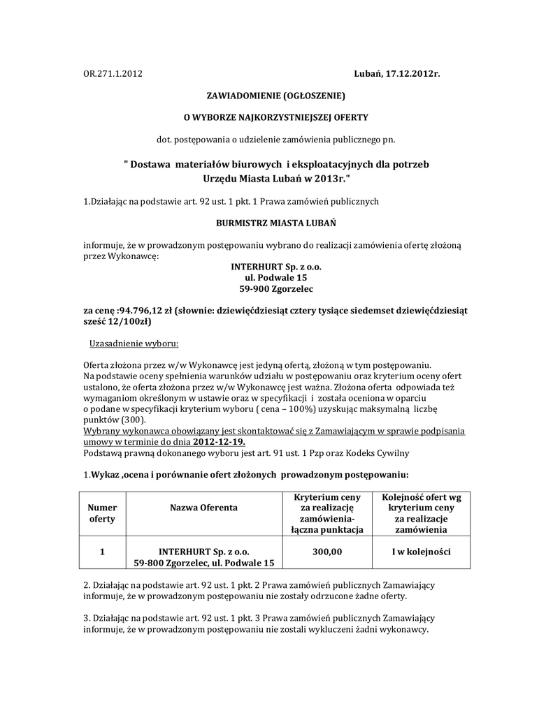 Ogłoszenie o wyborze najkorzystniejszej oferty Ogłoszenie o