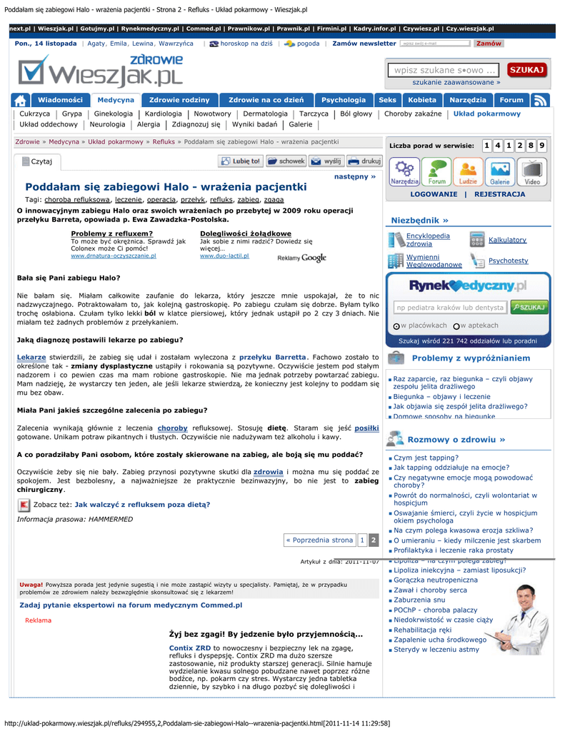 Poddałam się zabiegowi Halo - wrażenia pacjentki - Strona 2 - Refluks - Układ pokarmowy - Wieszjak.pl next.pl | Wieszjak.pl | Gotujmy.pl | Rynekmedyczny.pl | Commed.pl | Prawnikow.pl | Prawnik.pl | Firmini.pl | Kadry.infor.pl | Czywiesz.pl | Czy.wieszjak.pl Pon., 14 listopada Agaty, Emila, Lewina, Wawrzyńca horoskop na dziś pogoda Zamów newsletter Zamów wpisz swój e-mail wpisz szukane s•owo ... szukanie zaawansowane » Wiadomości Cukrzyca Grypa Układ oddechowy Medycyna Ginekologia Neurologia Zdrowie rodziny Kardiologia Alergia Zdrowie na co dzień Nowotwory Zdiagnozuj się Dermatologia Wyniki badań Psychologia Tarczyca Seks Ból głowy Narzędzia Choroby zakaźne Forum Układ pokarmowy Galerie Zdrowie » Medycyna » Układ pokarmowy » Refluks » Poddałam się zabiegowi Halo - wrażenia pacjentki Czytaj Kobieta Liczba porad w serwisie: 1 4 1 2 8 9 następny » Poddałam się zabiegowi Halo - wrażenia pacjentki LOGOWANIE | Tagi: choroba refluksowa, leczenie, operacja, przełyk, refluks, zabieg, zgaga O innowacyjnym zabiegu Halo oraz swoich wrażeniach po przebytej w 2009 roku operacji przełyku Barreta, opowiada p. Ewa Zawadzka-Postolska. REJESTRACJA Niezbędnik » Problemy z refluxem? Dolegliwości żołądkowe Encyklopedia zdrowia Kalkulatory www.drnatura-oczyszczanie.pl www.duo-lactil.pl Wymienni Węglowodanowe Psychotesty To może być okrężnica. Sprawdź jak Colonex może Ci pomóc! Jak sobie z nimi radzić? Dowiedz się więcej… Bała się Pani zabiegu Halo? Nie bałam się. Miałam całkowite zaufanie do lekarza, który jeszcze mnie uspokajał, że to nic nadzwyczajnego. Potraktowałam to, jak kolejną gastroskopię. Po zabiegu czułam się dobrze. Byłam tylko trochę osłabiona. Czułam tylko lekki ból w klatce piersiowej, który jednak ustąpił po 2 czy 3 dniach. Nie miałam też żadnych problemów z przełykaniem. Jaką diagnozę postawili lekarze po zabiegu? np pediatra kraków lub dentysta w placówkach w aptekach Szukaj wśród 221 742 oddziałów lub poradni Lekarze stwierdzili, że zabieg się udał i zostałam wyleczona z przełyku Barretta. Fachowo zostało to określone tak - zmiany dysplastyczne ustąpiły i rokowania są pozytywne. Oczywiście jestem pod stałym nadzorem i co pewien czas ma mam robione gastroskopie. Nie ma jednak potrzeby powtarzać zabiegu. Mam nadzieję, że wystarczy ten jeden, ale jeśli lekarze stwierdzą, że konieczny jest kolejny to poddam się mu bez obaw. Miała Pani jakieś szczególne zalecenia po zabiegu? Zalecenia wynikają głównie z leczenia choroby refluksowej. Stosuję dietę. Staram się jeść posiłki gotowane. Unikam potraw pikantnych i tłustych. Oczywiście nie nadużywam też alkoholu i kawy. A co poradziłaby Pani osobom, które zostały skierowane na zabieg, ale boją się mu poddać? Oczywiście żeby się nie bały. Zabieg przynosi pozytywne skutki dla zdrowia i można mu się poddać ze spokojem. Jest bezbolesny, a najważniejsze że praktycznie bezinwazyjny, bo nie jest to zabieg chirurgiczny. Zobacz też: Jak walczyć z refluksem poza dietą? Informacja prasowa: HAMMERMED « Poprzednia strona 1 2 Artykuł z dnia: 2011-11-07 Uwaga! Powyższa porada jest jedynie sugestią i nie może zastąpić wizyty u specjalisty. Pamiętaj, że w przypadku problemów ze zdrowiem należy bezwzględnie skonsultować się z lekarzem! Zadaj pytanie ekspertowi na forum medycznym Commed.pl Reklama Żyj bez zgagi! By jedzenie było przyjemnością... Contix ZRD to nowoczesny i bezpieczny lek na zgagę, refluks i dyspepsję. Contix ZRD ma dużo szersze zastosowanie, niż produkty starszej generacji. Silnie hamuje wydzielanie kwasu solnego pobudzane nawet poprzez różne bodźce, np. pokarm czy stres. Wystarczy jedna tabletka dziennie, by szybko i na długo pozbyć się dolegliwości i http://uklad-pokarmowy.wieszjak.pl/refluks/294955,2,Poddalam-sie-zabiegowi-Halo--wrazenia-pacjentki.html[2011-11-14 11:29:58] Problemy z wypróżnianiem Raz zaparcie, raz biegunka – czyli objawy zespołu jelita drażliwego Biegunka – objawy i leczenie Jak objawia się zespół jelita drażliwego? Domowe sposoby na biegunkę Rozmowy o zdrowiu » Czym jest tapping? Jak tapping oddziałuje na emocje? Czy negatywne emocje mogą powodować choroby? Powrót do normalności, czyli wolontariat w hospicjum Oswajanie śmierci, czyli życie w hospicjum okiem psychologa Na czym polega kwasowa erozja szkliwa? O umieraniu – kiedy milczenie jest skarbem Profilaktyka i leczenie raka prostaty Lipoliza – na czym polega zabieg? Lipoliza iniekcyjna – zamiast liposukcji? Gorączka neutropeniczna Zawał i choroby serca Zaburzenia snu POChP - choroba palaczy Niedokrwistość w czasie ciąży Rehabilitacja ręki Zapalenie ucha środkowego Sterydy w leczeniu astmy