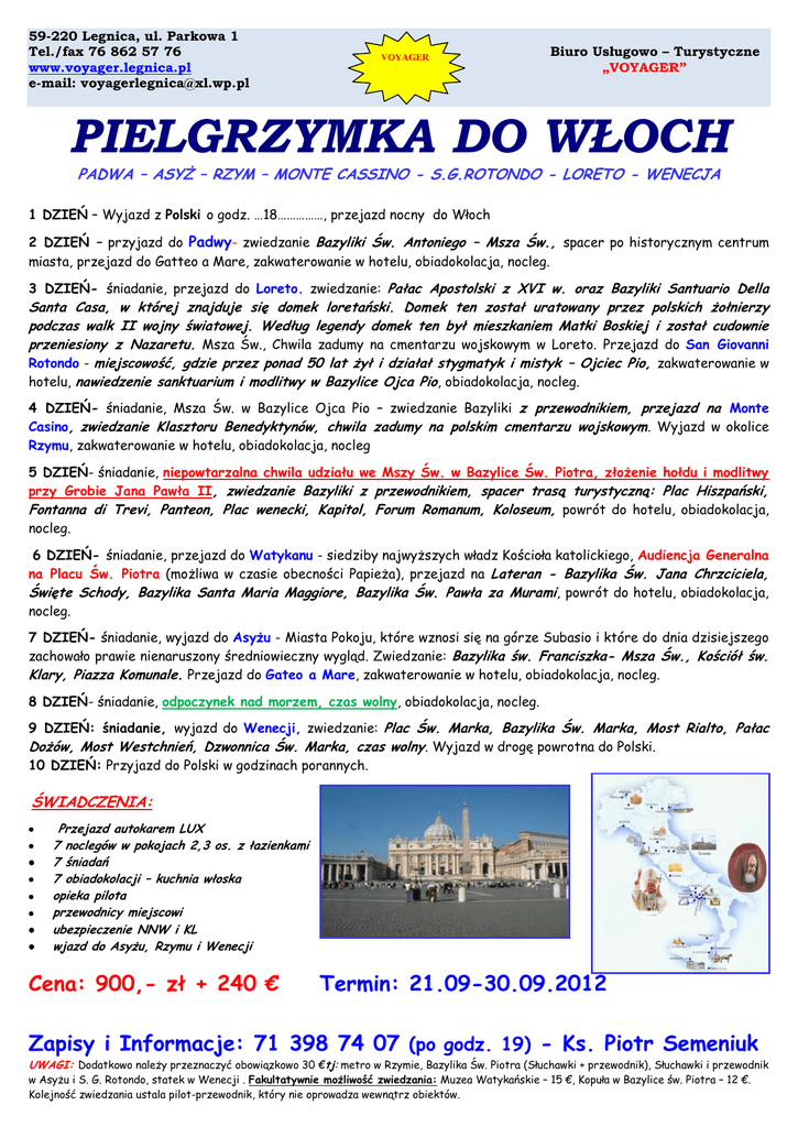 59-220 Legnica, ul. Parkowa 1 Tel./fax 76 862 57 76 www.voyager.legnica.pl e-mail: [email protected] VOYAGER Biuro Usługowo – Turystyczne „VOYAGER” PIELGRZYMKA DO WŁOCH PADWA – ASYŻ – RZYM – MONTE CASSINO - S.G.ROTONDO - LORETO - WENECJA 1 DZIEŃ – Wyjazd z Polski o godz. …18……………, przejazd nocny do Włoch 2 DZIEŃ – przyjazd do Padwy- zwiedzanie Bazyliki Św. Antoniego – Msza Św., spacer po historycznym centrum miasta, przejazd do Gatteo a Mare, zakwaterowanie w hotelu, obiadokolacja, nocleg. 3 DZIEŃ- śniadanie, przejazd do Loreto. zwiedzanie: Pałac Apostolski z XVI w. oraz Bazyliki Santuario Della Santa Casa, w której znajduje się domek loretański. Domek ten został uratowany przez polskich żołnierzy podczas walk II wojny światowej. Według legendy domek ten był mieszkaniem Matki Boskiej i został cudownie przeniesiony z Nazaretu. Msza Św., Chwila zadumy na cmentarzu wojskowym w Loreto. Przejazd do San Giovanni Rotondo - miejscowość, gdzie przez ponad 50 lat żył i działał stygmatyk i mistyk – Ojciec Pio, zakwaterowanie w hotelu, nawiedzenie sanktuarium i modlitwy w Bazylice Ojca Pio , obiadokolacja, nocleg. 4 DZIEŃ- śniadanie, Msza Św. w Bazylice Ojca Pio – zwiedzanie Bazyliki z przewodnikiem, przejazd na Monte Casino, zwiedzanie Klasztoru Benedyktynów, chwila zadumy na polskim cmentarzu wojskowym . Wyjazd w okolice Rzymu, zakwaterowanie w hotelu, obiadokolacja, nocleg 5 DZIEŃ- śniadanie, niepowtarzalna chwila udziału we Mszy Św. w Bazylice Św. Piotra, złożenie hołdu i modlitwy przy Grobie Jana Pawła II, zwiedzanie Bazyliki z przewodnikiem, spacer trasą turystyczną: Plac Hiszpański, Fontanna di Trevi, Panteon, Plac wenecki, Kapitol, Forum Romanum, Koloseum, powrót do hotelu, obiadokolacja, nocleg. 6 DZIEŃ- śniadanie, przejazd do Watykanu - siedziby najwyższych władz Kościoła katolickiego, Audiencja Generalna na Placu Św. Piotra (możliwa w czasie obecności Papieża), przejazd na Lateran - Bazylika Św. Jana Chrzciciela, Święte Schody, Bazylika Santa Maria Maggiore, Bazylika Św. Pawła za Murami , powrót do hotelu, obiadokolacja, nocleg. 7 DZIEŃ- śniadanie, wyjazd do Asyżu - Miasta Pokoju, które wznosi się na górze Subasio i które do dnia dzisiejszego zachowało prawie nienaruszony średniowieczny wygląd. Zwiedzanie: Bazylika św. Franciszka- Msza Św., Kościół św. Klary, Piazza Komunale. Przejazd do Gateo a Mare, zakwaterowanie w hotelu, obiadokolacja, nocleg. 8 DZIEŃ- śniadanie, odpoczynek nad morzem, czas wolny, obiadokolacja, nocleg. 9 DZIEŃ: śniadanie, wyjazd do Wenecji, zwiedzanie: Plac Św. Marka, Bazylika Św. Marka, Most Rialto, Pałac Dożów, Most Westchnień, Dzwonnica Św. Marka, czas wolny. Wyjazd w drogę powrotna do Polski. 10 DZIEŃ: Przyjazd do Polski w godzinach porannych. ŚWIADCZENIA: Przejazd autokarem LUX 7 noclegów w pokojach 2,3 os. z łazienkami 7 śniadań 7 obiadokolacji – kuchnia włoska opieka pilota przewodnicy miejscowi ubezpieczenie NNW i KL wjazd do Asyżu, Rzymu i Wenecji Cena: 900,- zł + 240 € Termin: 21.09-30.09.2012 Zapisy i Informacje: 71 398 74 07 (po godz. 19) - Ks. Piotr Semeniuk UWAGI: Dodatkowo należy przeznaczyć obowiązkowo 30 €tj: metro w Rzymie, Bazylika Św. Piotra (Słuchawki + przewodnik), Słuchawki i przewodnik w Asyżu i S. G. Rotondo, statek w Wenecji . Fakultatywnie możliwość zwiedzania: Muzea Watykańskie – 15 €, Kopuła w Bazylice św. Piotra – 12 €. Kolejność zwiedzania ustala pilot-przewodnik, który nie oprowadza wewnątrz obiektów.