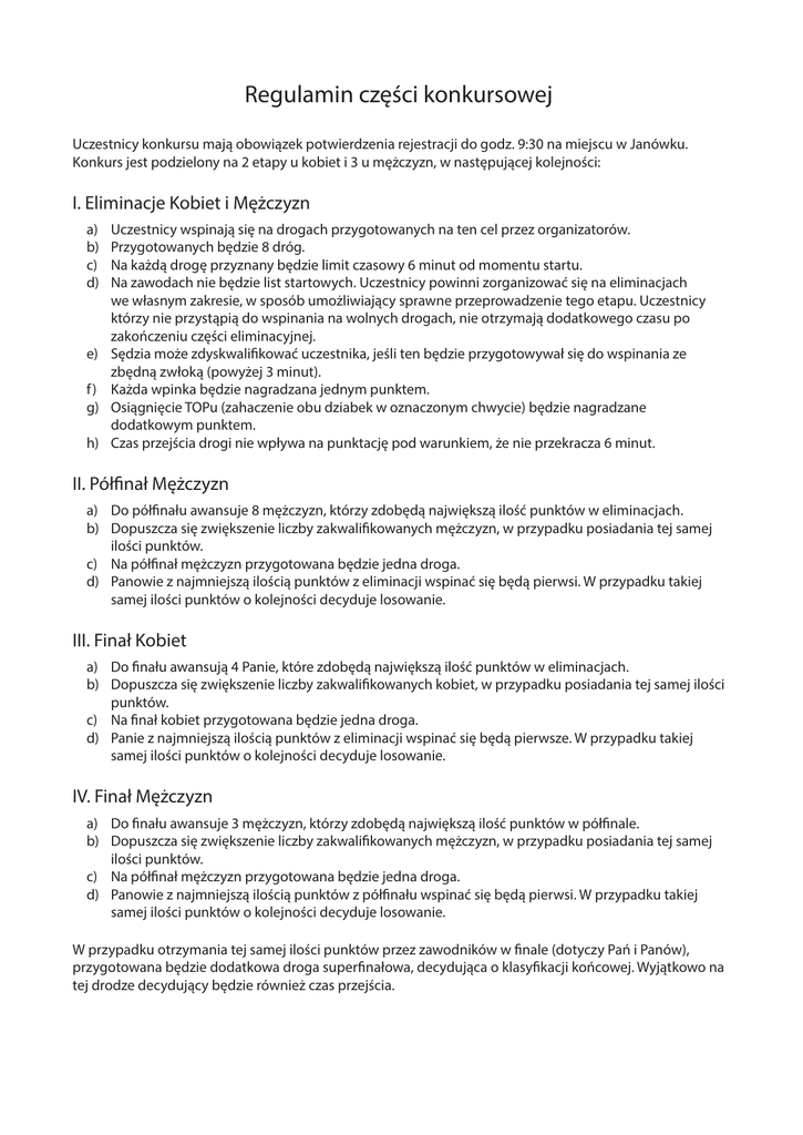 Regulamin części konkursowej Uczestnicy konkursu mają obowiązek potwierdzenia rejestracji do godz. 9:30 na miejscu w Janówku. Konkurs jest podzielony na 2 etapy u kobiet i 3 u mężczyzn, w następującej kolejności: I. Eliminacje Kobiet i Mężczyzn a) b) c) d) e) f ) g) h) Uczestnicy wspinają się na drogach przygotowanych na ten cel przez organizatorów. Przygotowanych będzie 8 dróg. Na każdą drogę przyznany będzie limit czasowy 6 minut od momentu startu. Na zawodach nie będzie list startowych. Uczestnicy powinni zorganizować się na eliminacjach we własnym zakresie, w sposób umożliwiający sprawne przeprowadzenie tego etapu. Uczestnicy którzy nie przystąpią do wspinania na wolnych drogach, nie otrzymają dodatkowego czasu po zakończeniu części eliminacyjnej. Sędzia może zdyskwalifikować uczestnika, jeśli ten będzie przygotowywał się do wspinania ze zbędną zwłoką (powyżej 3 minut). Każda wpinka będzie nagradzana jednym punktem. Osiągnięcie TOPu (zahaczenie obu dziabek w oznaczonym chwycie) będzie nagradzane dodatkowym punktem. Czas przejścia drogi nie wpływa na punktację pod warunkiem, że nie przekracza 6 minut. II. Półfinał Mężczyzn a) Do półfinału awansuje 8 mężczyzn, którzy zdobędą największą ilość punktów w eliminacjach. b) Dopuszcza się zwiększenie liczby zakwalifikowanych mężczyzn, w przypadku posiadania tej samej ilości punktów. c) Na półfinał mężczyzn przygotowana będzie jedna droga. d) Panowie z najmniejszą ilością punktów z eliminacji wspinać się będą pierwsi. W przypadku takiej samej ilości punktów o kolejności decyduje losowanie. III. Finał Kobiet a) Do finału awansują 4 Panie, które zdobędą największą ilość punktów w eliminacjach. b) Dopuszcza się zwiększenie liczby zakwalifikowanych kobiet, w przypadku posiadania tej samej ilości punktów. c) Na finał kobiet przygotowana będzie jedna droga. d) Panie z najmniejszą ilością punktów z eliminacji wspinać się będą pierwsze. W przypadku takiej samej ilości punktów o kolejności decyduje losowanie. IV. Finał Mężczyzn a) Do finału awansuje 3 mężczyzn, którzy zdobędą największą ilość punktów w półfinale. b) Dopuszcza się zwiększenie liczby zakwalifikowanych mężczyzn, w przypadku posiadania tej samej ilości punktów. c) Na półfinał mężczyzn przygotowana będzie jedna droga. d) Panowie z najmniejszą ilością punktów z półfinału wspinać się będą pierwsi. W przypadku takiej samej ilości punktów o kolejności decyduje losowanie. W przypadku otrzymania tej samej ilości punktów przez zawodników w finale (dotyczy Pań i Panów), przygotowana będzie dodatkowa droga superfinałowa, decydująca o klasyfikacji końcowej. Wyjątkowo na tej drodze decydujący będzie również czas przejścia. V. Dodatkowe zasady: a) Uczestnicy powinni dobrać osoby asekurujące spośród siebie. Organizator nie ponosi odpowiedzialności za kompetencje osób asekurujących oraz następstwa ewentualnych nieszczęśliwych wypadków. b) Po upływie limitu czasowego zawodnik ma obowiązek zjechać z drogi i bezzwłocznie zwolnić ją dla kolejnych zawodników. Wpinki uzyskane po przekroczeniu limitu czasowego nie zostają zaliczone. c) Bez zezwolenia sędziego zawodnikom nie wolno rozpoczynać wspinania. d) Każdy z zawodników ma 1 próbę przejścia każdej drogi. Dopuszcza się ponowny start, jeśli odpadnięcie nastąpiło zanim zawodnik wpiął się w pierwszy przelot na drodze. Czas przejścia jest liczony nieprzerwanie od momentu oderwania obu nóg z ziemi. e) Wymagane jest wspinanie się w rakach lub rakobutach. Zabrania się używania ostróg. f ) Wspinający i asekurujący muszą używać kasków wspinaczkowych. g) Zabrania się omijania wpinek. Ominięcie wpinki skutkuje natychmiastową dyskwalifikacją. h) Zabrania się używania czekanów z łopatkami. i) Zabrania się używania lonży oraz pętli nadgarstkowych. j) Sędzia może zdyskwalifikować uczestnika jeśli ten nie będzie przestrzegał zasad regulaminu. k) Dopuszcza się łapanie chwytów ręką oraz zahaczanie dziabki o dziabkę . l) Za odpadnięcia uważa się: Złapanie sztucznego zabezpieczenia drogi. ii) Obciążenie liny. iii) Dotknięcie dowolną częścią ciała lub ekwipunku miejsc znajdujących się poza wyznaczoną przez organizatorów drogą. iv) Zahaczenie dziaby w chwycie lub strefie oznaczonej na czerwono. m) W trakcie trwania konkursu nie ma ograniczeń co do obserwowania przejść innych zawodników. n) Kluczowe chwyty zostaną oznaczone na niebiesko na wybranych drogach. o) Do przejścia drogi zawodnicy maja obowiązek zgłaszać się w pełni wyekwipowani i powiązani liną. p) Drogi będą wyposażone w ekspresy. Organizatorzy dostarczą niezbędną ilość lin. Celem usprawnienia zawodnicy proszeni są o przyniesienie własnych lin. Wymagana długość to 30m. q) W sprawach nieuregulowanych decydują sędziowie a decydujący głos ma sędzia główny.