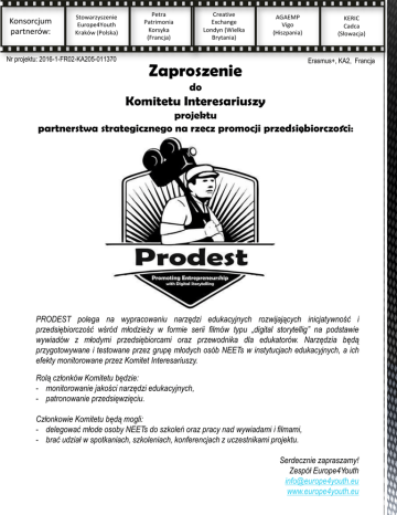 Konsorcjum partnerów: Stowarzyszenie Europe4Youth Kraków (Polska) Nr projektu: 2016-1-FR02-KA205-011370 Petra Patrimonia Korsyka (Francja) Creative Exchange Londyn (Wielka Brytania) AGAEMP Vigo (Hiszpania) KERIC Cadca (Słowacja) Erasmus+, KA2, Francja Zaproszenie do Komitetu Interesariuszy projektu partnerstwa strategicznego na rzecz promocji przedsiebiorczosci: PRODEST polega na wypracowaniu narzędzi edukacyjnych rozwijających inicjatywność i przedsiębiorczość wśród młodzieży w formie serii filmów typu „digital storytellig” na podstawie wywiadów z młodymi przedsiębiorcami oraz przewodnika dla edukatorów. Narzędzia będą przygotowywane i testowane przez grupę młodych osób NEETs w instytucjach edukacyjnych, a ich efekty monitorowane przez Komitet Interesariuszy. Rolą członków Komitetu będzie: - monitorowanie jakości narzędzi edukacyjnych, - patronowanie przedsięwzięciu. Członkowie Komitetu będą mogli: - delegować młode osoby NEETs do szkoleń oraz pracy nad wywiadami i filmami, - brać udział w spotkaniach, szkoleniach, konferencjach z uczestnikami projektu. Serdecznie zapraszamy! Zespół Europe4Youth [email protected] www.europe4youth.eu