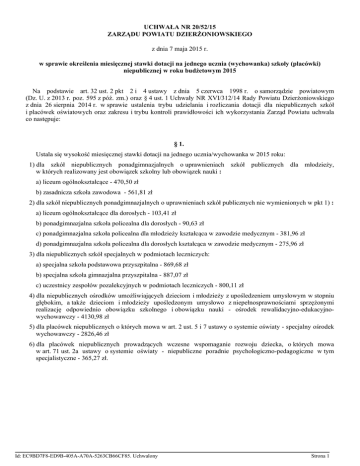 UCHWAŁA NR 20/52/15 ZARZĄDU POWIATU DZIERŻONIOWSKIEGO z dnia 7 maja 2015 r. w sprawie określenia miesięcznej stawki dotacji na jednego ucznia (wychowanka) szkoły (placówki) niepublicznej w roku budżetowym 2015 Na podstawie art. 32 ust. 2 pkt 2 i 4 ustawy z dnia 5 czerwca 1998 r. o samorządzie powiatowym (Dz. U. z 2013 r. poz. 595 z póź. zm.) oraz § 4 ust. 1 Uchwały NR XVI/312/14 Rady Powiatu Dzierżoniowskiego z dnia 26 sierpnia 2014 r. w sprawie ustalenia trybu udzielania i rozliczania dotacji dla niepublicznych szkół i placówek oświatowych oraz zakresu i trybu kontroli prawidłowości ich wykorzystania Zarząd Powiatu uchwala co następuje: § 1. Ustala się wysokość miesięcznej stawki dotacji na jednego ucznia/wychowanka w 2015 roku: 1) dla szkół niepublicznych ponadgimnazjalnych o uprawnieniach szkół publicznych dla młodzieży, w których realizowany jest obowiązek szkolny lub obowiązek nauki : a) liceum ogólnokształcące - 470,50 zł b) zasadnicza szkoła zawodowa - 561,81 zł 2) dla szkół niepublicznych ponadgimnazjalnych o uprawnieniach szkół publicznych nie wymienionych w pkt 1) : a) liceum ogólnokształcące dla dorosłych - 103,41 zł b) ponadgimnazjalna szkoła policealna dla dorosłych - 90,63 zł c) ponadgimnazjalna szkoła policealna dla młodzieży kształcąca w zawodzie medycznym - 381,96 zł d) ponadgimnazjalna szkoła policealna dla dorosłych kształcąca w zawodzie medycznym - 275,96 zł 3) dla niepublicznych szkół specjalnych w podmiotach leczniczych: a) specjalna szkoła podstawowa przyszpitalna - 869,68 zł b) specjalna szkoła gimnazjalna przyszpitalna - 887,07 zł c) uczestnicy zespołów pozalekcyjnych w podmiotach leczniczych - 800,11 zł 4) dla niepublicznych ośrodków umożliwiających dzieciom i młodzieży z upośledzeniem umysłowym w stopniu głębokim, a także dzieciom i młodzieży upośledzonym umysłowo z niepełnosprawnościami sprzężonymi realizację odpowiednio obowiązku szkolnego i obowiązku nauki - ośrodek rewalidacyjno-edukacyjnowychowawczy - 4130,98 zł 5) dla placówek niepublicznych o których mowa w art. 2 ust. 5 i 7 ustawy o systemie oświaty - specjalny ośrodek wychowawczy - 2826,46 zł 6) dla placówek niepublicznych prowadzących wczesne wspomaganie rozwoju dziecka, o których mowa w art. 71 ust. 2a ustawy o systemie oświaty - niepubliczne poradnie psychologiczno-pedagogiczne w tym specjalistyczne - 365,27 zł. Id: EC9BD7F8-ED9B-405A-A70A-5263CB66CF85. Uchwalony Strona 1 § 2. Uchwała wchodzi w życie z dniem podjęcia z mocą obowiązującą od 1 stycznia 2015 r. Starosta Dzierżoniowski Janusz Guzdek Wicestarosta Marek Piorun Członek Zarządu Powiatu Jarosław Tyniec Id: EC9BD7F8-ED9B-405A-A70A-5263CB66CF85. Uchwalony Strona 2 UZASADNIENIE Minister Finansów w pismie z dnia 12.02.2015 r. znak: DWST.WSST.356.2812.2015 określił ostateczną wysokość oświatową subwencji ogólnej dla Powiatu Dzierżoniowskiego, tym samym zostały spełnione warunki do określenia stawek dotacji dla szkół i placówek wymienionych w uchwale. W bieżącym roku dotowane są: 1) Szkoły niepubliczne o uprawnieniach szkół publicznych: a) Niepubliczna Szkoła Podstawowa przy Sudeckim Centrum Zdrowia w Pieszycach b) Niepubliczne Gimnazjum przy Sudeckim Centrum Zdrowia w Pieszycach c) Niepubliczne Liceum Ogólnokształcące w Bielawie. d) Szkoła Wielozawodowa w Bielawie e) Prywatna Średnia Szkoła Zawodowa Policealna w Bielawie f) Prywatne Liceum Ogólnokształcące dla Dorosłych w Bielawie g) Zasadnicza Szkoła Zawodowa Cechu Rzemiosł Różnych i Małej Przedsiębiorczości w Bielawie h) Prywatne Liceum Ogólnokształcące dla Dorosłych w Dzierżoniowie i) Prywatne Studium Higienistek Stomatologicznych w Dzierżoniowie j) Prywatna Szkoła Policealna dla Dorosłych "Twoja Szkoła" w Dzierżoniowie k) Prywatne Liceum Ogólnokształcące dla Dorosłych "Twoja Szkoła" w Dzierżoniowie l) Policealna Szkoła w Dzierżoniowie 2) Placówka niepubliczna prowadząca działalność rewalidacyjno-wychowawczą dla dzieci i młodzieży z upośledzeniem umysłowym w stopniu głębokim lub z upośledzeniem umysłowym i niepełnosprawnościami sprzężonymi – Ośrodek Rehabilitacyjno-Edukacyjno-Wychowawczy w Dzierżoniowie. 3) Specjalny ośrodek wychowawczy dla dzieci i młodzieży wymagających stosowania specjalnej organizacji nauki, metod pracy i wychowania - Specjalny Ośrodek Wychowawczy, prowadzony przez Zgromadzenie Sióstr Augustianek w Bielawie. 4) Placówki niepubliczne prowadzące wczesne wspomaganie rozwoju dziecka: a) Niepubliczna Poradnia Psychologiczno-Pedagogiczna A. Salij-Szyszka w Bielawie b) Niepubliczna Specjalistyczna Poradnia Psychologiczno-Pedagogiczna Promyk Słońca w Uciechowie c) Centrum Wspomagania Rozwoju Niepubliczna Poradnia Psychologiczno-Pedagogiczna K. Ciostek w Dzierżoniowie. Wysokość stawek dotacji udzielonych z budżetu Powiatu Dzierżoniowskiego w 2015 r. dla szkół i placówek niepublicznych zostały ustalone w oparciu o dane określone w metryczce subwencji oświatowej, w uchwale Nr 19/44/15 Zarządu Powiatu Dzierżoniowskiego z dnia 30.04.2015 r. w sprawie ustalenia wartości bazowego bonu edukacyjnego na ucznia i wartości wyrównawczego bonu edukacyjnego w 2015 roku oraz na podstawie informacji o wydatkach bieżących ponoszonych przez inne powiaty prowadzące szkoły tego samego typu i rodzaju. Kalkulacja stawek dotacji dla poszczególnych szkół i placówek niepublicznych: 1. Podstawą ustalenia wysokości dotacji dla szkół, o których mowa w § 1 pkt 1) lit. a, b jest kwota przewidziana na każdego ucznia w wysokości nie niższej niż kwota przewidziana na jednego ucznia danego typu i rodzaju szkoły w części oświatowej subwencji ogólnej otrzymywanej przez Id: EC9BD7F8-ED9B-405A-A70A-5263CB66CF85. Uchwalony Strona 1 powiat oraz liczba uczniów w szkole. 2. Podstawą ustalenia wysokości dotacji dla szkół, o których mowa w § 1 pkt 2) lit. a, b są wydatki b