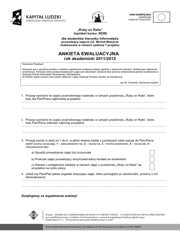 „Ruby on Rails” (symbol kursu: ROR) dla studentów kierunku Informatyka prowadzący zajęcia inż. Michał Makaruk realizowane w ramach zadania 7 projektu ANKIETA EWALUACYJNA rok akademicki 2011/2012 Szanowni Państwo! Zwracam się z uprzejmą prośbą o rzetelne wypełnienie niniejszej ankiety zgodnie z własnymi ocenami. Ankieta jest całkowicie anonimowa. Państwa ocena przeprowadzonych zajęć jest warunkiem skuteczności procesu doskonalenia jakości kształcenia w Wyższej Szkole Informatyki Stosowanej i Zarządzania. W imieniu władz Uczelni oraz swoim własnym z góry dziękuję Państwu bardzo za współpracę. Jan W. Owsiński, kierownik projektu 1. Proszę wymienić te części przerobionego materiału w ramach przedmiotu „Ruby on Rails”, które były dla Pani/Pana najbardziej przydatne: .................................................................................................................................................................................................................. .................................................................................................................................................................................................................. 2. Proszę wymienić te części przerobionego materiału w ramach przedmiotu „Ruby on Rails”, które były Pani/Pana zdaniem najmniej przydatne .................................................................................................................................................................................................................. .................................................................................................................................................................................................................. 3. Proszę ocenić w skali od 1 do 5, w jakim stopniu każde z poniższych zdań pasuje do Pani/Pana opinii (oceny oznaczają: 1 – zdecydowanie nie, 2 – raczej nie, 3 – trudno powiedzieć, 4 – raczej tak, 5 – zdecydowanie tak) a) Sposób prowadzenia zajęć był zrozumiały b) Podczas zajęć prowadzący utrzymywał dobry kontakt ze studentami c) Wiedza i umiejętności zdobyte w ramach zajęć z przedmiotu „Ruby on Rails” są przydatne na rynku pracy 4. Jeżeli ma Pani/Pan jakieś sugestie dotyczące zajęć, które pomogłyby je udoskonalić, prosimy o ich sformułowanie: .................................................................................................................................................................................................................. .................................................................................................................................................................................................................. Dziękujemy za wypełnienie ankiety! Projekt: „WSISIZ DLA GOSPODARKI OPARTEJ NA WIEDZY (GOW) – Z NAMI UŁOŻYSZ SWOJĄ PRZYSZŁOŚĆ" jest współfinansowany ze środków Unii Europejskiej w ramach Europejskiego Funduszu Społecznego Poddziałanie 4.1.1. „Wzmocnienie potencjału dydaktycznego uczelni” Wyższa Szkoła Informatyki Stosowanej i Zarządzania, 01-447 Warszawa, ul. Newelska 6, tel: 022 3486523