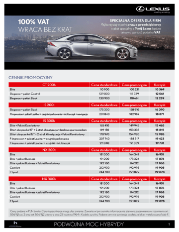 CENNIK PROMOCYJNY CT 200h Cena standardowa Cena promocyjna Korzyść Elite 110 900 100 531 10 369 Elegance + pakiet Control 129 000 116 939 12 061 Elegance + pakiet Black 130 900 118 661 12 239 Cena standardowa Cena promocyjna Korzyść Elegance + pakiet Black 175 300 158 910 16 390 F Impression + pakiet Leather + czujniki parkowania + int. kluczyk + nawigacja 201 840 182 969 18 871 IS 300h Cena standardowa Cena promocyjna Korzyść Elite + Pakiet Komfortowy 165 410 149 945 15 465 Elite+ obręcze kół 17” + 2-stref. klimatyzacja +dzielone oparcia siedzeń 169 150 153 335 15 815 Elite+ obręcze kół 17” + 2-stref. klimatyzacja +Pakiet Komfortowy 170 970 154 985 15 985 F Impression + pakiet Leather + czujniki parkowania 207 740 188 317 19 423 F Impression + pakiet Leather + czujniki + int. kluczyk 211 040 191 309 19 731 Cena standardowa Cena promocyjna Korzyść Elite 181 300 164 349 16 951 Elite + pakiet Business 191 200 173 324 17 876 Elite + pakiet Business + Pakiet Komfortowy 192 180 174 212 17 968 Comfort 212 900 192 995 19 905 F Sport 244 700 221 822 22 878 Cena standardowa Cena promocyjna Korzyść Elite 181 300 164 349 16 951 Elite + pakiet Business 191 200 173 324 17 876 Elite + pakiet Business + pakiet Komfortowy 192 180 174 212 17 968 Comfort 212 900 192 995 19 905 F Sport 244 700 221 822 22 878 IS 200t NX 200t NX 300h Ceny podane w PLN brutto. Ceny i specyfikacje mogą ulec zmianie. Zawarte w tym cenniku informacje nie stanowią zapewnienia w rozumieniu art. 5561 §1 ust. 2 oraz art. 5561 §2 ustawy z dnia 23 kwietnia 1964 r. Kodeks cywilny. Podane ceny nie zawierają dopłaty za lakier metalizowany/biały F. PODWÓJNA MOC HYBRYDY 1 REGULAMIN PROMOCJI 1.Promocja dotyczy podmiotów gospodarczych nabywających wybrane modele Lexusa w celu związanym z prowadzoną działalnością, wyszczególnione w powyższym cenniku, od Autoryzowanych Dealerów Lexusa na terytorium Rzeczpospolitej Polskiej. 2.Promocja polega na udzieleniu nabywcy pojazdu przez Autoryzowanego Dealera Lexus rabatu nie mniejszego niż połowa wartości podatku od towarów i usług (VAT) obliczonego od ceny katalogowej takiego pojazdu przed rabatem, zgodnie z następującym przykładowym wyliczeniem: Cena katalogowa przed rabatem :110 900 PLN Rabat: 10 369 PLN Cena po rabacie: 100 531 PLN Wysokość VAT liczona od ceny przed rabatem: 20 737,40 PLN Połowa wysokości VAT: 10 368,70 PLN 3.Rabat udzielony przez Autoryzowanego Dealera łącznie z przysługującym nabywcy pojazdu – podmiotowi gospodarczemu nabywającemu pojazd w celu związanym z prowadzoną działalnością – uprawnieniem do obniżenia podatku należnego o co najmniej 50% podatku naliczonego wynikającego z faktury otrzymanej od autoryzowanego Dealera, zgodnie z przepisami ustawy z dnia 11 marca 2004 r. o podatku od towarów i usług (Dz.U. nr 177 z 2011 r., poz. 1054, z późn. zm.), pozwala nabywcy na osiągnięcie korzyści w kwocie co najmniej równoważnej 100% podatku naliczonego wynikającego z faktury otrzymanej od Autoryzowanego Dealera. 4.Promocja obowiązuje dla pojazdów zamówionych od 1 do 30 września 2015 r. lub do wyczerpania zapasów. 5.Promocja nie obejmuje pojazdów zamówionych i odebranych przez nabywcę przed 1 września 2015 r. 6.Rabat udzielany w Promocji nie łączy się z innymi rabatami/przywilejami udzielonymi/udzielanymi przez Autoryzowanych Dealerów Lexusa lub Toyota Motor Poland Company Limited sp. z o.o. 7.Promocja dotyczy wybranych modeli i wybranych wersji wyposażenia zgodnie z powyższym cennikiem. PODWÓJNA MOC HYBRYDY 2