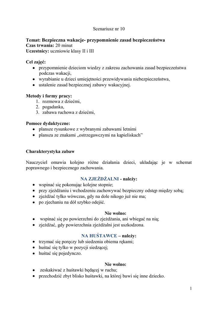 Scenariusz nr 10 Temat: Bezpieczna wakacje- przypomnienie zasad bezpieczeństwa Czas trwania: 20 minut Uczestnicy: uczniowie klasy II i III Cel zajęć: przypomnienie dzieciom wiedzy z zakresu zachowania zasad bezpieczeństwa podczas wakacji, wyrabianie u dzieci umiejętności przewidywania niebezpieczeństwa, ustalenie zasad bezpiecznej zabawy wakacyjnej. Metody i formy pracy: 1. rozmowa z dziećmi, 2. pogadanka, 3. zabawa ruchowa z dziećmi, Pomoce dydaktyczne: plansze rysunkowe z wybranymi zabawami letnimi plansza ze znakami „ostrzegawczymi na kąpieliskach” Charakterystyka zabaw Nauczyciel omawia kolejno różne działania dzieci, układając je w schemat poprawnego i bezpiecznego zachowania. NA ZJEŻDŻALNI - należy: wspinać się pokonując kolejne stopnie; przy zjeżdżaniu i wchodzeniu zachowywać bezpieczny odstęp między sobą; zjeżdżać tylko wówczas, gdy na dole nikogo już nie ma; po zjechaniu na dół szybko odejść. Nie wolno: wspinać się po powierzchni do zjeżdżania, ani wbiegać na nią; zjeżdżać, gdy powierzchnia zjeżdżalni jest uszkodzona. NA HUŚTAWCE – należy: trzymać się poręczy lub siedzenia obiema rękami; huśtać się tylko w pozycji siedzącej; huśtać się pojedynczo. Nie wolno: zeskakiwać z huśtawki będącej w ruchu; przechodzić zbyt blisko huśtawki, na której bawi się inne dziecko. 1 NA KARUZELI - należy: zapiąć pasy. Nie wolno: wychylać się; wstawać, opuszczać miejsca w czasie ruchu karuzeli; podbiegać zbyt blisko karuzeli będącej w ruchu. ZABAWA W PIASKOWNICY - w piaskownicy nie należy: rzucać piaskiem (piasek łatwo może wpaść do oka bawiącemu się obok dziecku i sprawić mu ból); bawić się w piaskownicy, jeśli są w niej odchody zwierząt (kota, psa); piasku nie należy wynosić poza obszar piaskownicy. JAZDA NA DESKOROLCE, WROTKACH, ŁYŻWOROLKACH jeździć można na specjalnie do tego celu przeznaczonym placu (lodowisku), nigdy po ulicy, po ruchliwym chodniku (łatwo jest wówczas najechać przechodzące obok osoby), ze względu na możliwość upadku i różnych urazów (kolan, rąk, głowy), osoba jeżdżąca na deskorolce powinna mieć: kask ochronny, ochraniacze na kolana, łokcie i rękawice. (Nauczyciel demonstruje różne zabezpieczenia stosowane podczas zabawy). GRA W PIŁKĘ odbywać się powinna na specjalnym placu, z dala od okien budynków mieszkalnych. Nie wolno grać w piłkę: na ulicy; na chodniku ZABAWY W WODZIE Zawsze wymagają obecności osób dorosłych Podstawą bezpieczeństwa każdego człowieka w wodzie jest posiadanie przez niego umiejętności pływania. Niezależnie jednak od stopnia opanowania tej umiejętności, nikomu - a szczególnie dzieciom - nie wolno: 2 kąpać się w czasie burzy; kąpać się w nieznanym zbiorniku wodnym; wchodzić do wody w miejscu, gdzie kąpiel jest zabroniona; skakać na główkę do nieznanej wody, może się to skończyć urazem kręgosłupa; bawić się w podtapianie kolegów, może się to skończyć dla nich tragicznie; skakać do wody, gdy jest się rozgrzanym; wchodzić do wody bezpośrednio po spożytym posiłku; pływać w miejscach gdzie jest dużo wodorostów lub wiesz, że występują zawirowania wody lub zimne prądy; pływać w wodzie o temperaturze poniżej 14 stopni (optymalna temperatura 2225 stopni); bawić się w przytapianie innych osób korzystających z wody, spychać do wody z pomostów, z materacy; krzyczeć, wzywać pomocy, w trakcie kąpieli, jeśli faktycznie nie jest Ci ona potrzebna; Znaki ostrzegawcze występujące na kąpieliskach Zakaz pływania 3 3. Zabawa ruchowa Dzieci naśladują czynności podczas wskazanej przez nauczyciela zabawy 4. Cechy bezpiecznej zabawy Uczniowie pod kierunkiem nauczyciela ustalają listę cech bezpiecznej zabawy, najważniejsze wpisują na tablicy. Zabawa jest bezpieczna gdy: odbywa się w miejscach do tego celu przeznaczonych; sprzęt do zabawy i zabawki wykorzystywane są zgodnie z ich przeznaczeniem (np. zjeżdżalnia służy do zjeżdżania, a nie do wpisania się po niej); w zabawie wykorzystujemy tylko sprzęt sprawny; uczestnicy zabawy przestrzegają zasad i reguł zabawy; zabezpieczamy się odpowiednio przed wypadkiem lub urazem; wybór zabawy jest zgodny z umiejętnościami uczestników oraz aktualną pogodą (wtedy, gdy zabawa odbywa się na dworze). 4