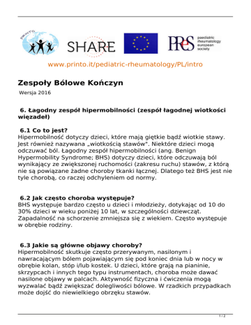 www.printo.it/pediatric-rheumatology/PL/intro Zespoły Bólowe Kończyn Wersja 2016 6. Łagodny zespół hipermobilności (zespół łagodnej wiotkości więzadeł) 6.1 Co to jest? Hipermobilność dotyczy dzieci, które mają giętkie bądź wiotkie stawy. Jest również nazywana „wiotkością stawów". Niektóre dzieci mogą odczuwać ból. Łagodny zespół hipermobilności (ang. Benign Hypermobility Syndrome; BHS) dotyczy dzieci, które odczuwają ból wynikający ze zwiększonej ruchomości (zakresu ruchu) stawów, z którą nie są powiązane żadne choroby tkanki łącznej. Dlatego też BHS jest nie tyle chorobą, co raczej odchyleniem od normy. 6.2 Jak często choroba występuje? BHS występuje bardzo często u dzieci i młodzieży, dotykając od 10 do 30% dzieci w wieku poniżej 10 lat, w szczególności dziewcząt. Zapadalność na schorzenie zmniejsza się z wiekiem. Często występuje w obrębie rodziny. 6.3 Jakie są główne objawy choroby? Hipermobilność skutkuje często przerywanym, nasilonym i nawracającym bólem pojawiającym się pod koniec dnia lub w nocy w obrębie kolan, stóp i/lub kostek. U dzieci, które grają na pianinie, skrzypcach i innych tego typu instrumentach, choroba może dawać nasilone objawy w palcach. Aktywność fizyczna i ćwiczenia mogą wyzwalać bądź zwiększać dolegliwości bólowe. W rzadkich przypadkach może dojść do niewielkiego obrzęku stawów. 1/2 6.4 Jak diagnozuje się tę chorobę? Diagnoza jest stawiana na podstawie ustalonego zestawu kryteriów, według których ocenia się ruchomość stawów, i braku innych oznak świadczących o chorobie tkanki łącznej. 6.5 Jak można leczyć tę chorobę? Leczenie jest konieczne tylko w bardzo rzadkich przypadkach. Jeśli dziecko uprawia sporty, których wpływ na organizm ma charakter powtarzalny, takie jak piłka nożna lub gimnastyka, i stale zdarzają się u niego skręcenia/naderwania stawów, powinno stosować środki wzmacniające i ochraniające mięśnie i stawy (bandaże elastyczne, bandaże funkcjonalne, opaski). 6.6 Jak choroba wpływa na życie codzienne? Hipermobilność to łagodne schorzenie, które zwykle zanika z wiekiem. Członkowie rodzin powinni być świadomi, że największe ryzyko wynikające z hipermobilności jest związane z uniemożliwianiem dziecku prowadzenia normalnego trybu życia. Dzieci powinno się zachęcać do utrzymywania normalnego poziomu aktywności, w tym do udziału w zajęciach sportowych, którymi się interesują. 2/2 Powered by TCPDF (www.tcpdf.org)