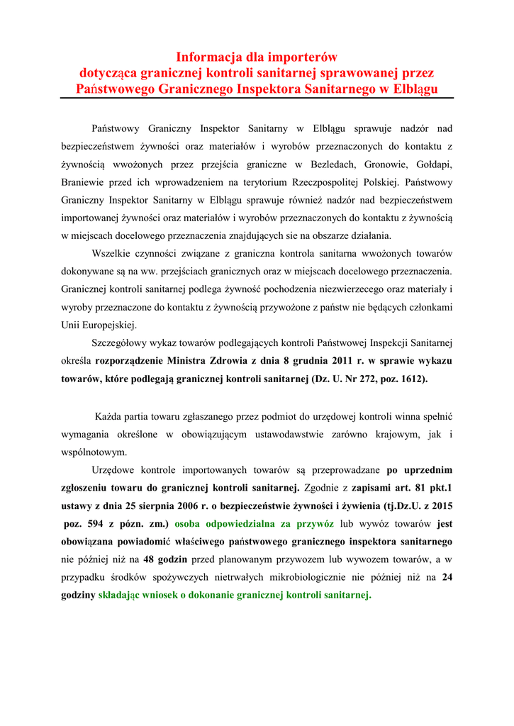 Informacja dla importerów dotycząca granicznej kontroli sanitarnej sprawowanej przez Państwowego Granicznego Inspektora Sanitarnego w Elblągu Państwowy Graniczny Inspektor Sanitarny w Elblągu sprawuje nadzór nad bezpieczeństwem żywności oraz materiałów i wyrobów przeznaczonych do kontaktu z żywnością wwożonych przez przejścia graniczne w Bezledach, Gronowie, Gołdapi, Braniewie przed ich wprowadzeniem na terytorium Rzeczpospolitej Polskiej. Państwowy Graniczny Inspektor Sanitarny w Elblągu sprawuje również nadzór nad bezpieczeństwem importowanej żywności oraz materiałów i wyrobów przeznaczonych do kontaktu z żywnością w miejscach docelowego przeznaczenia znajdujących sie na obszarze działania. Wszelkie czynności związane z graniczna kontrola sanitarna wwożonych towarów dokonywane są na ww. przejściach granicznych oraz w miejscach docelowego przeznaczenia. Granicznej kontroli sanitarnej podlega żywność pochodzenia niezwierzecego oraz materiały i wyroby przeznaczone do kontaktu z żywnością przywożone z państw nie będących członkami Unii Europejskiej. Szczegółowy wykaz towarów podlegających kontroli Państwowej Inspekcji Sanitarnej określa rozporządzenie Ministra Zdrowia z dnia 8 grudnia 2011 r. w sprawie wykazu towarów, które podlegają granicznej kontroli sanitarnej (Dz. U. Nr 272, poz. 1612). Każda partia towaru zgłaszanego przez podmiot do urzędowej kontroli winna spełnić wymagania określone w obowiązującym ustawodawstwie zarówno krajowym, jak i wspólnotowym. Urzędowe kontrole importowanych towarów są przeprowadzane po uprzednim zgłoszeniu towaru do granicznej kontroli sanitarnej. Zgodnie z zapisami art. 81 pkt.1 ustawy z dnia 25 sierpnia 2006 r. o bezpieczeństwie żywności i żywienia (tj.Dz.U. z 2015 poz. 594 z pózn. zm.) osoba odpowiedzialna za przywóz lub wywóz towarów jest obowiązana powiadomić właściwego państwowego granicznego inspektora sanitarnego nie później niż na 48 godzin przed planowanym przywozem lub wywozem towarów, a w przypadku środków spożywczych nietrwałych mikrobiologicznie nie później niż na 24 godziny składając wniosek o dokonanie granicznej kontroli sanitarnej. Wzory wniosków określa rozporządzenie Ministra Zdrowia z dnia 14 lutego 2007 r. w sprawie wzorów wniosku o dokonanie granicznej kontroli sanitarnej oraz świadectwa spełniania wymagań zdrowotnych (Dz. U. Nr 44, poz. 286). Wnioski o dokonanie granicznej kontroli sanitarnej należy kierować bezpośrednio: w przypadku towarów wwożonych przez Przejście Graniczne w Bezledach do: Punktu Granicznej Kontroli Sanitarno-Epidemiologicznej w Bezledach Przejście Graniczne w Bezledach 11- 200 Bartoszyce numer faxu: (89)761 65 72; numer telefonu: (89)761 65 72; e- mail: [email protected] w przypadku towarów wwożonych przez pozostałe przejścia do 1. Granicznej Stacji Sanitarno- Epidemiologicznej w Elblągu ul. Bema 17 82-300 Elbląg numer faxu : (55) 233 74 09; numer telefonu: (55) 232 70 80 e- mail: [email protected] 2. Graniczna Stacja Sanitarno- Epidemiologiczna w Elblągu ul. Bema 40, 82-300 Elbląg numer faxu: (55) 233 47 72 wew 105; numer telefonu (55) 233 47 72 wew 106 e-mail: [email protected] [email protected] kidawa @o2.pl „Wniosek" powinien być sporządzony w trzech egzemplarzach oddzielnie dla każdej partii towarów. Jest to dokument nierozerwalnie związany ze świadectwem spełnienia wymagań zdrowotnych, w związku tym winien być wypełniony dokładnie i czytelnie. Wszelkie błędy popełnione w trakcie sporządzania wniosku lub brak danych zostaną uznane na niekorzyść składającego wniosek. UWAGA: Niezbędna do dokonania granicznej kontroli sanitarnej dokumentacja zgodnie z ustawa z dnia 25.08.2006r. o bezpieczeństwie żywności i żywienia (tj.Dz. U.z 2010 Nr 136 poz.914 z pózn. zm.), winna być przedkładana w oryginale w języku polskim lub w innym języku urzędowym Unii Europejskiej. Jeżeli ze względu na bezpieczeństwo żywności okaże się to niezbędne państwowy graniczny inspektor sanitarny może zażądać uwierzytelnionego tłumaczenia dokumentacji przedłożonej w innym języku Unii Europejskiej. Do każdej partii zgłoszonego do granicznej kontroli sanitarnej towaru należy przedstawić niezbędną dokumentacje: 1. umożliwiającą identyfikacje towaru dokumentacje przewozowa (karnet TIR lub CMR, faktury, specyfikacje) - zawierająca m.in. dane dotyczące nazwy produktu, składu surowcowego, wielkości partii, kraju pochodzenia, nazwy i adresu producenta i importera, miejsca docelowego przeznaczenia towaru; 2. potwierdzająca zgodność towaru z wymaganiami zdrowotnymi tj.: deklaracje wystawione przez producenta i świadectwa potwierdzające, że towar jest przeznaczony do spożycia przez ludzi lub do stosowania w produkcji żywności oraz spełnia wymagania zdrowotne ustanowione przepisami prawa żywnościowego; deklaracje producenta zawierające informacje, że materiały i wyroby są przeznaczone do kontaktu z żywnością oraz stwierdzające, i że są zgodne z przepisami mającymi do nich zastosowanie. W uzasadnionych przypadkach może być również wymagane przedstawienie deklaracji producenta popartej wynikami badan dotyczącej: zanieczyszczeń chemicznych, mikrobiologicznych oraz innych biologicznych; poziomu pozostałości po napromienianiu żywności, skażeń promieniotwórczych; informacji czy dany produkt pochodzi z genetycznej modyfikacji bądź został wyprodukowany z GMO lub zawiera składniki wytworzone z GMO. Graniczna kontrola sanitarna przeprowadzana na przejściu granicznym winna być zakończona wydaniem świadectwa spełnienia wymagań zdrowotnych. Jedynie w szczególnie uzasadnionych przypadkach, po przeprowadzeniu kontroli wstępnej Państwowy Graniczny Inspektor Sanitarny może wyrazić zgodę na przeprowadzenie kontroli zgodności u odbiorcy lub w miejscu złożenia towaru na zasadach określonych w rozporządzenie Ministra Zdrowia z dnia 1
