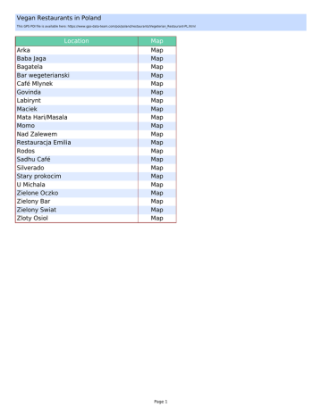 Vegan Restaurants in Poland This GPS POI file is available here: https://www.gps-data-team.com/poi/poland/restaurants/Vegeterian_Restaurant-PL.html Location Arka Baba Jaga Bagatela Bar wegeterianski Café Mlynek Govinda Labirynt Maciek Mata Hari/Masala Momo Nad Zalewem Restauracja Emilia Rodos Sadhu Café Silverado Stary prokocim U Michala Zielone Oczko Zielony Bar Zielony Swiat Zloty Osiol Map Map Map Map Map Map Map Map Map Map Map Map Map Map Map Map Map Map Map Map Map Map Page 1