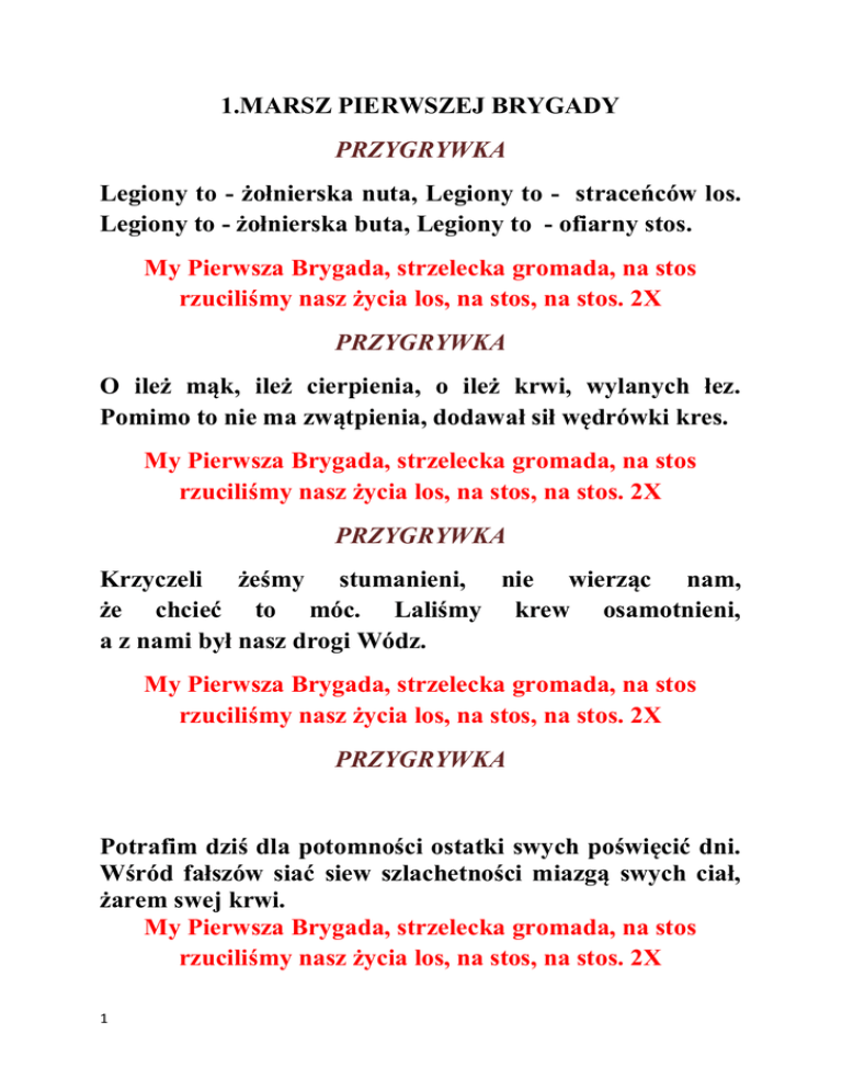 1.MARSZ PIERWSZEJ BRYGADY PRZYGRYWKA Legiony to - żołnierska nuta, Legiony to - straceńców los. Legiony to - żołnierska buta, Legiony to - ofiarny stos. My Pierwsza Brygada, strzelecka gromada, na stos rzuciliśmy nasz życia los, na stos, na stos. 2X PRZYGRYWKA O ileż mąk, ileż cierpienia, o ileż krwi, wylanych łez. Pomimo to nie ma zwątpienia, dodawał sił wędrówki kres. My Pierwsza Brygada, strzelecka gromada, na stos rzuciliśmy nasz życia los, na stos, na stos. 2X PRZYGRYWKA Krzyczeli żeśmy stumanieni, nie wierząc nam, że chcieć to móc. Laliśmy krew osamotnieni, a z nami był nasz drogi Wódz. My Pierwsza Brygada, strzelecka gromada, na stos rzuciliśmy nasz życia los, na stos, na stos. 2X PRZYGRYWKA Potrafim dziś dla potomności ostatki swych poświęcić dni. Wśród fałszów siać siew szlachetności miazgą swych ciał, żarem swej krwi. My Pierwsza Brygada, strzelecka gromada, na stos rzuciliśmy nasz życia los, na stos, na stos. 2X 1 2.ROZKWITAŁY PĄKI BIAŁYCH RÓŻ PRZYGRYWKA Rozkwitały pąki białych róż, Wróć, Jasieńku, z tej wojenki już. Wróć, ucałuj, jak za dawnych lat Dam ci za to róży najpiękniejszy kwiat. 2x Już przekwitły pąki białych róż, Przeszło lato, jesień, zima już. Cóż ci teraz dam Jasieńku, hej Gdy z wojenki wrócisz do dziewczyny swej. 2x Jasieńkowi nic nie trzeba już, Bo mu kwitną pąki białych róż. Tam pod jarem, gdzie w wojence padł, Rozkwitł na mogile białej róży kwiat. 2x Nie rozpaczaj lube dziewczę, nie, W polskiej ziemi nie będzie mu źle. Policzony będzie trud i znój, Za Ojczyznę poległ ukochany Twój. 2x 2 3. PIECHOTA PRZYGRYWKA Nie noszą lampasów lecz szary ich strój. Nie noszą ni srebra, ni złota, Lecz w pierwszym szeregu podąża na bój Piechota, ta szara Piechota. 2 x Maszerują strzelcy, maszerują, Karabiny błyszczą, szary strój, A przed nimi drzewa salutują, Bo za naszą Polskę idą w bój! Idą, a w słońcu kołysze się stal. Dziewczęta zerkają zza płota, A oczy ich dumnie utkwione są w dal, Piechota, ta szara Piechota! 2 X Maszerują strzelcy, maszerują, Karabiny błyszczą, szary strój, A przed nimi drzewa salutują, Bo za naszą Polskę idą w bój! Nie grają im surmy, nie huczy im róg, A śmierć im pod stopy się miota, Lecz w pierwszym szeregu podąża na bój Piechota, ta szara Piechota.2 X Maszerują strzelcy, maszerują, Karabiny błyszczą, szary strój, A przed nimi drzewa salutują, Bo za naszą Polskę idą w bój! 3 4.O MÓJ ROZMARYNIE O mój rozmarynie rozwijaj się ! 2x Pójdę do dziewczyny, pójdę do jedynej zapytam się. 2 x A jak mi odpowie – nie kocham cię,2x Ułani wędrują, strzelcy maszerują zaciągnę się.2x Dadzą mi konika cisawego 2x i ostrą szabelkę i ostrą szabelkę do boku mego.2x Pójdziemy z okopów na bagnety 2x Bagnet mnie ukłuje, śmierć mnie pocałuje ale nie Ty. 2x 4 5.PIERWSZA KADROWA PRZYGRYWKA Raduje się serce, raduje się dusza, Gdy Pierwsza Kadrowa na wojenkę rusza. Oj da, oj da dana, Kompanio kochana, Nie masz to jak Pierwsza, nie! Chociaż do Warszawy mamy długą drogę, ale przejdziem migiem byle tylko „w nogę”. Oj da, oj da dana, Kompanio kochana, Nie masz to jak Pierwsza, nie! Kiedy pobijemy po drodze Moskali, ładne Warszawianki będziem całowali. Oj da, oj da dana, Kompanio kochana, Nie masz to jak Pierwsza, nie! A jak się szczęśliwie zakończy powstanie to Pierwsza Kadrowa Gwardyją zostanie. Oj da, oj da dana, Kompanio kochana, Nie masz to jak Pierwsza, nie! 5 6.UŁANI, UŁANI MALOWANE DZIECI PRZYGRYWKA Ułani, ułani malowane dzieci, niejedna panienka za Wami poleci. Hej, hej ułani malowane dzieci, niejedna panienka za Wami poleci. PRZYGRYWKA Jedzie ułan, jedzie, konik pod nim pląsa. Czapkę ma na bakier i podkręca wąsa. Hej, hej ułani malowane dzieci, niejedna panienka za Wami poleci. PRZYGRYWKA Jedzie, ułan jedzie, szablą pobrzękuje. Uciekaj dziewczyno, bo Cię pocałuje. Hej, hej ułani malowane dzieci, niejedna panienka za Wami poleci. PRZYGRYWKA A niech pocałuje, nikt mu nie zabrania. Wszak on swoją piersią Ojczyznę osłania. Hej, hej ułani malowane dzieci, niejedna panienka za Wami poleci. 6 7.WOJENKO, WOJENKO PRZYGRYWKA Wojenko, wojenko, cóżeś ty za Pani ? Że za Tobą idą, że za Tobą idą chłopcy malowani? 2x PRZYGRYWKA Chłopcy malowani, sami wybierani. Wojenko, wojenko, wojenko, wojenko, cóżeś ty za Pani? 2x PRZYGRYWKA Na wojence ładnie, kto Boga uprosi. Żołnierze strzelają, żołnierze strzelają, Pan Bóg kule nosi. 2x PRZYGRYWKA Wojenko, wojenko, co za moc jest w Tobie? Kogo Ty pokochasz, kogo Ty pokochasz w zimnym leży grobie. 2x 7 8. PRZYBYLI UŁANI POD OKIENKO Przybyli ułani pod okienko 2 x Pukają, wołają: puść panienko! 2 x PRZYGRYWKA O Boże, a cóż to za wojacy ? 2 x Otwieraj! Nie bój się to Czwartacy! 2 x PRZYGRYWKA O Jezu! A dokąd Bóg prowadzi? 2 x Warszawę odwiedzić byśmy radzi. 2 x PRZYGRYWKA Gdy zwiedzim Warszawę, już nam pilno 2 x Zobaczyć to stare nasze Wilno. 2 x PRZYGRYWKA A z Wilna już droga jest gotowa, 2 x Prowadzi prościutko aż do Lwowa. 2 x PRZYGRYWKA Panienka okienko otworzyła 2 x Ułanów do środka zaprosiła. 2 x 8 9.ORLĘTA LWOWSKIE ( JEST TAKIE MIASTO CO ZWIE SIĘ LWÓW) Jest takie miasto, co zwie się Lwów. Znów o nim wolno dziś pamiętać. Nocą we Lwowie srebrzysty nów oświetla cmentarz gdzie Orlęta. To Lwowskie Dzieci nazwano tak. Te, które padły, broniąc miasta. Śpią na cmentarzu, gdzie krzyży brak, a ciemna zieleń grób zarasta. Nieważne z kim walczyli, nieważne, kto dowodził, lecz to koledzy nasi co pozostali młodzi. I zawsze już mieć będą lat dziesięć, jedenaście. Na płyty potrzaskane wiatr strąca liści garście. Jest takie miasto, co zwie się Lwów. Znów o nim wolno dziś pamiętać. Nocą we Lwowie srebrzysty nów oświetla cmentarz gdzie Orlęta. Tam Lwowskie Dzieci w mogiłach śpią: gimnazjaliści i batiary. Na niebie gwiazdy ze zwiewną mgłą i 