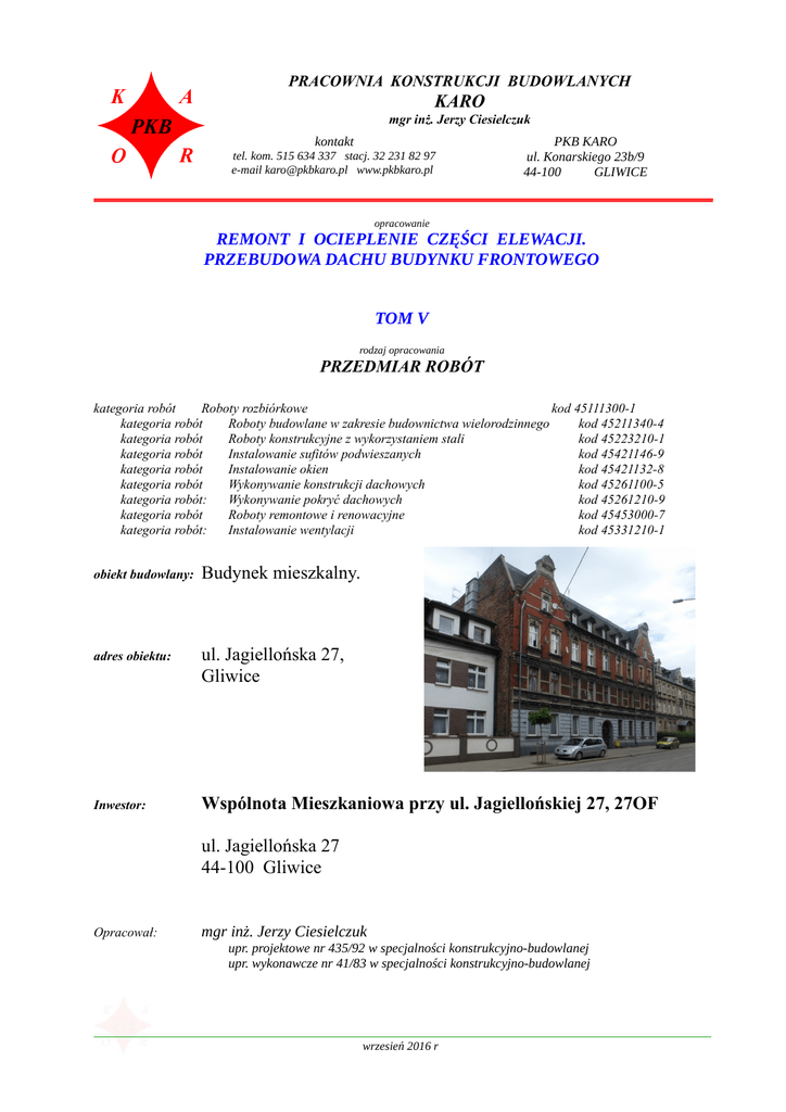 Przedmiar robót – strona tytułowa – Jagiellońska 27, 27of