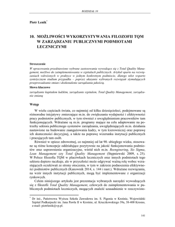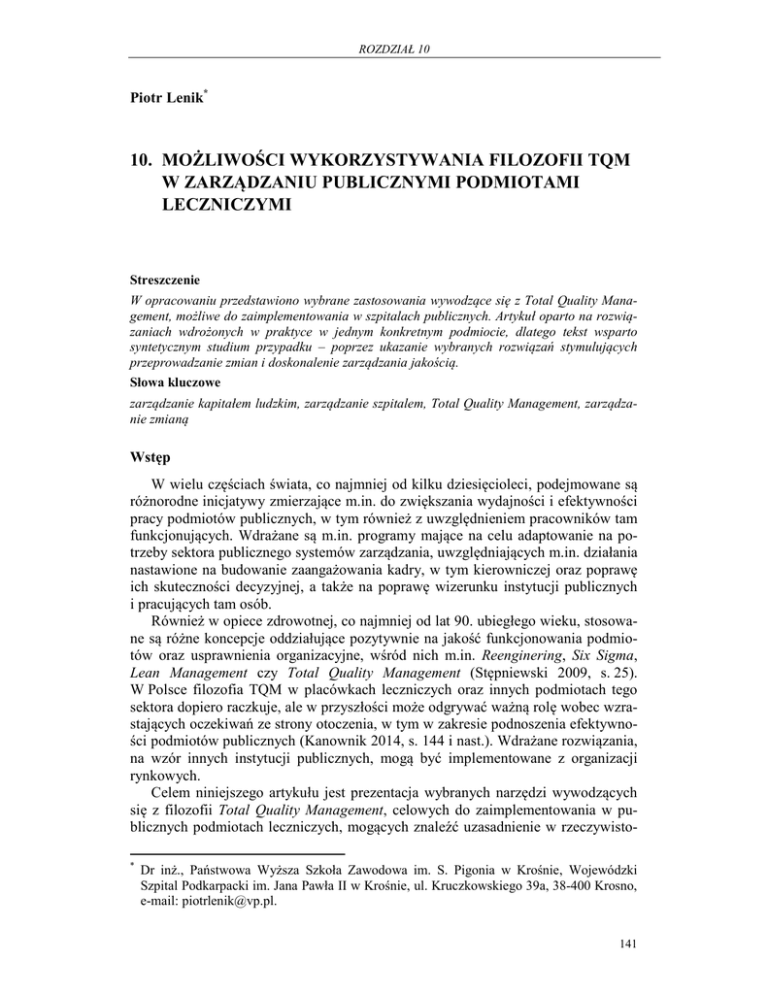 ROZDZIAŁ 10 Piotr Lenik* Piotr Lenik 10. MOŻLIWOŚCI WYKORZYSTYWANIA FILOZOFII TQM W ZARZĄDZANIU PUBLICZNYMI PODMIOTAMI LECZNICZYMI Streszczenie W opracowaniu przedstawiono wybrane zastosowania wywodzące się z Total Quality Management, możliwe do zaimplementowania w szpitalach publicznych. Artykuł oparto na rozwiązaniach wdrożonych w praktyce w jednym konkretnym podmiocie, dlatego tekst wsparto syntetycznym studium przypadku – poprzez ukazanie wybranych rozwiązań stymulujących przeprowadzanie zmian i doskonalenie zarządzania jakością. Słowa kluczowe zarządzanie kapitałem ludzkim, zarządzanie szpitalem, Total Quality Management, zarządzanie zmianą Wstęp W wielu częściach świata, co najmniej od kilku dziesięcioleci, podejmowane są różnorodne inicjatywy zmierzające m.in. do zwiększania wydajności i efektywności pracy podmiotów publicznych, w tym również z uwzględnieniem pracowników tam funkcjonujących. Wdrażane są m.in. programy mające na celu adaptowanie na potrzeby sektora publicznego systemów zarządzania, uwzględniających m.in. działania nastawione na budowanie zaangażowania kadry, w tym kierowniczej oraz poprawę ich skuteczności decyzyjnej, a także na poprawę wizerunku instytucji publicznych i pracujących tam osób. Również w opiece zdrowotnej, co najmniej od lat 90. ubiegłego wieku, stosowane są różne koncepcje oddziałujące pozytywnie na jakość funkcjonowania podmiotów oraz usprawnienia organizacyjne, wśród nich m.in. Reenginering, Six Sigma, Lean Management czy Total Quality Management (Stępniewski 2009, s. 25). W Polsce filozofia TQM w placówkach leczniczych oraz innych podmiotach tego sektora dopiero raczkuje, ale w przyszłości może odgrywać ważną rolę wobec wzrastających oczekiwań ze strony otoczenia, w tym w zakresie podnoszenia efektywności podmiotów publicznych (Kanownik 2014, s. 144 i nast.). Wdrażane rozwiązania, na wzór innych instytucji publicznych, mogą być implementowane z organizacji rynkowych. Celem niniejszego artykułu jest prezentacja wybranych narzędzi wywodzących się z filozofii Total Quality Management, celowych do zaimplementowania w publicznych podmiotach leczniczych, mogących znaleźć uzasadnienie w rzeczywisto* Dr inż., Państwowa Wyższa Szkoła Zawodowa im. S. Pigonia w Krośnie, Wojewódzki Szpital Podkarpacki im. Jana Pawła II w Krośnie, ul. Kruczkowskiego 39a, 38-400 Krosno, e-mail: [email protected]. 141 Możliwości wykorzystywania filozofii TQM w zarządzaniu publicznymi podmiotami leczniczymi ści tego typu organizacji. Treści w nim wykorzystane opierają się na badaniach własnych autora, ujętych w przygotowywanej publikacji książkowej zatytułowanej „Zarządzanie ewolucyjnymi zmianami w szpitalach publicznych – perspektywa menedżerska zarządzania kapitałem ludzkim w organizacjach oziębłych”. 1. Przegląd instrumentarium Total Quality Management Total Quality Management oraz poszczególne wdrożenia związane z kompleksowym zarządzaniem jakością mogą służyć poprawie efektywności funkcjonowania podmiotów leczniczych, nie tylko z punktu widzenia usprawniania realizowanych procedur medycznych, na co zwracają uwagę m.in. standardy akredytacyjne Centrum Monitorowania Jakości w Ochronie Zdrowia, ale również – a być może przede wszystkim – w odniesieniu do poprawy funkcjonowania w wymiarze organizacyjnym i ekonomicznym. Należy jednocześnie zaznaczyć, że instrumentarium stosowane w innych różnego typu organizacjach nie stanowi całkowitej nowości w sektorze ochrony zdrowia. Metoda SERVQUAL służąca badaniu jakości świadczonych usług, rozwiązania wywodzące się z zarządzania przez cele czy inne instrumenty, od kilku dekad adaptuje się na świecie dla potrzeb podmiotów leczniczych. Zarówno teoretycy jak i praktycy dostrzegają celowość szerszego wdrażania rozwiązań zaczerpniętych z filozofii Total Quality Management, poprzez ich adaptowanie do specyfiki podmiotów ochrony zdrowia (Stępniewski, Karniej i Kęsy 2011, s. 443466; Dobska i Rogoziński 2012, s. 266-276; Bugdol 2015, s. 447-451, inni). W realizowaniu filozofii związanej z kompleksowym zarządzaniem jakością, priorytetową rolę odgrywają różnorodne i zróżnicowane formy oddziaływania, nie stanowiące bynajmniej wytycznych, niepodlegających jakimkolwiek celowym modyfikacjom. Wręcz przeciwnie, adaptacja poszczególnych narzędzi wydaje się pożądana, jeżeli odpowiada ona potrzebom i uwzględnia specyfikę organizacyjną czy sektorową. Zbiór ten stanowi pokaźne instrumentarium, za pomocą którego można realizować stawiane przed organizacją cele. Niektóre z instrumentów stanowią proste operacyjne czynności, inne są nastawione na bardziej strategiczne obszary funkcjonowania organizacji. Jak pokazują liczne przykłady, z punktu widzenia specyfiki konkretnej organizacji, należy wybierać najbardziej przydatne dla niej instrumenty i używać ich w celu realizacji zadań związanych m.in. z poprawą efektywności oraz dbałością o klienta. Ze względu na czas oraz sposób oddziaływania, instrumentarium TQM ogólnie można podzielić na (Hamrol i Mantura 2002, s. 120; Hamrol 2005, s. 126-127): zasady zarządzania jakością, metody zarządzania jakością, narzędzia zarządzania jakością. Według takiego ujęcia, zasady zarządzania jakością mają w prosty i zwięzły sposób określać cele i zadania prowadzonej w organizacji polityki, są pomocne we wdrażaniu systemów zarządczych, mają determinować działania na rzecz doskonalenia. Zasady nie stanowią przy tym gotowych rozwiązań, procedur czy schematów postępowań. Pozwalają natomiast ukierunkowywać podejmowane działania w sposób właściwy, stanowiąc tym samym zbiór wskazówek umożliwiających kształtowanie jakości ogólnie w całej organizacji. Przykładami zasad służących doskonaleniu jakości są m.in.: zasady Deminga, zasada ciągłego doskonalen