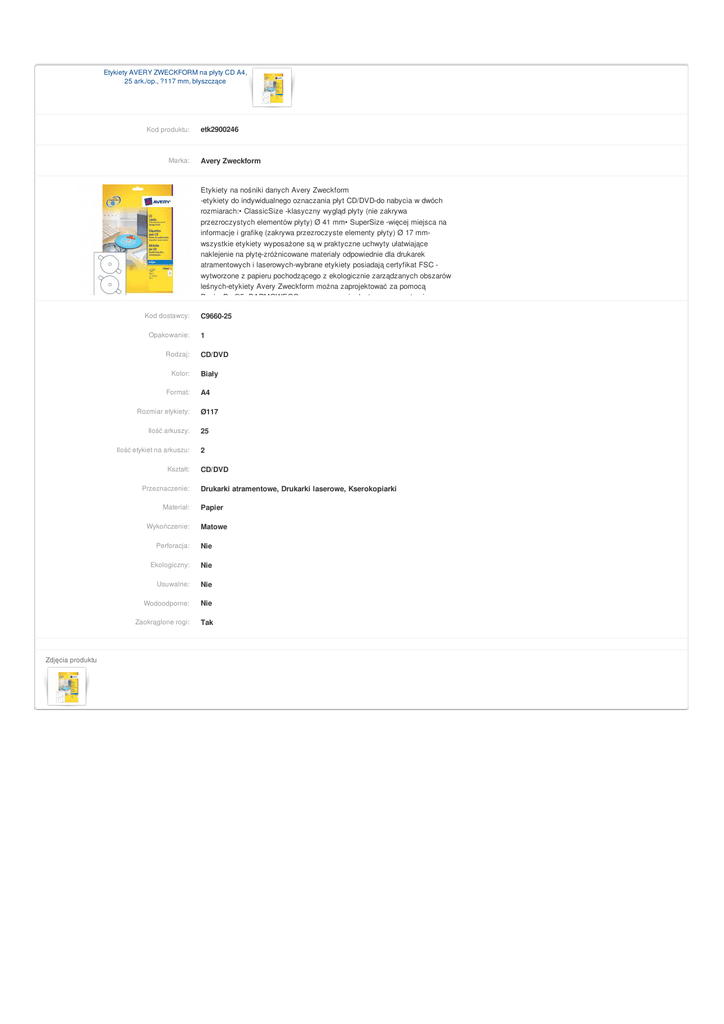 Etykiety AVERY ZWECKFORM na płyty CD A4, 25 ark./op., ?117 mm, błyszczące Kod produktu: Marka: etk2900246 Avery Zweckform Etykiety na nośniki danych Avery Zweckform -etykiety do indywidualnego oznaczania płyt CD/DVD-do nabycia w dwóch rozmiarach:• ClassicSize -klasyczny wygląd płyty (nie zakrywa przezroczystych elementów płyty) Ø 41 mm• SuperSize -więcej miejsca na informacje i grafikę (zakrywa przezroczyste elementy płyty) Ø 17 mmwszystkie etykiety wyposażone są w praktyczne uchwyty ułatwiające naklejenie na płytę-zróżnicowane materiały odpowiednie dla drukarek atramentowych i laserowych-wybrane etykiety posiadają certyfikat FSC wytworzone z papieru pochodzącego z ekologicznie zarządzanych obszarów leśnych-etykiety Avery Zweckform można zaprojektować za pomocą DesignPro®5 -DARMOWEGO oprogramowania dostępnego na stronie Kod dostawcy: Opakowanie: Rodzaj: Kolor: Format: Rozmiar etykiety: Ilość arkuszy: Ilość etykiet na arkuszu: Kształt: Przeznaczenie: Materiał: Wykończenie: Zdjęcia produktu C9660-25 1 CD/DVD Biały A4 Ø117 25 2 CD/DVD Drukarki atramentowe, Drukarki laserowe, Kserokopiarki Papier Matowe Perforacja: Nie Ekologiczny: Nie Usuwalne: Nie Wodoodporne: Nie Zaokrąglone rogi: Tak