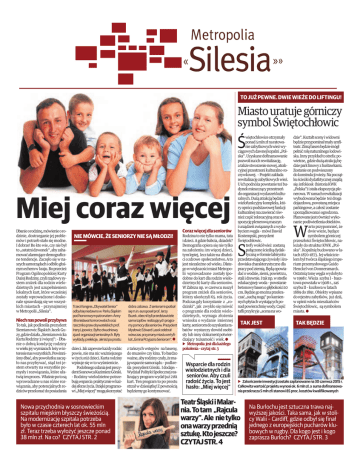 27 czerwca 2014 Bezpłatny dodatek do „Dziennika Zachodniego” TO JUŻ PEWNE. DWIE WIEŻE DO LIFTINGU! Miasto uratuje górniczy symbol Świętochłowic więtochłowice otrzymały ponad 5 mln zł na ratowanie zabytkowych wież wyciągowych dawnej kopalni „Polska”. Uzyskane dofinansowanie pozwoli na ich rewitalizację, a także stworzenie nowej, atrakcyjnej przestrzeni kulturalno-rozrywkowej. – Projekt zakłada rewitalizację zabytkowych wież. U ich podnóża powstanie też budynek mieszczący przestrzeń do organizacji wydarzeń kulturalnych. Dużą atrakcją będzie wielofunkcyjny kompleks, który oprócz podstawowej funkcji kulturalnej ma zawierać również część rekreacyjną oraz ekspozycję plenerową maszyn i urządzeń związanych z wydoCoraz więcej dla seniorów byciem węgla – mówi Dawid Rodzina to nie tylko mama, tata Kostempski, prezydent b Dzisiaj marzenia stały idzieci.Agdziebabcia,dziadek? Świętochłowic. b Dzisiaj marzenia stały sięsię rzeczywistością trefy wokół Demografia opiera się nie tylko rzeczywistością ... ...wież zostaną połączone ścieżką dydakna założeniu: im więcej dzieci, tyczną w formie labiryntu tymlepiej, lecztakżena dbałościozdrowe społeczeństwo.Ato przedstawiającego żywioły i śrojest niezależne od wieku. Dlate- dowiska charakterystyczne dla gowwiększościmiastMetropo- pracy pod ziemią. Będą opowialii wprowadzone zostały (po- dać o wodzie, ziemi, powietrzu, dobne do kart dla rodzin wielo- stali i drewnie. I tak np. w strefie dzietnych) karty dla seniorów. edukacyjnej: woda – powstanie W Zabrzu np. w czerwcu ruszył betonowy basen o głębokości 10 program zniżek dla seniorów, cm. Będzie go można przekraktórzy ukończyli 65. rok życia. czać „suchą nogą” po kamienPodczas gdy korzystanie z „ro- nych płytach wystających podzinki”, jak zwykło się mówić nad powierzchnię wody. Część o programie dla rodzin wielo- tafli przykryje „scena na wodzietnych, wymaga złożenia wniosku o wydanie imiennej TAK JEST karty,senioromdouzyskaniarabatów wystarczy dowód osobisty lub inny dokumentpotwierdzający tożsamość i wiek. a b Metropolia jestdlakażdego pokolenia–czytaj str.3 Ś Miej coraz więcej Moda na na Śląsk Śląsk Moda Dbanieorodzinę,mówienieorodzinie, dostrzeganie jej problemów i potrzeb stało się modne. I dobrze! Bo kto wie, czy nie był to „ostatni dzwonek”, aby zahamowaćalarmującedemograficzne tendencje. Zaczęło się w naszychsamorządachiodbiłogłośnymechemw kraju.Boprzecież Program Ogólnopolskiej Karty DużejRodziny,czylirządowysystem zniżek dla rodzin wielodzietnych jest uzupełnieniem lokalnych kart, które wcześniej zostały wprowadzone i doskonale sprawdzają się we wszystkich miastach – przynajmniej w Metropolii „Silesia”. Niech nas powoli przybywa To tak, jak podkreśla prezydent Siemianowic Śląskich Jacek Guzy,gdziedziała„Siemianowicka Karta Rodziny 3 i więcej”: – Dbanie o dobrą kondycję rodziny wwielujej wymiarach leżywinteresienaswszystkich.Powinniśmydbać,abypowolutkuzaczęło nas przybywać, stąd też jestem otwarty na wszystkie pomysły i rozwiązania, które ułatwiątenproces. Właśniepotosą wprowadzane u nas różne rozwiązania, aby potencjalnych rodzicówprzekonaćdoposiadania NIE MÓWCIE, ŻE SENIORZY NIE SĄ MŁODZI! S TrzeciKongres„ObywatelSenior” odbyłsięniedawnow ParkuŚląskim podhonorowympatronatem Anny iBronisławaKomorowskichoraz rzecznikaprawobywatelskichprof. IrenyLipowicz.Byłtodwudniowy zjazd organizacjisenioralnych.Były wykłady,prelekcje, aleteżpoprostu dobra zabawa. Zsenioramispotkał sięm.in.europosełprof.Jerzy Buzek,obecnibyliprzedstawiciele samorządów realizującychprogramypomocydlaseniorów.Prezydent MysłowicEdwardLasokodebrał wówczas przyznanymiastucertyfikat„GminaPrzyjaznaSeniorom”. a dzieci.Jakzapewnekażdyrodzic powie, nie ma nic ważniejszego wżyciuniżdzieci.Kartarodziny wpisuje się w to wyśmienicie. PodobnegozdaniajestprezydentSosnowcaKazimierzGórski. – Rodziny wielodzietne potrzebująwsparcia praktyczniewkażdejsferzeżycia.Dziękiprogramowi„Miejwięcej”mogąskorzystać z tańszych wstępów na baseny, do muzeów czy kina. To bardzo ważne,abyrodzinyczuły,żemająwsparciesamorządu–podkreśla prezydent Górski. I dodaje: – Wydział Polityki Społecznej realizujący program wydał już 2161 kart. Ten program to po prostu strzał w dziesiątkę! Z pewnością będziemy go kontynuować. Nowa przychodnia w sosnowieckim szpitalu miejskim błyszczy świeżością. Na modernizację szpitala potrzeba było w czasie czterech lat ok. 55 mln zł. Teraz trzeba wyłożyć jeszcze ponad 38 mln zł. Na co? CZYTAJ STR. 2 Wsparcie dla rodzin wielodzietnych i dla seniorów. Aby czuli radość życia. To jest hasło: „Miej więcej” dzie”. Kształt sceny i widowni będzie przypominał mały amfiteatr. Zimą basen będzie mógł pełnić rolę naturalnego lodowiska. Inny przykład to strefa: powietrze, gdzie dużą atrakcją będzie park linowy z huśtawkami. Zostanie on podwieszony do konstrukcji wieży. Na początku ścieżki dydatktycznej znajdą się: infokiosk (historia KWK „Polska”) i stała ekspozycja plenerowa. W ramach rewitalizacji wybudowana będzie też droga dojazdowa, powstaną miejsca parkingowe, a całość zostanie uporządkowana i ogrodzona. Planowane jest również wykonanie podświetlenia obiektów. arto przypomnieć, że dwie wieże, będące symbolem górniczej przeszłości Świętochłowic, należały do struktur KWK „Polska”. Kopalnię budowano w latach 1870-1873. Jej właścicielem był twórca śląskiego imperium przemysłowego Guido Henckel von Donnersmarck. Ostatnią tonę węgla wydobyto w 1998 r. Wieża szybu I – basztowa powstała w 1908 r., zaś szybu II – kozłowa w latach 1889 do 1891. Obiekty wpisane do rejestru zabytków, już dziś, w opinii wielu mieszkańców Świętochłowic, są symbolem miasta. a W TAK BĘ