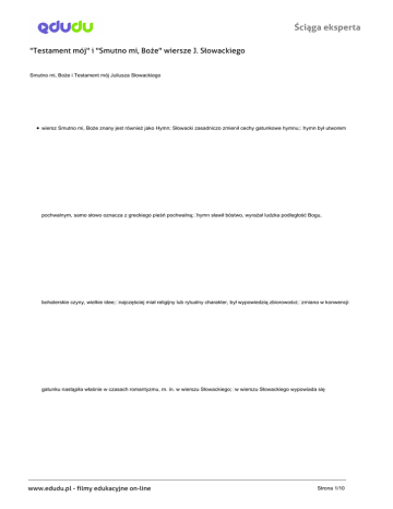 Ściąga eksperta "Testament mój" i "Smutno mi, Boże" wiersze J. Słowackiego Smutno mi, Boże i Testament mój Juliusza Słowackiego wiersz Smutno mi, Boże znany jest również jako Hymn; Słowacki zasadniczo zmienił cechy gatunkowe hymnu; hymn był utworem pochwalnym, samo słowo oznacza z greckiego pieśń pochwalną; hymn sławił bóstwo, wyrażał ludzka podległość Bogu, bohaterskie czyny, wielkie idee; najczęściej miał religijny lub rytualny charakter, był wypowiedzią zbiorowości; zmiana w konwencji gatunku nastąpiła właśnie w czasach romantyzmu, m. in. w wierszu Słowackiego; w wierszu Słowackiego wypowiada się www.edudu.pl - filmy edukacyjne on-line Strona 1/10 Ściąga eksperta jednostka, dowód na to mamy już w pierwszym wersie: Smutno mi, Boże – dla mnie na zachodzie/ Rozlałeś tęczę blasków promienistą; kluczowy jest tu zwrot dla mnie; podległość Bogu zastąpiona została rozmową z Bogiem, w której ważny, pierwszoplanowy jest człowiek; u Słowackiego Bóg złoci niebo człowiekowi, czyli to Bóg robi coś dla człowieka; odwrócenie tradycyjnego porządku: Przede mną gasisz w lazurowej wodzie/ Gwiazdę ognistą…/ Choć mi tak niebo Ty złocisz i morze,/ www.edudu.pl - filmy edukacyjne on-line Strona 2/10 Ściąga eksperta Smutno mi Boże!/ Dzisiaj, na wielkim morzu obłąkany,/ Sto mil od brzegu i sto mil przed brzegiem. osoba mówiąca znajduje się w centrum świata przedstawionego, to jej przemyślenia i refleksje są tu najważniejsze: Dzisiaj, na wielkim morzu obłąkany,/ Sto mil od brzegu i sto mil przed brzegiem.; sto mil określa sytuację człowieka w świecie: jego zagubienie, brak przynależności, ciągłą wędrówkę; człowiek ten tylko Bogu chce mówić i mówi o swym cierpieniu, cytuję: Ale przed Tobą głąb serca otworzę; podmiot liryczny płynie po morzu, obserwuje piękno świata, jednak nie potrafi się nim cieszyć, www.edudu.pl - filmy edukacyjne on-line Strona 3/10 Ściąga eksperta wielokrotnie powtarza Smutno mi, Boże…; jego odczucia są jakby odwrotnością piękna zachodu słońca; tak jakby w jego duszy słońce zaszło już dawno temu; ta dysproporcja, odwrotność to podstawowy chwyt poetycki w tym wierszu; brak własnego miejsca w świecie, poczucie wyobcowania i oddalenia od kraju; cały czas podmiot liryczny mówi o sobie, o swych indywidualnych przeżyciach, przede wszystkim o swej samotności, takiej totalnej, będącej wyobcowaniem; wskazuje to też na jego poczucie www.edudu.pl - filmy edukacyjne on-line Strona 4/10 Ściąga eksperta wyjątkowości, indywidualizm typowo romantyczny, a także troskę o losy kraju i za tym krajem tęsknotę testament - to dokument sporządzany jednostronnie, zgodnie z przyjętymi zasadami, ustanawiający spadkobierców na wypadek śmierci testatora; wiersz Słowackiego jest testamentem poetyckim, czyli wyrazem woli, przemyśleń podmiotu lirycznego; znajdują się w nim również elementy typowe dla „ostatniej woli”, tzn. sprawa dziedzica, kształt pogrzebu; ma on formę mowy wygłaszanej do odbiorców i przez swą retoryczną formułę jest trudny dla nas – współczesnych jego czytelników; podobnie, jak w wierszu Smutno mi, Boże, podmiot liryczny mówi w pierwszej osobie, w typowo romantyczny sposób – bezpośrednio; jest to liryka wyznania, a www.edudu.pl - filmy edukacyjne on-line Strona 5/10 Ściąga eksperta jednocześnie zwrotu do adresata: Żyłem z wami, cierpiałem i płakałem z wami,/ Nigdy mi, kto szlachetny, nie był obojętny. pierwszym adresatem są Polacy, a nawet szerzej - wszyscy ludzie (zjadaczach chleba); częstym błędem jest twierdzenie, że Słowacki mówi w tym wierszu, podobnie jak w Hymnie… w swoim imieniu; świadczą o tym zasadnicze różnice między wypowiedzią podmiotu lirycznego, a biografią autora: Żem dla ojczyzny sterał moje lata młode;/ A póki okręt walczył – siedziałem na maszcie,/ A gdy tonął – z okrętem poszedłem pod wodę. Słowacki nie uczestniczył przecież w powstaniu listopadowy; kreacja typowo romantycznej postawy poświęcenia dla ojczyzny, www.edudu.pl - filmy edukacyjne on-line Strona 6/10 Ściąga eksperta podporządkowania własnego życia sprawom kraju; kolejny adresat wiersza – testamentu to przyjaciele podmiotu lirycznego, ci których prosi tez aby: Niech przyjaciele moi w nocy się zgromadzą/ I biedne serce moje spalą w aloesie,/ I tej, która mi dała to serc, oddadzą –/ Tak się matkom wypłaca świat, gdy proch odniesie… palenie serca w aloesie to zwyczaj z egipskich rytuałów grobowych; wiąże się on z przekraczaniem granic świata żywych; znany jest również w chrześcijańskiej tradycji, jako namaszczanie ciała zmarłego wonnościami, między innymi aloesem; tak uczyniono z www.edudu.pl - filmy edukacyjne on-line Strona 7/10 Ściąga eksperta ciałem Chrystusa; poeta sugeruje, że też podejmuje ofiarę i będzie miał udział w śmierci, a co za tym idzie w zmartwychwstaniu Chrystusa; oddanie serca matce można odczytać w tym kontekście, jako swoistą Pietę; matka podobnie, jak Matka Boska będzie cierpiała nad tu spopielonym ciałem swego syna; podmiot liryczny silnie odnosi się do tradycji chrześcijańskiej, szczególnie podkreśla wagę swego poświęcenia, które ponosi on i jego pokolenie POEZJA TYRTEJSKA - to poświęcenie dla idei wolności było typowym motywem tyrtejskim w poezji romantyków; nakaz: Lecz www.edudu.pl - filmy edukacyjne on-line Strona 8/10 Ściąga eksperta zaklinam – niech żywi nie tracą nadziei/ I przed narodem niosą oświaty kaganiec;/ A kiedy trzeba na śmierć idą po kolei,/ Jak kamienie przez Boga rzucane na szaniec!....; poetycki testament zawarty w wierszu Słowackiego wypełnili poeci pokolenia Kolumbów, czyli młodych ludzi, którym dorastać przyszło w czasach II wojny światowej i którzy tę walkę, o której pisał Słowacki, podjęli; ich losy opisuje Kamiński w książce Kamienie na szaniec; jej bohate