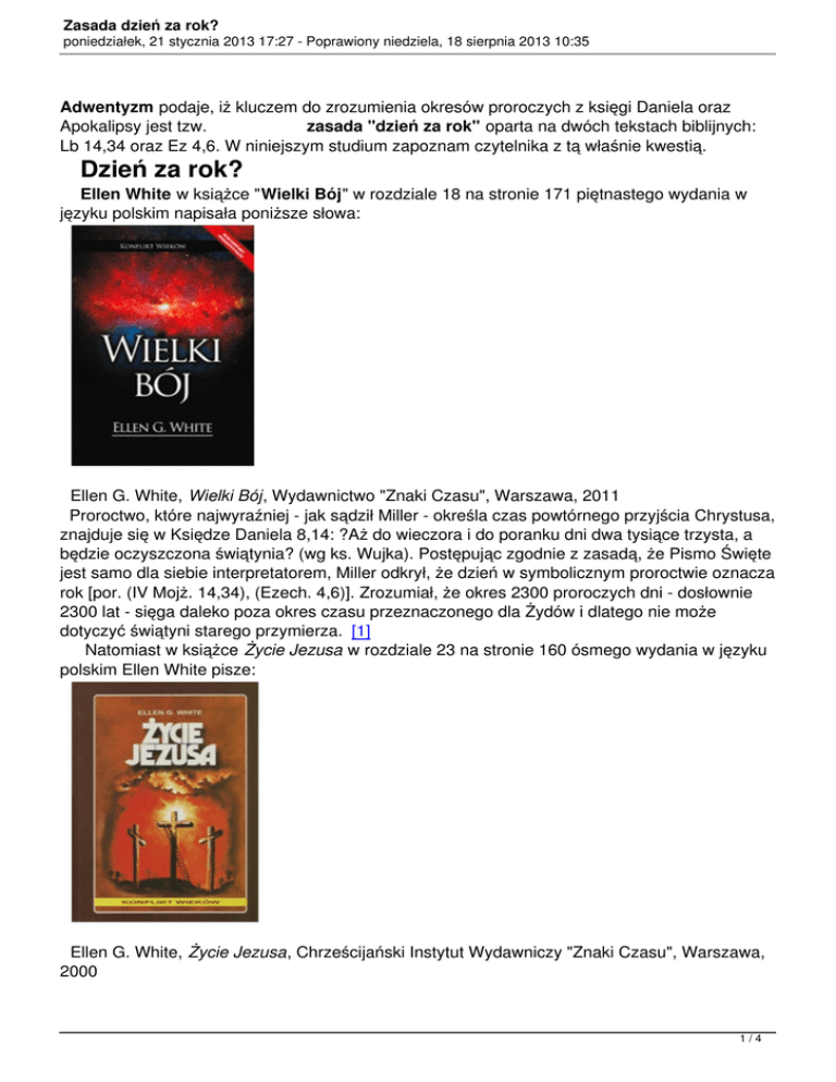 Zasada dzień za rok? poniedziałek, 21 stycznia 2013 17:27 - Poprawiony niedziela, 18 sierpnia 2013 10:35 Adwentyzm podaje, iż kluczem do zrozumienia okresów proroczych z księgi Daniela oraz Apokalipsy jest tzw. zasada "dzień za rok" oparta na dwóch tekstach biblijnych: Lb 14,34 oraz Ez 4,6. W niniejszym studium zapoznam czytelnika z tą właśnie kwestią. Dzień za rok? Ellen White w książce "Wielki Bój" w rozdziale 18 na stronie 171 piętnastego wydania w języku polskim napisała poniższe słowa: Ellen G. White, Wielki Bój, Wydawnictwo "Znaki Czasu", Warszawa, 2011 Proroctwo, które najwyraźniej - jak sądził Miller - określa czas powtórnego przyjścia Chrystusa, znajduje się w Księdze Daniela 8,14: ?Aż do wieczora i do poranku dni dwa tysiące trzysta, a będzie oczyszczona świątynia? (wg ks. Wujka). Postępując zgodnie z zasadą, że Pismo Święte jest samo dla siebie interpretatorem, Miller odkrył, że dzień w symbolicznym proroctwie oznacza rok [por. (IV Mojż. 14,34), (Ezech. 4,6)]. Zrozumiał, że okres 2300 proroczych dni - dosłownie 2300 lat - sięga daleko poza okres czasu przeznaczonego dla Żydów i dlatego nie może dotyczyć świątyni starego przymierza. [1] Natomiast w książce Życie Jezusa w rozdziale 23 na stronie 160 ósmego wydania w języku polskim Ellen White pisze: Ellen G. White, Życie Jezusa, Chrześcijański Instytut Wydawniczy "Znaki Czasu", Warszawa, 2000 1/4 Zasada dzień za rok? poniedziałek, 21 stycznia 2013 17:27 - Poprawiony niedziela, 18 sierpnia 2013 10:35 W proroctwach dzień liczony jest za rok [patrz (IV Mojż. 14,34) oraz (Ezech. 4,6)]. Siedemdziesiąt tygodni lub czterysta dziewięćdziesiąt dni to odpowiednik czterystu dziewięćdziesięciu lat. [2] Na tej podstawie adwentyzm podaje m.in., że: okres 1260 dni równy jest okresowi 1260 lat, okres 1290 dni = 1290 lat, 1335 dni = 1335 lat, 2300 wieczorów i poranków = 2300 lat, 3.5 roku = 1260 lat, 42 miesiące = 1260 lat, 1 godzina = 15 dni, 0.5 godziny = 7.5 dnia. Przyjrzyjmy się tekstom biblijnym, w oparciu o które ? jak przeczytaliśmy z wcześniejszej wypowiedzi Ellen White ? William Miller doszedł do wniosku, że okresy prorocze należy przeliczać według reguły ?dzień proroczy za rok?. Oto pierwszy z dwóch tekstów według przekładu Tysiąclecia: Lb 14,32-34 Jeśli zaś chodzi o was, to trupy wasze legną na tej pustyni, a synowie wasi będą się błąkali na pustyni przez czterdzieści lat, dźwigając ciężar waszej niewierności, póki trupy wasze nie zniszczeją na pustyni. Poznaliście kraj w przeciągu czterdziestu dni; każdy dzień teraz zamieni się w rok i przez czterdzieści lat pokutować będziecie za winy i poznacie, co to znaczy, gdy Ja się oddalę. A oto drugi tekst, który służy za argument na rzecz zasady ?dzień za rok?. Cytat pochodzi z księgi Ezechiela, który podaję również w oparciu o przekład Tysiąclecia: Ez 4,1-6 A ty, synu człowieczy, weź sobie tabliczkę glinianą, połóż ją przed sobą i narysuj na niej miasto Jerozolimę. Następnie przedstaw na niej oblężenie przeciwko niemu, zbuduj naprzeciw niego szaniec, usyp naprzeciw niego wał, uszykuj przeciwko niemu obóz [nieprzyjacielski] i ustaw przeciwko niemu tarany dokoła. Potem weź sobie patelnię żelazną i uczyń z niej jakby mur żelazny pomiędzy sobą a miastem i skieruj wzrok swój na nie, tak jakby było oblężone i jakbyś ty je oblegał. To będzie znakiem dla domu Izraela. Połóż się na lewym boku, a ja złożę winę Izraelitów na ciebie. Przez tyle dni będziesz znosił ich winę, przez ile będziesz na nim leżał. Podaję ci lata trwania ich winy w liczbie dni: przez trzysta dziewięćdziesiąt dni będziesz znosił winę pokoleń izraelskich. A kiedy je wypełnisz, położysz się znów na prawym boku i będziesz znosił przewinienia pokolenia Judy przez czterdzieści dni. Liczę ci jeden dzień za każdy poszczególny rok. Proszę zauważyć, że tekst z Lb 14,32-34 mówi o zamianie liczby literalnych czterdziestu dni na symboliczne czterdzieści lat , natomiast tekst z Ez 4,1-6 mówi o zamianie liczby 2/4 Zasada dzień za rok? poniedziałek, 21 stycznia 2013 17:27 - Poprawiony niedziela, 18 sierpnia 2013 10:35 literalnych trzystu dziewięćdziesiętu lat na symboliczne trzysta dziewięćdziesiąt dni . Prezentuję to na poniższym wykresie: W myśl reguły "dzień za rok" w oparciu o tekst z Lb 14,32-34 wiersz z Ez 4,1-6 powinien być odczytany jako: "390 literalnych lat" x "360 dni [jeden rok posiada 360 dni]" = "140'400 dni" W Biblii mamy bardzo wiele różnych proroctw, w których podano różne okresy. Czytamy o okresie: - pół godziny (Ap 8,1), - godziny (Ap 17,12), - kilku dni (Ap 2,10), - kilku miesięcy (Ap 9,5). Wszystkie powyższe okresy zostały przez adwentyzm przeliczone na lata stosownie do reguły "dzień za rok". Na tej podstawie otrzymujemy: - okres pół godziny = 7.5 dnia, - okres jednej godziny = 15 dni, - okres jednego dnia = 1 rok, - okres jednego miesiąca = 30 lat. Są jednak w Biblii także proroctwa, w których okresami są konkretne, literalne lata. Spójrzmy tylko na niektóre z nich: - Rdz 15,13 ? ucisk nasienia Abrama przez 400 lat, - Rdz 41,27 ? 7 lat głodu, - 1 Krl 17,1 i Łk 4,25 ? 3.5 roku suszy, - Jr 25,11 ? 70 lat poddaństwa królowi Babilonu. Czy Biblia potwierdza w powyższych przypadkach regułę "dzień za rok"? Wiemy przecież, że powyższe proroctwa spełniły się w czasie literalnym, czyli tak jak zostało to przepowiedziane (rok = rok). Gdy przyjrzymy się innym okresom proroczym, również dostrzeżemy, że one także spełniły się w sposób dosłowny: - Rdz 40,12.18.20nn ? trzy dni dla piekarza i trzy dni dla podczaszego, - 2Krl 20,5 ? trzy dni dla Ezekiasza, - Jon 3,4 ? 40 dni dla Niniwy, - Mt 12,40 ? Syn Człowieczy w sercu ziemi trzy dni i trzy noce ? Jon 2,1, - Mt 17,23 ? zmartwychwstanie Mesjasza trzeciego dnia ? Oz 6,2. Czytelnik sam widzi, że powyższe proroctwa wypełnił