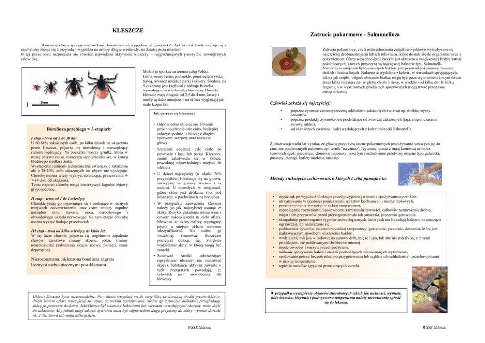 KLESZCZE Zatrucia pokarmowe - Salmonelloza Wiosenne słońce sprzyja wędrówkom, biwakowaniu, wypadom na „majówki”. Jest to czas kiedy najczęściej i najchętniej obcuje się z przyrodą – wyjeżdża na urlopy, długie weekendy, na działkę poza miastem. O tej porze roku rozpoczyna się również największa aktywność kleszczy – najgroźniejszych pasożytów zewnętrznych człowieka. Można je spotkać na terenie całej Polski. Lubią tereny leśne, podmokłe, porośnięte wysoką trawą, również miejskie parki i skwery. Średnio, co 5 zakażony jest krętkami z rodzaju Borrelia, wywołującymi u człowieka boreliozę. Dorosłe kleszcze mają długość od 2,5 do 4 mm, larwy i nimfy są dużo mniejsze – na skórze wyglądają jak małe kropeczki. 1 : . Zatrucia pokarmowe, czyli ostre schorzenia żołądkowo-jelitowe wywoływane są najczęściej drobnoustrojami lub ich toksynami, które dostały się do organizmu wraz z pożywieniem. Okres wiosenno-letni zwykle jest okresem o zwiększonej liczbie zatruć pokarmowych, których przyczyną są najczęściej bakterie typu Salmonella. Naturalnym miejscem bytowania tych bakterii jest przewód pokarmowy zwierząt dzikich i hodowlanych. Bakterie te wydalane z kałem , w warunkach sprzyjających, takich jak ciepło, wilgoć, obecność białka, mogą być poza organizmem żywym nawet przez kilka miesięcy np. w glebie około 3 m-cy, w wodzie - od kilku dni do kilku tygodni, a w wysuszonych produktach spożywczych mogą trwać przez czas nieograniczony Człowiek zakaża się najczęściej: • Jak ustrzec się kleszczy: Borelioza przebiega w 3 etapach: I etap – trwa od 2 do 30 dni U 60-80% zakażonych osób, po kilku dniach od ukąszenia przez kleszcza, pojawia się niebolesny i nieswędzący rumień wędrujący. Na początku tworzy grudkę, która w miarę upływu czasu, rozszerza się pierścieniowo, w końcu blednie po środku i znika. Wystąpienie rumienia jednoznacznie świadczy o zakażeniu ale u 20-40% osób zakażonych ten objaw nie występuje. Chorobę można wtedy wykryć, oznaczając przeciwciała w 7-14 dniu od ukąszenia. Temu etapowi choroby mogą towarzyszyć łagodne objawy grypopodobne. II etap – trwa od 1 do 4 miesięcy Charakteryzują go pojawiające się i znikające w różnych miejscach zaczerwienienia oraz ostre zmiany zapalne narządów m.in. stawów, serca, ośrodkowego i obwodowego układu nerwowego. Na tym etapie chorobę można wykryć badając przeciwciała. Odpowiednio ubierać się. Ubranie powinno chronić całe ciało. Najlepiej założyć spodnie i bluzkę z długim rękawem, skarpety oraz nakrycie głowy. - Starannie obejrzeć całe ciało po powrocie z lasu lub parku. Kleszcze, zanim zakotwiczą się w skórze, poszukują odpowiedniego miejsca do wkłucia. - U dzieci najczęściej (w około 70% przypadków) lokalizują się na głowie, zazwyczaj na granicy włosów i za uszami. U dorosłych w miejscach, gdzie skóra jest delikatna (np. pod kolanami, w pachwinach, na brzuchu). - W przypadku zauważenia kleszcza należy go jak najszybciej usunąć ze skóry. Ryzyko zakażenia rośnie wraz z czasem zakotwiczenia na ciele ofiary. Kleszcza ze skóry należy wyciągnąć pęsetą a miejsce ukłucia starannie zdezynfekować. Nie wolno go wcześniej smarować tłuszczem ponieważ dusząc się, zwiększa wydzielanie śliny, w której mogą być zarazki. III etap – trwa od kilku miesięcy do kilku lat. W tej fazie choroby pojawia się uogólnione zapalenie stawów, zanikowe zmiany skórne, późne zmiany neurologiczne (zaburzenia czucia, mowy, pamięci, stany depresyjne). Nierozpoznana, nieleczona borelioza zagraża licznymi niebezpiecznymi powikłaniami. • - - Stosować środki odstraszające (spryskiwać ubranie- nie smarować skóry). Substancje aktywne zawarte w tych preparatach powodują, że człowiek jest niewidoczny dla kleszczy. Ukłucie kleszcza bywa niezauważalne. Po wkłuciu wtryskuje on do rany ślinę zawierającą środki przeciwbólowe, dzięki którym ofiara najczęściej nie czuje, że została zaatakowana. Można go zauważyć dokładnie przeglądając skórę po powrocie do domu. Jeśli kleszcz był zakażony bakteriami lub wirusami wywołującymi choroby, może dojść do zakażenia. Aby jednak mógł zakazić żywiciela musi być odpowiednio długo przyssany do skóry – postać dorosła ok. 2 dni, larwa lub nimfa kilka godzin. WSSE Gdańsk • poprzez żywność zanieczyszczoną odchodami zakażonych zwierząt np. drobiu, myszy, szczurów, poprzez produkty żywnościowe pochodzące od zwierząt zakażonych (jaja, mięso, czasami surowe mleko), od zakażonych zwierząt i ludzi wydalających z kałem pałeczki Salmonella, Z obserwacji wielu lat wynika, że główną przyczyną zatruć pokarmowych jest używanie surowych jaj do ciast nie poddawanych pieczeniu np. sernik "na zimno", leguminy, ciasta z masą kremową na bazie surowych jajek, jajecznica, domowe majonezy, poza tym rozdrobnione przetwory mięsne typu galaretki, pasztety, pierogi, kotlety mielone, tatar itp. Metody uniknięcia zachorowań, o których trzeba pamiętać to: • • • • • • • • • • • mycie rąk po wyjściu z ubikacji i przed przygotowywaniem i spożywaniem posiłków, utrzymywanie w czystości pomieszczeń, sprzętów kuchennych i naczyń stołowych, przechowywanie żywności w niskiej temperaturze, zapobieganie rozmrażaniu i ponownemu zamrażaniu żywności, całkowite rozmrożenie drobiu, mięsa i ich przetworów przed przystąpieniem do ich smażenia, pieczenia, gotowania, skrupulatne przestrzeganie rygorów technologicznych, które jeśli nie likwidują bakterii, to znacząco ograniczają ich namnażanie się, poddawanie żywności działaniu wysokiej temperatury (gotowanie, pieczenie, duszenie), które jest najłatwiejszym sposobem zniszczenia bakterii, wydzielenie miejsca w lodówce na surowy drób, mięso i jaja, tak aby nie stykały się z innymi produktami, nie poddawanymi