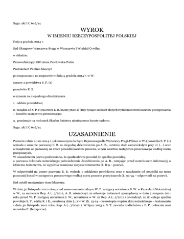 Sygn. akt I C 646/14 WYROK W IMIENIU RZECZYPOSPOLITEJ POLSKIEJ Dnia 5 grudnia 2014 r. Sąd Okręgowy Warszawa-Praga w Warszawie I Wydział Cywilny w składzie: Przewodniczący SSO Anna Pawłowska-Patro Protokolant Paulina Skoczyń po rozpoznaniu na rozprawie w dniu 5 grudnia 2014 r. w W. sprawy z powództwa S. P. (1) przeciwko E. B. o uznanie za niegodnego dziedziczenia 1. oddala powództwo; 2. zasądza od S. P. (1) na rzecz E. B. kwotę 3600 zł (trzy tysiące sześćset złotych) tytułem zwrotu kosztów postępowania – kosztów zastępstwa procesowego; 3. przejmuje na rachunek Skarbu Państwa nieuiszczone koszty sądowe. Sygn. akt I C 646/14 UZASADNIENIE Pozwem z dnia 20.01.2014 r. (skierowanym do Sądu Rejonowego dla Warszawy Pragi-Północ w W.) powódka S. P. (1) wniosła o uznanie pozwanej E. B. za niegodną dziedziczenia po A. B., ostatnio stale zamieszkałym przy ul. (...) oraz o zasądzenie od pozwanej na rzecz powódki kosztów procesu, w tym kosztów zastępstwa procesowego według norm przepisanych. W uzasadnieniu pozwu podniesiono, że spadkodawca powołał do spadku powódkę, a pozwana dokonała notarialnego poświadczenia dziedziczenia po A. B., zatajając przed notariuszem informację o istnieniu testamentu, co wypełnia znamiona ukrycia testamentu (k. 8-9 – pozew). W odpowiedzi na pozew pozwana E. B. wniosła o oddalenie powództwa oraz o zasądzenie od powódki na rzecz pozwanej kosztów zastępstwa procesowego według norm prawem przepisanych (k. 94-95 – odpowiedź na pozew). Sąd ustalił następujący stan faktyczny. W dniu 30 listopada 2012 roku przed asesorem notarialnym W. P. zastępcą notariusza B. W. w Kancelarii Notarialnej w W., za numerem Rep. A (...)/2012, A. B. oświadczył, że odwołuje testament sporządzony w dniu 3 sierpnia 2011 roku przed W. P. zastępcą notariusza I. W., notariusza w W. za Rep. A (...)/2011 i oświadczył, że do całego spadku powołuje S. T., córkę K. i E., urodzoną dnia (...) w W. (k. 13-14 – kserokopia wypisu aktu notarialnego – testamentu z dnia 30 listopada 2012 roku, Rep. A (...)/2012 ). W lipcu 2013 r. S. T. zawarła małżeństwo z P. P. i obecnie nosi nazwisko P. (bezsporne). S. T. wraz z narzeczonym P. P. zamieszkali z A. B. i opiekowali się nim podczas choroby. A. B. zmarł w dniu 25 lutego 2013 roku (k. 12 – kserokopia odpisu skróconego aktu zgonu nr X/(...)/2013, sporządzonego przez Urząd Stanu Cywilnego w m. (...). W.). W skład spadku po A. B. wschodziło wyłącznie spółdzielcze własnościowe prawo do lokalu nr (...) położonego w W. przy ul. (...). Po śmierci A. B. w tym mieszkaniu pozostawała S. T. z narzeczonym. E. B. jest córką A. B., nie utrzymywała kontaktów z ojcem. Wiadomość o śmierci ojca powzięła podczas wizyty na cmentarzu przy rodzinnym grobowcu (k. 125 w zw. z k. 121-122,– zeznania powódki, k. 125 -126 w zw. z k. 122-124,– zeznania pozwanej). W dniu 23 czerwca 2013 r. E. B. wraz z ciotką pojawiała się w mieszkaniu nr (...) przy ul. (...) w W.. W mieszkaniu znajdowali się wówczas obecna teściowa powódki S. P. (2) i narzeczony powódki P. P.. P. P. rozmawiał z E. B. na temat choroby i śmierci spadkodawcy oraz na temat mieszkania, poinformował, ze zostały sporządzone dokumenty dotyczące mieszkania, lecz nie okazał testamentu. S. P. (2) byłą wówczas w łazience (k. 124-125 – zeznania świadka P. P., k. 125 -126 w zw. z k. 122-124– zeznania pozwanej). W dniu 25 czerwca 2013 r. E. B. udała się do kancelarii notarialnej i asesor notarialny M. D., zastępca notariusza K. Ł., sporządziła akt poświadczenia dziedziczenia. W sporządzonym akcie poświadczenia dziedziczenia stwierdzono, że spadek po A. B., synu W. J. i H., zmarłym dnia 25 lutego 2013 roku w W., ostatnio zamieszkałym w W. przy ul. (...), nabywa z dobrodziejstwem inwentarza na podstawie ustawy córka E. B., córka A. i Z., urodzona dnia (...) roku w W., w całości (k. 97-98 – kserokopia wypisu aktu poświadczenia dziedziczenia z dnia 25 czerwca 2013 roku, Rep. A (...)/2014). E. B. nie informowała notariusza, iż został sporządzony testament. Po sporządzeniu aktu poświadczenia dziedziczenia E. B. udała się do spółdzielni mieszkaniowej celem załatwienia formalności, a następnie do mieszkania przy ul. (...) i poinformowała S. P. (1) i jej męża o nabyciu mieszkania. S. P. (1) poinformowała E. B., że sprawa jej u adwokata i strony więcej nie kontaktowały się. E. B. w grudniu 2013 r. zgłosiła na policji fakt, iż w mieszkaniu jej ojca mieszkają bezprawnie nieznajomi ludzie. W toku postępowania S. P. (1) została przesłuchana, złożyła testament i ostatecznie postanowieniem z dnia 26 lutego 2014 r. postępowanie w sprawie 4Ds 1803/13 (naruszenie miru) zostało umorzone. S. P. (1) wniosła do Sądu sprawę o stwierdzenie nabycia spadku po A. B., uchylenie poświadczenia dziedziczenia E. B. i uznanie jej za niegodna dziedziczenia. Postępowanie o stwierdzenie nabycia spadku po A. B. i uchylenie poświadczenia dziedziczenia E. B. jest prawomocnie zakończone – Sąd stwierdził nabycie spadku po A. B. przez S. P. (1) i uchylił akt poświadczenia dziedziczenia E. B. (k. 125 w zw. z k. 121-122 – zeznania powódki, k. 125 -126 w zw. z k. 122-124 – zeznania pozwanej). Powyższy stan faktyczny Sąd ustalił na podstawie przesłuchania S. P. (1) – k. 125 w zw. z k. 121-122, przesłuchania E. B. - k. 125 -126 w zw. z k. 122-124, zeznań świadka P. P. – k. 124-125, dokumentów znajdujących się w aktach sprawy na kartach: 12, 13-14, 50-51, 97-98, 99 oraz dokumentów znajdujących się w aktach sprawy 4Ds 1803/13 na kartach: 1, 2, 3, 4, 6-7, 14, 25, 29. Sąd uznał dokumenty złożone do akt sprawy za wiarygodne w całości, gdyż ich rzetelność i prawdziwość nie były przez strony kwestionowane, były niezbędne do ustalenia stanu faktycznego. Sąd dał wiarę zeznaniom świadka J. P. i dowodowi z przesłuchania stron, należy zauważyć, iż zeznania 