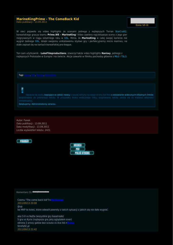 MarineKingPrime - The ComeBack Kid Data publikacji : 13.09.2011 Ocena: 5/5 (3) W sieci pojawiło się video highlights ze scenami jednego z najlepszych Terran StarCraft2, koreańskiego gracza teamu Prime.WE - MarineKing! Video zawiera najciekawsze sceny z jego gier rozgrywanych w ciągu ostatniego roku w GSL. Mimo, że MarineKing w całej swojej karierze nie wygrał żadnego GSL, dzięki swojemu unikatowemu stylowi gry i perfekcyjnemy micro marines, na stałe zapisał się na kartach koreańskiej pro-league. Ten sam użytkownik - LukeFilmproductions, stworzył także video highlights Naniwy, jednego z najlepszych Protossów w Europie i na świecie. Akcje zawarte w filmiku pochodzą głównie z MLG i TSL3. Tagi: Korea, GSL, Naniwa, MarineKing Uprasza się osoby kopiujące w całości newsy z naszej witryny na swoje strony lub fora o wstawianie widocznych klikalnych linków, bezpośrednio do pobranego tekstu. W przypadku braku widocznego linku, skopiowanie tekstu uważa się za kradzież własności intelektualnej. Dziękujemy: Administratorzy serwisu. Autor: Fanek Data publikacji : 13.09.2011 Data modyfikacji : 13.09.2011 Liczba wyświetleń tekstu: 2421 Komentarz (5) dodaj komentarz Czemu "The come back kid"?~Marksman 2011/09/13 20:08 @up bo MKP to koleś, które odwalił powroty z takich sytuacji z jakich się nie dało wygrać. aka 3-0 vs NaDa (wszystkie gry basetrade) 5 gra vs Kyrix (najlepsza gra jaką oglądałem ever) obrona 2 proxy gatów bez scouta vs Ace itd.~Proxy StrefaSC.pl 2011/09/13 21:42 oglądałem kilka razy te proxy Ace i ciągle sie głowie jak on to wybronił versus Kyrix to było zdaje sie z 2 sezonu GSL, pierwsza prezentacja split marines v banelingi~Fanek 2011/09/14 00:00 Rzućcie jakiś namiar na tą grę z Kyrixem.~oko123 2011/09/14 09:21 http://www.youtube.com/watch?v=Xec_WamfWG8 tu najciekawsze akcje, można znaleźć też całe sety na yt.~Fanek 2011/09/14 12:38 dodaj komentarz 08.10.2015 Kampania "Szepty o zagładzie" dostępna za darmo (0 komentarzy) 27.09.2015 Kolejni bohaterowie w trybie Sprzymierzonych Dowódców (0 komentarzy) 22.09.2015 Cyfrowe gadżety za udział w BlizzCon 2015 (0 komentarzy) 15.07.2015 Legacy of the Void dostępne w przedsprzedaży! (0 komentarzy) 17.06.2015 Informacje z E3 - prolog kampanii Legacy of the Void (0 komentarzy) 30.05.2015 WCS Europe - sobota (30 maja) 18.00 grupa G - MaNa! (0 komentarzy) 07.05.2015 DreamHack Open France 2015 - już 8 maja - MaNa! (0 komentarzy) 03.05.2015 Na wesoło: postacie E-sportu 50 (0 komentarzy) 03.05.2015 IEM Katowice 2015 - jeszcze raz! (0 komentarzy) 03.05.2015 KeSPA Cup 2015 Season 1 - live! (0 komentarzy) 26.04.2015 Proleague - Top5 gier miesiąca (0 komentarzy) 26.04.2015 CJ Entus wygrywa 2 runde Proleague! (0 komentarzy) 18.04.2015 Wersja beta Legacy of the Void – aktualizacja 2.5.1 (0 komentarzy) 18.04.2015 WCS finals 2015 - galeria (0 komentarzy) 18.04.2015 Omówienie zmian w balansie Legacy of the Void (0 komentarzy) 11.04.2015 WCS Europe kwalifikacje z Polakami - dziś (sobota) 18.00 (0 komentarzy) 11.04.2015 Aktualizacja balansu Heart of the Swarm – 9 kwietnia (0 komentarzy) 11.04.2015 GSL Season1 2015 - galeria (0 komentarzy) 11.04.2015 Zbanowane konta w StarCraft II (0 komentarzy) 04.04.2015 Red Bull Battle Grounds powraca jesienią 2015 (0 komentarzy) (zobacz wszystkie)