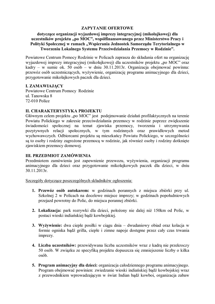 ZAPYTANIE OFERTOWE dotyczące organizacji wyjazdowej imprezy integracyjnej (mikołajkowej) dla uczestników projektu „po MOC”, współfinansowanego przez Ministerstwo Pracy i Polityki Społecznej w ramach „Wspierania Jednostek Samorządu Terytorialnego w Tworzeniu Lokalnego Systemu Przeciwdziałania Przemocy w Rodzinie”. Powiatowe Centrum Pomocy Rodzinie w Policach zaprasza do składania ofert na organizację wyjazdowej imprezy integracyjnej (mikołajkowej) dla uczestników projektu „po MOC” oraz kadry – w sumie ok. 50 osób – w dniu 30.11.2013r. Organizacja obejmować powinna: przewóz osób uczestniczących, wyżywienie, organizację programu animacyjnego dla dzieci, przygotowanie mikołajkowych paczek dla dzieci. I. ZAMAWIAJĄCY Powiatowe Centrum Pomocy Rodzinie ul. Tanowska 8 72-010 Police II. CHARAKTERYSTYKA PROJEKTU Głównym celem projektu „po MOC” jest podejmowanie działań profilaktycznych na terenie Powiatu Polickiego w zakresie przeciwdziałania przemocy w rodzinie poprzez zwiększenie świadomości społecznej na temat zjawiska przemocy, tworzenia i utrzymywania pozytywnych relacji społecznych, w tym rodzinnych oraz prawidłowych metod wychowawczych. Odbiorcami projektu są mieszkańcy Powiatu Polickiego, w szczególności są to osoby i rodziny zagrożone przemocą w rodzinie, jak również osoby i rodziny dotknięte zjawiskiem przemocy domowej. III. PRZEDMIOT ZAMÓWIENIA Przedmiotem zamówienia jest zapewnienie przewozu, wyżywienia, organizacji programu animacyjnego dla dzieci oraz przygotowanie mikołajkowych paczek dla dzieci, w dniu 30.11.2013r. Szczegóły dotyczące poszczególnych składników ogłoszenia: 1. Przewóz osób autokarem: w godzinach porannych z miejsca zbiórki przy ul. Szkolnej 2 w Policach na docelowe miejsce imprezy; w godzinach popołudniowych przejazd powrotny do Polic, do miejsca porannej zbiórki. 2. Lokalizacja: park rozrywki dla dzieci, położony nie dalej niż 150km od Polic, w postaci wioski indiańskiej bądź kowbojskiej. 3. Wyżywienie: dwa ciepłe posiłki w ciągu dnia – dwudaniowy obiad oraz kolacja w formie ogniska bądź grilla, ciepłe i zimne napoje dostępne przez cały czas trwania imprezy. 4. Liczba uczestników: przewidywana liczba uczestników wraz z kadrą nie przekroczy 50 osób. W związku ze specyfiką projektu dopuszcza się zmniejszenie liczby o kilka osób. 5. Program animacyjny dla dzieci: organizacja całodziennego programu animacyjnego. Program obejmować powinien: zwiedzanie wioski indiańskiej bądź kowbojskiej wraz z przewodnikiem wprowadzającym w świat Indian bądź kowboi, organizacja zabaw dla dzieci dostosowanych do warunków pogodowych, malowanie twarzy dzieci, obecność osoby przebranej za Świętego Mikołaja, który porozmawia z dziećmi i rozda mikołajkowe paczki, inna atrakcja zgodna z możliwościami ośrodka (np. przejażdżka konno, strzelanie z łuku, przejażdżka saniami). 6. Mikołajowe paczki dla dzieci: paczki zawierać powinny owoce (minimum po dwa: pomarańcze i kiwi), słodycze (min. czekoladowy kalendarz adwentowy, dwie czekolady, batonik, czekoladowy mikołaj, dwa lizaki, 10 cukierków) oraz soczek w kartoniku. Przewidywana ilość paczek: 30 – z związku ze specyfiką projektu liczba paczek może ulec zwiększeniu o kilka. 7. Ubezpieczenie uczestników: na czas przejazdu i trwania imprezy. IV. KRYTERIA OCENY. Oferty składać mogą Wykonawcy, którzy: 1. Posiadają uprawnienia do wykonywania określonej działalności lub czynności, jeżeli ustawy nakładają obowiązek posiadania takich uprawnień. 2. Znajdują się w sytuacji ekonomicznej, finansowej i organizacyjnej zapewniającej wykonanie oferty. 3. Spełniają warunki określone w przedmiocie oferty. Przesłanie oferty w odpowiedzi na niniejsze zapytanie ofertowe jest jednoznaczne ze złożeniem oświadczenia, że Wykonawca spełnia powyższe kryteria. Kryterium wyboru oferty: Ocenie podlegać będą wyłącznie oferty spełniające warunki określone w ogłoszeniu. Przy ocenie i porównaniu ofert zastosowane będą następujące kryteria: 1. Cena – 100% Opis sposobu oceny ofert: 1. K1 = najnizsza cena x 100 % cena oferty ocenianej V. ZAWARTOŚĆ OFERTY Kompletna oferta powinna zawierać: 1. Pełną nazwę oferenta. 2. Adres lub siedzibę oferenta, numer telefonu, NIP, Regon. 3. Wycenę zamówienia wyrażoną w PLN z dokładnością do dwóch miejsc po przecinku. 4. Cena podana w ofercie powinna uwzględniać wszystkie koszty związane z wykonaniem przedmiotu zamówienia oraz warunkami stawianymi przez Zamawiającego. 5. Opis techniczny miejsca imprezy. 6. Program imprezy uwzględniający program animacyjny dla dzieci. 7. Osobę do kontaktu. VI. TERMINY I SPOSÓB SKŁADANIA OFERT Powiatowe Centrum Pomocy Rodzinie w Policach zaprasza do składania ofert w terminie do 12 listopada 2013 roku do godziny 12.00 (decyduje data i godzina wpływu do Siedziby PCPR w Policach) drogą pocztową, przesyłką kurierską, osobiście lub drogą elektroniczną na email: [email protected] W przypadku przesłania oferty drogą pocztową koperta zawierająca ofertę powinna być zaadresowana: Powiatowe Centrum Pomocy Rodzinie ul. Tanowska 8 72-010 Police Oferta dotycząca organizacji wyjazdowej imprezy integracyjnej (mikołajkowej) dla uczestników projektu „po MOC” Złożona oferta musi być parafowana na każdej stronie. Oferta musi być podpisana przez Oferenta. Kopie dokumentów muszą być poświadczone za zgodność z oryginałem przez Oferenta. W przypadku składania ofert drogą elektroniczną konieczny jest podpis oferenta (np. w formie skanu). VII. KONTAKT Z ZAMAWIAJĄCYM Osobą upoważnioną ze strony PCPR do kontaktu z Wykonawcami jest Anita Wójtowicz, tel. 91 317 02 28 lub 603 083 020. VIII. UWAGI KOŃCOWE 1. Zamawiający zastrzega sobie prawo odstąpienia bądź unieważnienia zapytania ofertowego bez podania przyczyny w przypadku zaistnienia okoliczności nieznanych Zamawiającemu w dniu sporządzani