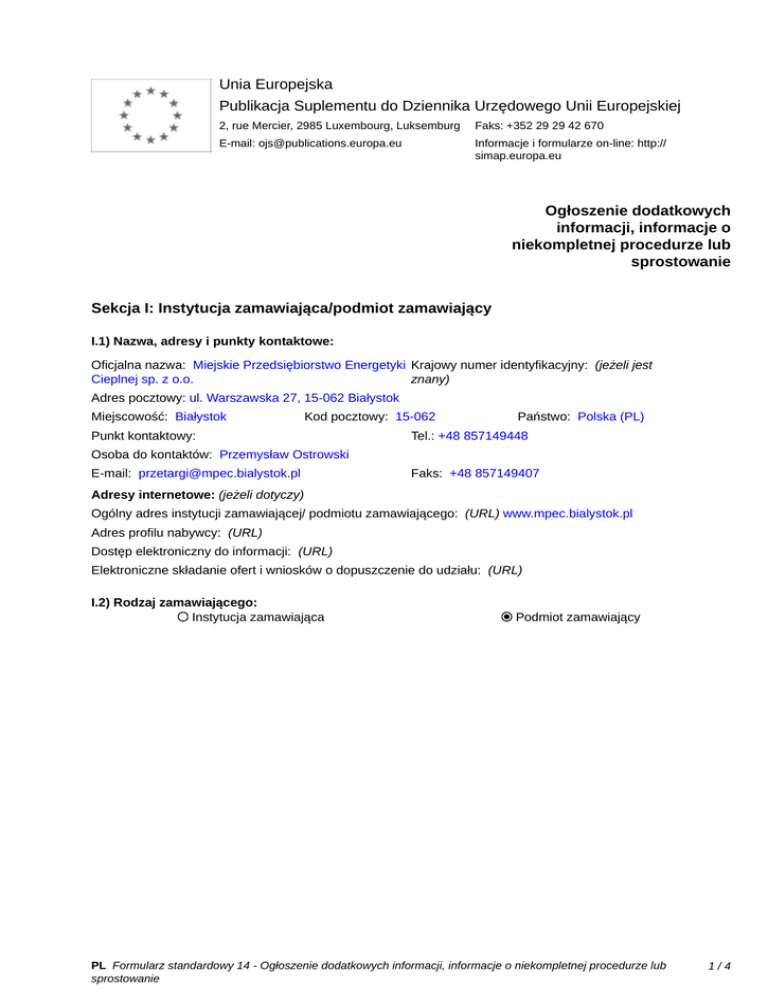 Unia Europejska Publikacja Suplementu do Dziennika Urzędowego Unii Europejskiej 2, rue Mercier, 2985 Luxembourg, Luksemburg Faks: +352 29 29 42 670 E-mail: [email protected] Informacje i formularze on-line: http:// simap.europa.eu Ogłoszenie dodatkowych informacji, informacje o niekompletnej procedurze lub sprostowanie Sekcja I: Instytucja zamawiająca/podmiot zamawiający I.1) Nazwa, adresy i punkty kontaktowe: Oficjalna nazwa: Miejskie Przedsiębiorstwo Energetyki Krajowy numer identyfikacyjny: (jeżeli jest Cieplnej sp. z o.o. znany) _____ Adres pocztowy: ul. Warszawska 27, 15-062 Białystok Miejscowość: Białystok Kod pocztowy: 15-062 Punkt kontaktowy: _____ Państwo: Polska (PL) Tel.: +48 857149448 Osoba do kontaktów: Przemysław Ostrowski E-mail: [email protected] Faks: +48 857149407 Adresy internetowe: (jeżeli dotyczy) Ogólny adres instytucji zamawiającej/ podmiotu zamawiającego: (URL) www.mpec.bialystok.pl Adres profilu nabywcy: (URL) _____ Dostęp elektroniczny do informacji: (URL) _____ Elektroniczne składanie ofert i wniosków o dopuszczenie do udziału: (URL) _____ I.2) Rodzaj zamawiającego: Instytucja zamawiająca Podmiot zamawiający PL Formularz standardowy 14 - Ogłoszenie dodatkowych informacji, informacje o niekompletnej procedurze lub sprostowanie 1/4 Sekcja II: Przedmiot zamówienia II.1.1) Nazwa nadana zamówieniu: Przebudowa sieci cieplnej magistralnej na odcinku od komory BK-219 do pkt Ł-2(P-66) o średnicy Dn900 o długości ok. 184 m. II.1.2) Krótki opis zamówienia lub zakupu: (podano w pierwotnym ogłoszeniu) Przebudowa sieci cieplnej magistralnej na odcinku od komory BK-219 do pkt Ł-2(P-66) o średnicy Dn900 o długości ok. 184 m. Uwaga: Odcinek sieci napowietrznej przy przejściu nad rzeką Białą od P-66(Ł2) do BKm-9(Ł4) należy wykonać zgodnie z aneksem do projektu wykonawczego na temat „Uzupełnienie do projektu przebudowy sieci cieplnej magistralnej 2xDn900 z odwodnieniami w rejonie ulic I Armii Wojska Polskiego, 1000lecia Państwa Polskiego i Radzymińskiej w Białymstoku – odcinki: Ł2(P66)—Ł4(Bkm-9)i Ł4(Bkm-9)—BK-219.” Przedmiot zamówienia obejmuje w szczególności: 1. demontaż istniejącej infrastruktury wraz z utylizacją materiałów z rozbiórki, 2. dostawę materiałów, 3. wykonanie robót budowlano-montażowych, 4. przywrócenie terenu do stanu pierwotnego. II.1.3) Wspólny Słownik Zamówień (CPV) Główny przedmiot Dodatkowe przedmioty Słownik główny 45231100 45231110 Słownik uzupełniający (jeżeli dotyczy) PL Formularz standardowy 14 - Ogłoszenie dodatkowych informacji, informacje o niekompletnej procedurze lub sprostowanie 2/4 Sekcja IV: Procedura IV.1)Rodzaj procedury (podano w pierwotnym ogłoszeniu) Otwarta Ograniczona Ograniczona przyspieszona Negocjacyjna Negocjacyjna przyspieszona Dialog konkurencyjny Negocjacyjna z uprzednim ogłoszeniem Negocjacyjna bez uprzedniego ogłoszenia Negocjacyjna z publikacją ogłoszenia o zamówieniu Negocjacyjna bez publikacji ogłoszenia o zamówieniu Udzielenie zamówienia bez uprzedniej publikacji ogłoszenia o zamówieniu w Dzienniku Urzędowym Unii Europejskiej IV.2)Informacje administracyjne IV.2.1)Numer referencyjny: (podano w pierwotnym ogłoszeniu) ZP-09/2014 IV.2.2)Dane referencyjne ogłoszenia w przypadku ogłoszeń przesłanych drogą elektroniczną: Pierwotne ogłoszenie przesłane przez eNotices TED eSender Login: ENOTICES_mpecspzoo Dane referencyjne ogłoszenia: 2015-051146 rok i numer dokumentu IV.2.3)Ogłoszenie, którego dotyczy niniejsza publikacja: Numer ogłoszenia w Dz.U.: _____ z dnia: ______ (dd/mm/rrrr) IV.2.4)Data wysłania pierwotnego ogłoszenia: 17/04/2015 (dd/mm/rrrr) PL Formularz standardowy 14 - Ogłoszenie dodatkowych informacji, informacje o niekompletnej procedurze lub sprostowanie 3/4 Sekcja VI: Informacje uzupełniające VI.1) Ogłoszenie dotyczy: Procedury niepełnej Sprostowania Informacji dodatkowych VI.2) Informacje na temat niepełnej procedury udzielenia zamówienia: Postępowanie o udzielenie zamówienia zostało przerwane Postępowanie o udzielenie zamówienia uznano za nieskuteczne Zamówienia nie udzielono Zamówienie może być przedmiotem ponownej publikacji VI.3) Informacje do poprawienia lub dodania : VI.3.1) Zmiana oryginalnej informacji podanej przez instytucję zamawiającą Publikacja w witrynie TED niezgodna z oryginalną informacją, przekazaną przez instytucję zamawiającą Oba przypadki VI.3.2) W ogłoszeniu pierwotnym W odpowiedniej dokumentacji przetargowej (więcej informacji w odpowiedniej dokumentacji przetargowej) W obu przypadkach (więcej informacji w odpowiedniej dokumentacji przetargowej) VI.3.3) Tekst, który należy poprawić w pierwotnym ogłoszeniu Miejsce, w którym znajduje się Zamiast: zmieniany tekst: Czas trwania zamówienia lub termin Punkt II.3 Ogłoszenia realizacji : Okres w dniach : 90 (od udzielenia zamówienia) VI.3.4) Daty, które należy poprawić w pierwotnym ogłoszeniu Miejsce, w którym znajdują się Zamiast: zmieniane daty: Powinno być: Czas trwania zamówienia lub termin realizacji : Okres w dniach : 104 (od udzielenia zamówienia) Powinno być: VI.3.5) Adresy i punkty kontaktowe, które należy poprawić VI.3.6) Tekst, który należy dodać do pierwotnego ogłoszenia Miejsce, w którym należy dodać tekst: Tekst do dodania: VI.4) Inne dodatkowe informacje: _____ VI.5) Data wysłania niniejszego ogłoszenia: 20/04/2015 (dd/mm/rrrr) - ID:2015-052255 PL Formularz standardowy 14 - Ogłoszenie dodatkowych informacji, informacje o niekompletnej procedurze lub sprostowanie 4/4