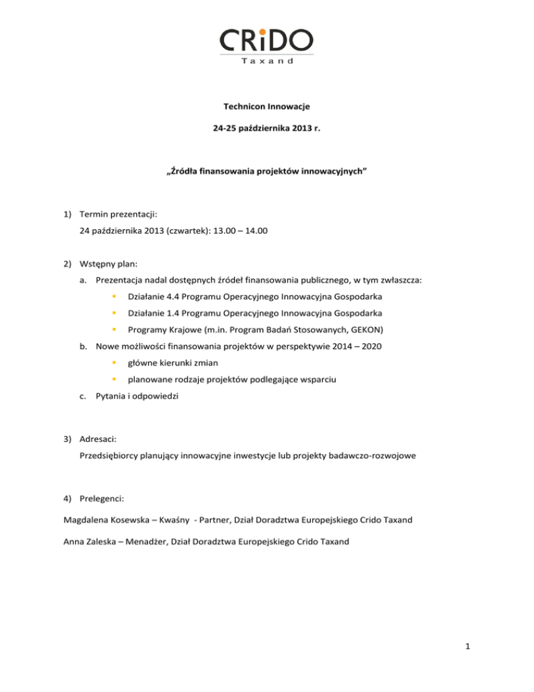 Technicon Innowacje 24-25 października 2013 r. „Źródła finansowania projektów innowacyjnych” 1) Termin prezentacji: 24 października 2013 (czwartek): 13.00 – 14.00 2) Wstępny plan: a. Prezentacja nadal dostępnych źródeł finansowania publicznego, w tym zwłaszcza: Działanie 4.4 Programu Operacyjnego Innowacyjna Gospodarka Działanie 1.4 Programu Operacyjnego Innowacyjna Gospodarka Programy Krajowe (m.in. Program Badań Stosowanych, GEKON) b. Nowe możliwości finansowania projektów w perspektywie 2014 – 2020 główne kierunki zmian planowane rodzaje projektów podlegające wsparciu c. Pytania i odpowiedzi 3) Adresaci: Przedsiębiorcy planujący innowacyjne inwestycje lub projekty badawczo-rozwojowe 4) Prelegenci: Magdalena Kosewska – Kwaśny - Partner, Dział Doradztwa Europejskiego Crido Taxand Anna Zaleska – Menadżer, Dział Doradztwa Europejskiego Crido Taxand 1 Magdalena Kosewska-Kwaśny Partner Specjalizuje się w pozyskiwaniu finansowania w formie dotacji i pożyczek dla przedsiębiorstw oraz zagadnieniach związanych z prawidłowym wykorzystaniem środków finansowych. Doradza i asystuje wielu polskim i międzynarodowym podmiotom w procesie pozyskiwania i wykorzystywania środków finansowych od 2003 r. Doświadczenie zawodowe zdobywała m.in. w ramach pracy w Dziale Doradztwa Europejskiego Ernst & Young oraz w Market Support Centre - Global Incentives Advisor Ernst & Young w Brukseli, gdzie nabyła praktyczne doświadczenie związane z ubieganiem się o wsparcie dla przedsiębiorstw w ramach programów krajowych, funduszy strukturalnych Unii Europejskiej, jak również Programów Wspólnotowych, m.in. LIFE Środowisko, Marco Polo. W Zespole Doradztwa Europejskiego EAST pracuje od listopada 2005 r. Posiada szerokie doświadczenie w zakresie korzystania przez przedsiębiorców z pomocy publicznej na realizację projektów inwestycyjnych, badawczo-rozwojowych oraz inwestycji związanych z ochroną środowiska, w tym w sektorze energetyki. Absolwentka Politechniki Warszawskiej Wydziału Inżynierii Produkcji w zakresie Systemów informatycznych i zarządzania przedsiębiorstwem oraz studiów podyplomowych Szkoły Głównej Handlowej na kierunku Zarządzanie finansami przedsiębiorstwa. Jest autorką licznych artykułów i publikacji z zakresu krajowych i unijnych środków pomocowych, m.in. w Harvard Business Review, Rzeczpospolitej, Pulsie Biznesu oraz C.H. Beck. Anna Zaleska Menadżer W Zespole EAST od sierpnia 2007 r. Specjalizuje się w pozyskiwaniu pomocy publicznej dla przedsiębiorstw na realizację innowacyjnych inwestycji, projektów badawczo-rozwojowych, inwestycji związanych z ochroną środowiska, w tym w sektorze energetyki, a także w pozyskiwaniu pomocy w ramach Specjalnych Stref Ekonomicznych. Ponadto posiada szerokie doświadczenie w rozliczaniu projektów współfinansowanych ze środków publicznych. Absolwentka Wydziału Prawa i Administracji Uniwersytetu Łódzkiego na kierunku Administracja (specjalizacja: Administracja Gospodarcza) oraz Podyplomowego Studium Zarządzania Finansami Przedsiębiorstw Szkoły Głównej Handlowej. Posiada certyfikat zarządzania projektami PRINCE2. Jest autorką artykułów o tematyce związanej z procesem pozyskiwania wsparcia finansowego ze środków pomocy publicznej, a także procesem rozliczania dofinansowanych projektów m.in. dla magazynu Fundusze Europejskie, miesięcznika Forbes i dziennika „Rzeczpospolita”. 2 Usługi Crido Taxand Cały zespół Crido Taxand liczy niemal 80 osób działających w następujących obszarach: Doradztwo europejskie, Doradztwo podatkowe, Doradztwo biznesowe / Corporate Social Responsibility, Doradztwo prawne. Zespół Doradztwa Europejskiego (EAST) Zespół Doradztwa Europejskiego działający w ramach międzynarodowej sieci Taxand od 2006 r. świadczy usługi w zakresie pozyskiwania pomocy publicznej z funduszy europejskich oraz innych źródeł, m.in. granty rządowe, pożyczki preferencyjne, zwolnienia podatkowe. W latach 2009 – 2012 r. Zespół EAST był co roku uznawany za najskuteczniejszy w Polsce w pozyskiwaniu pomocy publicznej dla przedsiębiorstw w rankingach firm doradczych organizowanych przez magazyn „Forbes” oraz magazyn „Fundusze Europejskie”, zajmując 1. Miejsce w kategoriach: Ranking Forbes: „Doradcy dla firm – programy ogólnopolskie”, „Dotacje dla dużych firm”, „Dotacje na Inwestycje” (2009, 2010); Ranking Funduszy Europejskich: „Wysokość dotacji dla przedsiębiorstw” „Wysokość dotacji w ramach Programu Operacyjnego Innowacyjna Gospodarka”, „Dotacje dla dużych przedsiębiorstw” (2010, 2011, 2012). Wybrane sukcesy EAST w latach 2007-2013 W 2008 r. podczas pierwszej rundy aplikacyjnej w ramach Działania 4.4 PO IG 11 wniosków przygotowanych i złożonych przez EAST otrzymało wsparcie. W sumie Doradcy EAST w ramach tylko jednej rundy pozyskali dla swoich klientów ponad 185 mln PLN. W ramach drugiej rundy aplikacyjnej Doradcy EAST pozyskali ponad 225 mln PLN. W ramach Poddziałania 4.5.1 PO IG Doradcy EAST pozyskali największe w historii granty przyznane w Polsce w kwotach ponad 131 mln PLN, 150 mln PLN oraz 206 mln PLN na dofinansowanie nowych inwestycji planowanych przez międzynarodowe koncerny będące liderami w branży gumowej, papierniczej oraz w branży produkcji biopaliw. W ramach rundy aplikacyjnej do Poddziałania 4.5.1 PO IG (listopad 2010 r.) EAST pozyskał dla swoich klientów ponad 523 mln PLN. W ramach Poddziałania 4.5.2 PO IG w latach 2008-2010 Doradcy EAST pomogli swoim klientom pozyskać ponad 218 mln PLN na realizację planowanych inwestycji, w tym pozyskali jeden z największych grantów na centrum B+R w wysokości 9,92 mln PLN. EAST w ramach Programu Operacyjnego Infrastruktura i Środowisko uzyskał dla swoich klientów ponad 150 mln PLN. Doradcy EAST posiadają bogate doświadczenie oraz wysoką skuteczność w zakresie ubiegania się o zezwolenia na prowadzenie działalności gos