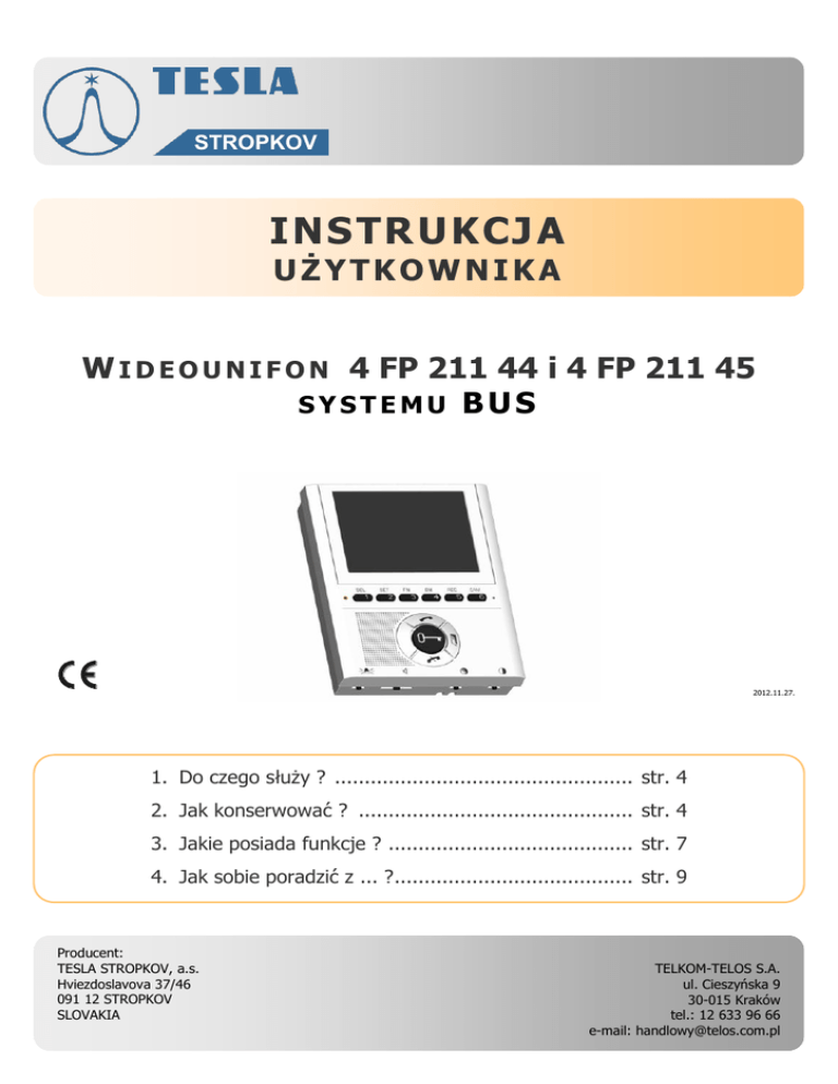 STROPKOV IN STRUKCJ A UŻYTKOWNIKA W I D E O U N I F O N 4 FP 211 44 i 4 FP 211 45 SYSTEMU BUS 2012.11.27. 1. Do czego służy ? .................................................. str. 4 2. Jak konserwować ? .............................................. str. 4 3. Jakie posiada funkcje ? ......................................... str. 7 4. Jak sobie poradzić z ... ?........................................ str. 9 Producent: TESLA STROPKOV, a.s. Hviezdoslavova 37/46 091 12 STROPKOV SLOVAKIA TELKOM-TELOS S.A. ul. Cieszyńska 9 30-015 Kraków tel.: 12 633 96 66 e-mail: [email protected] 1 2 4 3 5 14 17 15 Video gain adjustment 6 8 7 16 Balance 9 12 13 14 10 14 GND BZV 15V GND BUS2 BUS1 GND +18V BUZ 14 + KAM VKAM VOUT VdinVdoutVdin + Vdout + 11 Przełącznik regulacji głośności sygnału dzwonka Przycisk sterowania dodatkowym urządzeniem Potencjometr głośności rozmowy Przycisk zakończenia rozmowy „OFF” Przełącznik regulacji nasycenia koloru obrazu Przycisk zaczepu elektromagnetycznego Przełącznik regulacji kontrastu obrazu Głośnik Wyświetlacz 14 Punkty montażu urządzenia na ścianie Dioda sygnalizacyjna LED 15 Otwór regulacji wzmocnienia sygnału wideo Przyciski wyboru / sterowania dodatkowa kamerą 16 Otwór regulacji sprzężenia sygnału audio Mikrofon 17 Złącze Przycisk odbioru rozmowy „ON” Rys. 1. Rozmieszczenie elementów wideounifonu 4 FP 211 44. Instrukcja użytkownika wideounifonu 4 FP 211 44 i 4 FP 211 45 Strona 2 1 2 4 3 14 5 17 Video gain adjustment 6 8 7 16 Balance 9 14 12 13 15 10 14 GND BZV 15V GND BUS2 BUS1 GND +18V BUZ 14 + KAM VKAM VOUT VdinVdoutVdin + Vdout + 11 Przełącznik regulacji głośności sygnału dzwonka Przycisk sterowania dodatkowym urządzeniem Potencjometr głośności rozmowy Przycisk zakończenia rozmowy „OFF” Przełącznik regulacji nasycenia koloru obrazu Przycisk zaczepu elektromagnetycznego Przełącznik regulacji kontrastu obrazu Głośnik Wyświetlacz 14 Punkty montażu urządzenia na ścianie Dioda sygnalizacyjna LED 15 Otwór regulacji wzmocnienia sygnału wideo Przyciski wyboru / sterowania dodatkowa kamerą 16 Otwór regulacji sprzężenia sygnału audio Mikrofon 17 Złącze Przycisk odbioru rozmowy „ON” Rys. 2. Rozmieszczenie elementów wideounifonu 4 FP 211 45. Instrukcja użytkownika wideounifonu 4 FP 211 44 i 4 FP 211 45 Strona 3 1. Do czego służy ? Wideounifon głośnomówiący 4 FP 211 44, 45 służy do wideo komunikacji z wideobramofonem, załączania zaczepu elektromagnetycznego, zapewnienia łączności interkomowej z innymi unifonami / wideounifonami oraz spełnia funkcję dzwonka drzwiowego. Można do niego podłączyć maksymalnie 3 dodatkowe wideounifony, które mają z punktu widzenia użytkownika takie same własności jak główny. Do jednego mieszkania można więc zamontować 4 wideounifony. Wideounifon 4 FP 211 44, 45 jest przeznaczony do współpracy z wideobramofonami 4 FN 231 06, 4 FN 231 07, z modułami bramofonu 4 FN 230 35, 4 FN 230 38, 4 FN 230 39, 4 FN 230 63, 4 FN 230 97, 4 FN 230 98 oraz unifonami 4 FP 110 83 i 4 FP 211 03. Posiada 6 przycisków funkcyjnych, przycisk z symbolem klucza do otwierania zaczepu elektromagnetycznego, przycisk do sterowania urządzeniem dodatkowym, potencjometr do ustawiania głośności dźwięku z głośnika i przełączniki do ustawiania głośności sygnału dzwonka oraz nasycenia kolorów i kontrastu obrazu. Akustyczna sygnalizacja wywołania jest realizowana w oparciu o przetwornik piezoelektryczny. Do wideounifonu można dodatkowo podłączyć dzwonek drzwiowy 4 FN 605 22 lub 4 FN 605 26. Wideounifon jest produkowany w dwóch kolorach: białym (4 FP 211 04.201, 4 FP 211 05.201) i kości słoniowej (4 FP 211 04.915, 4 FP 211 05.915). Wideounifon 4 FP 211 45 jest wyposażony w pamięć obrazu, umożliwiającą zapamiętanie 256 kolorowych obrazów. 2. Jak konserwować ? Wierzch urządzenia czyścić należy wyłącznie miękką tkaniną. Silne zabrudzenia należy czyścić miękką ściereczką nasączoną roztworem mydła. Po oczyszczeniu, wierzch urządzenia dokładnie wysuszyć za pomocą suchej ściereczki. Ochronne okienko wyświetlacza czyścić jedynie miękką tkaniną. Do czyszczenia nigdy nie używać cieczy na bazie benzenu i alkoholu albo ściereczek nasączonych substancjami chemicznymi. UWAGA ! Podczas montażu stosować należy zasady obowiązujące przy kontakcie z komponentami wrażliwymi na ładunki elektrostatyczne. Pozbywanie się opakowań po produkcie. W trosce o ochronę środowiska naturalnego, zalecamy opakowanie po produkcie dostarczyć do odpowiedniego miejsca zbiórki odpadów w celu poddania ich procesowi recyklingu. Tektura Papier Torba PE Folia PE Pozbywanie się starych urządzeń elektrycznych. Europejska Dyrektywa 2002/96/EC dotycząca Zużytych Elektrycznych i Elektronicznych Urządzeń (WEEE) zakłada zakaz pozbywania się starych urządzeń domowego użytku jako nieposortowanych śmieci komunalnych. Zużyte urządzenia muszą być osobno zbierane i sortowane w celu zoptymalizowania odzyskiwania oraz ponownego przetworzenia pewnych komponentów i materiałów. Pozwala to ograniczyć zanieczyszczenie środowiska i pozytywnie wpływa na ludzkie zdrowie. Przekreślony symbol „kosza” umieszczony na produkcie przypomina klientowi o obowiązku specjalnego sortowania. Konsumenci powinni kontaktować się z władzami lokalnymi lub sprzedawcą w celu uzyskania informacji dotyczących postępowania z ich zużytymi urządzeniami elektrycznymi i elektronicznymi. TESLA STROPKOV oświadcza niniejszym, że wszystkie urządzenia systemu KARAT spełniają główne wymogi kompatybilności elektromagnetycznej zgodnie z dyrektywą 89/336/EEC i wymogi bezpieczeństwa zgodnie z dyrektywą 73/23/EEC. Instrukcja użytkownika wideounifonu 4 FP 211 44 i 4 FP 211 45 Strona 4 3. Jakie posiada funkcje ? 3.1. Sygnalizacja dźwiękowa (dzwonienie). Wideounifon udostępnia 4 rodzaje sygnalizacji dźwiękowej: od bramofonu / wideobramofonu, od