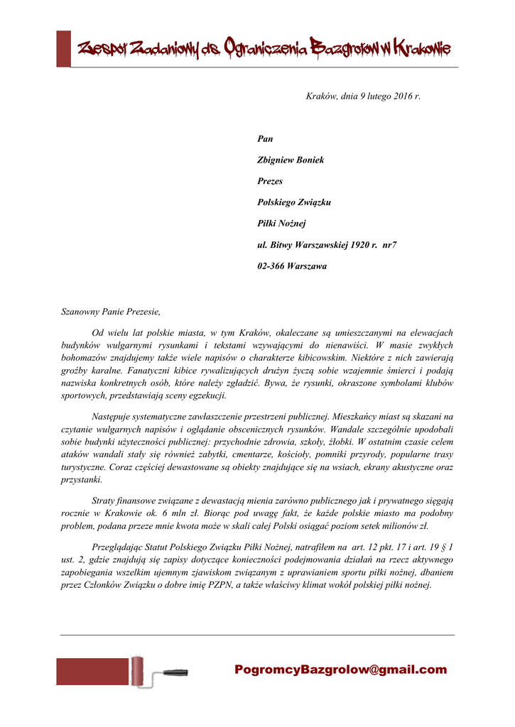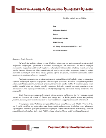 Kraków, dnia 9 lutego 2016 r. Pan Zbigniew Boniek Prezes Polskiego Związku Piłki Nożnej ul. Bitwy Warszawskiej 1920 r. nr7 02-366 Warszawa Szanowny Panie Prezesie, Od wielu lat polskie miasta, w tym Kraków, okaleczane są umieszczanymi na elewacjach budynków wulgarnymi rysunkami i tekstami wzywającymi do nienawiści. W masie zwykłych bohomazów znajdujemy także wiele napisów o charakterze kibicowskim. Niektóre z nich zawierają groźby karalne. Fanatyczni kibice rywalizujących drużyn życzą sobie wzajemnie śmierci i podają nazwiska konkretnych osób, które należy zgładzić. Bywa, że rysunki, okraszone symbolami klubów sportowych, przedstawiają sceny egzekucji. Następuje systematyczne zawłaszczenie przestrzeni publicznej. Mieszkańcy miast są skazani na czytanie wulgarnych napisów i oglądanie obscenicznych rysunków. Wandale szczególnie upodobali sobie budynki użyteczności publicznej: przychodnie zdrowia, szkoły, żłobki. W ostatnim czasie celem ataków wandali stały się również zabytki, cmentarze, kościoły, pomniki przyrody, popularne trasy turystyczne. Coraz częściej dewastowane są obiekty znajdujące się na wsiach, ekrany akustyczne oraz przystanki. Straty finansowe związane z dewastacją mienia zarówno publicznego jak i prywatnego sięgają rocznie w Krakowie ok. 6 mln zł. Biorąc pod uwagę fakt, że każde polskie miasto ma podobny problem, podana przeze mnie kwota może w skali całej Polski osiągać poziom setek milionów zł. Przeglądając Statut Polskiego Związku Piłki Nożnej, natrafiłem na art. 12 pkt. 17 i art. 19 § 1 ust. 2, gdzie znajdują się zapisy dotyczące konieczności podejmowania działań na rzecz aktywnego zapobiegania wszelkim ujemnym zjawiskom związanym z uprawianiem sportu piłki nożnej, dbaniem przez Członków Związku o dobre imię PZPN, a także właściwy klimat wokół polskiej piłki nożnej. [email protected] Jako Przewodniczący krakowskiego Zespołu Zadaniowego ds. Ograniczenia Bazgrołów w Krakowie uprzejmie proszę o podanie informacji, czy wśród tych zadań znajdują się lub są prowadzone prace na rzecz ograniczenia dewastacji polskich miast bazgrołami o treści pseudokibicowskiej. Autorzy wulgarnych napisów manifestują najczęściej w ten sposób swoje sympatie i przywiązanie do różnych drużyn piłkarskich. Można spodziewać się, że zawodnicy tych klubów są dla wandali idolami i autorytetami – być może jedynymi. Istnieje zatem prawdopodobieństwo, że wyrażona przez zawodników w sposób kategoryczny i nie pozostawiający miejsca na wątpliwości dezaprobata dla dewastacji mogłaby odnieść pozytywny skutek, polegający, jeśli nie na całkowitej eliminacji tego zjawiska, to na jego ograniczeniu. Wielokrotnie postawa naszych zawodników budziła naszą dumę narodową. Wielu ludzi jest związana „na dobre i złe” ze swoją ukochaną drużyną i nie zgadza się na eskalację szkodliwej działalności tzw „kiboli”, którzy swoim zachowaniem obniżają rangę wydarzeń sportowych i godzą w dobre imię sportu. Mam nadzieję i liczę na to, że PZPN przyłączy się do akcji pod nazwą Pogromcy Bazgrołów w celu ograniczenia tej narodowej plagi. Oczami wyobraźni widziałbym kampanię społeczną z udziałem gwiazd polskiej piłki nożnej. Można również zamieszczać odpowiednie hasła na tablicach świetlnych podczas rozgrywek sportowych. Wypracujmy wspólnie modę na schludny wygląd polskich miast. Uwolnijmy przestrzeń publiczną od terrorystów i agresorów ze sprejami. Ponieważ wszyscy jesteśmy ofiarami tych prześladowców, powinniśmy się zjednoczyć i wspólnie stawić czoło aktom dewastacji. Z poważaniem, Waldemar Domański Przewodniczący Zespołu Zadaniowego ds. Ograniczenia Bazgrołów w Krakowie Pogromca Bazgrołów [email protected] Jednocześnie informuję, że na podstawie Zarządzenia Nr 538/2015 Prezydenta Miasta Krakowa z dnia 9 marca 2015 r. pełnię funkcję Przewodniczącego Zespołu Zadaniowego ds Ograniczenia Bazgrołów w Krakowie. Na marginesie informuję też, że skierowałem list do Prezydenta Rzeczypospolitej Polskiej z prośbą o podjęcie działań na rzecz zmiany polskiego prawa w celu skutecznej walki z aktami wandalizmu (treść listu przesyłamy w załączeniu). Apel o podobnej treści wysłałem także do miast metropolitalnych oraz polskich parlamentarzystów. Dodatkowo informuję, że jestem założycielem nieformalnej grupy działającej pod nazwą Pogromcy Bazgrołów. Jest to koalicja ludzi dobrej woli: sąsiadów, artystów, a także urzędników i pracowników instytucji miejskich. Podczas organizowanych przez nas pikników sąsiedzkich pokrywamy „milczeniem farby” mowę nienawiści, bohomazy, swastyki, rasistowskie i antysemickie napisy na elewacjach krakowskich kamienic. Do akcji przyłączają się szkoły, spółdzielnie mieszkaniowe, zarządcy nieruchomości. Celem Pogromców Bazgrołów jest ograniczenie groźnego i szkodliwego zjawiska dewastowania przestrzeni publicznej poprzez wywołanie społecznej „mody” za odpowiedzialność za najbliższe otoczenie. Akcja Pogromców Bazgrołów została zauważona i docenione przez władze państwowe i lokalne, krakowskie i ogólnopolskie media. Poniżej zamieszczam linki do kilku artykułów prasowych o krakowskich bazgrołach, polskich bohomazach i działalności Pogromców Bazgrołów. http://krakow.wyborcza.pl/krakow/1,44425,19272334,wandale-atakuja-gdy-ludzie-sie-znaja-lepiejsie-chronia.html#BoxLokKrakLink http://www.dziennikpolski24.pl/artykul/8115483,pogromcy-pomogli-zakonnikom,id,t.html http://wawalove.pl/Swastyka-na-tablicy-upamietniajacej-getto-Jak-to-zobaczylam-to-sie-rozplakalama21022 http://www.gazetakrakowska.pl/artykul/4702800,tatry-kibice-slaska-wroclaw-oszpecili-zboczazawratu-wideo,id,t.html#! http://wpolityce.pl/polityka/273202-list-do-patriotow-ten-kto-pali-kukly-albo-niszczy-mury antysemickimi-napisami-nie-moze-byc-uwazany-za-patriote http://