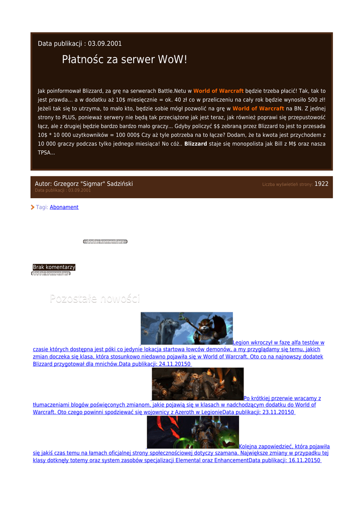 Płatnośc za serwer WoW! Pozostałe nowości