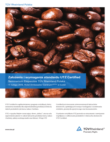 TÜV Rheinland Polska Założenia i wymagania standardu UTZ Certified Seminarium Eksperckie TÜV Rheinland Polska 11 lutego 2016, Hotel Ambasador Centrum**** w Łodzi UTZ Certified to ogólnoświatowy program certyfikacji, który ustanawia standardy dla odpowiedzialnej produkcji rolniczej takich produktów jak kawa, kakao i herbata. Certified jest stworzenie zrównoważonych łańcuchów dostawców, spełniających rosnące wymagania i oczekiwania rolników, przemysłu spożywczego oraz konsumentów. UTZ, w języku Majów oznaczający słowo „dobry”, ma na celu zapewnienie jakości w całym łańcuchu produkcji kawy, kakao i herbaty, jakiej oczekują marki oraz klienci. Wizją UTZ Uzyskanie certyfikatu UTZ pozwala na utrzymanie i nawiązanie współpracy z odbiorcami produktów w łańcuchu dostawców UTZ Certified. www.tuv.pl Adresaci seminarium Seminarium kierujemy do kadry zarządzającej i kierowniczej, pełnomocników systemów zarządzania, menadżerów kontroli jakości, technologów żywności, a także konsultantów w firmach przetwarzających i produkujących wyroby z kakao, kawy i herbaty. Osoba prowadząca Joanna Kończyk Specjalista ds. Certyfikacji Świadczenia dla uczestników i koszty Uczestnictwo w seminarium: • 600 zł/ 1 osobę + 23% VAT - cena dla uczestników nie będących Klientami TÜV Rheinland Polska • Cena za udział w seminarium zawiera: • materiały informacyjne • bufet kawowy • lunch 400 zł/ 1 osobę + 23% VAT - cena dla Klientów i Partnerów TÜV Rheinland Polska • kolacja Harmonogram 11 luty 2016 10:00 - 11:00 Rejestracja uczestników 11:00 - 12:00 Misja i wizja UTZ Certified, struktura standardu 12:00 - 12:10 Przerwa kawowa 12:10 - 13:30 Omówienie dokumentów standardu UTZ Certified (Protokół Certyfikacji, standardy dla poszczególnych produktów oraz Polityka Znakowania UTZ) 13:30 - 14:10 Obiad 14:10 - 15:10 Poziomy Identyfikowalności: Zachowana Identyfikacja, Segregacja, Bilans Masy 15:10 - 15:20 Przerwa kawowa 15:20 - 17:20 Proces certyfikacji i wymagania listy kontrolnej 17:20 - 17:30 Przerwa kawowa 17:30 - 18:00 Funkcjonalność portalu UTZ Good Inside Portal 18:00 - 18:30 Standardy socjalne 19:00 Kolacja Osoba kontaktowa Joanna Kończyk tel: +48 89 651 08 82 mail: [email protected]