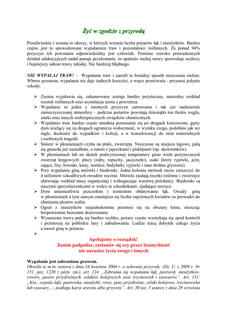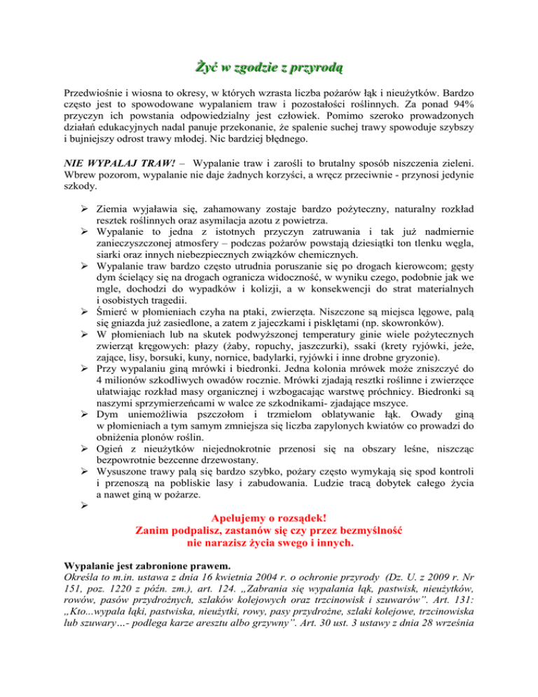 ŻŻyyćć w w zzggooddzziiee zz pprrzzyyrrooddąą Przedwiośnie i wiosna to okresy, w których wzrasta liczba pożarów łąk i nieużytków. Bardzo często jest to spowodowane wypalaniem traw i pozostałości roślinnych. Za ponad 94% przyczyn ich powstania odpowiedzialny jest człowiek. Pomimo szeroko prowadzonych działań edukacyjnych nadal panuje przekonanie, że spalenie suchej trawy spowoduje szybszy i bujniejszy odrost trawy młodej. Nic bardziej błędnego. NIE WYPALAJ TRAW! – Wypalanie traw i zarośli to brutalny sposób niszczenia zieleni. Wbrew pozorom, wypalanie nie daje żadnych korzyści, a wręcz przeciwnie - przynosi jedynie szkody. Ziemia wyjaławia się, zahamowany zostaje bardzo pożyteczny, naturalny rozkład resztek roślinnych oraz asymilacja azotu z powietrza. Wypalanie to jedna z istotnych przyczyn zatruwania i tak już nadmiernie zanieczyszczonej atmosfery – podczas pożarów powstają dziesiątki ton tlenku węgla, siarki oraz innych niebezpiecznych związków chemicznych. Wypalanie traw bardzo często utrudnia poruszanie się po drogach kierowcom; gęsty dym ścielący się na drogach ogranicza widoczność, w wyniku czego, podobnie jak we mgle, dochodzi do wypadków i kolizji, a w konsekwencji do strat materialnych i osobistych tragedii. Śmierć w płomieniach czyha na ptaki, zwierzęta. Niszczone są miejsca lęgowe, palą się gniazda już zasiedlone, a zatem z jajeczkami i pisklętami (np. skowronków). W płomieniach lub na skutek podwyższonej temperatury ginie wiele pożytecznych zwierząt kręgowych: płazy (żaby, ropuchy, jaszczurki), ssaki (krety ryjówki, jeże, zające, lisy, borsuki, kuny, nornice, badylarki, ryjówki i inne drobne gryzonie). Przy wypalaniu giną mrówki i biedronki. Jedna kolonia mrówek może zniszczyć do 4 milionów szkodliwych owadów rocznie. Mrówki zjadają resztki roślinne i zwierzęce ułatwiając rozkład masy organicznej i wzbogacając warstwę próchnicy. Biedronki są naszymi sprzymierzeńcami w walce ze szkodnikami- zjadające mszyce. Dym uniemożliwia pszczołom i trzmielom oblatywanie łąk. Owady giną w płomieniach a tym samym zmniejsza się liczba zapylonych kwiatów co prowadzi do obniżenia plonów roślin. Ogień z nieużytków niejednokrotnie przenosi się na obszary leśne, niszcząc bezpowrotnie bezcenne drzewostany. Wysuszone trawy palą się bardzo szybko, pożary często wymykają się spod kontroli i przenoszą na pobliskie lasy i zabudowania. Ludzie tracą dobytek całego życia a nawet giną w pożarze. Apelujemy o rozsądek! Zanim podpalisz, zastanów się czy przez bezmyślność nie narazisz życia swego i innych. Wypalanie jest zabronione prawem. Określa to m.in. ustawa z dnia 16 kwietnia 2004 r. o ochronie przyrody (Dz. U. z 2009 r. Nr 151, poz. 1220 z późn. zm.), art. 124. „Zabrania się wypalania łąk, pastwisk, nieużytków, rowów, pasów przydrożnych, szlaków kolejowych oraz trzcinowisk i szuwarów”. Art. 131: „Kto...wypala łąki, pastwiska, nieużytki, rowy, pasy przydrożne, szlaki kolejowe, trzcinowiska lub szuwary…- podlega karze aresztu albo grzywny”. Art. 30 ust. 3 ustawy z dnia 28 września 1991 r. o lasach (Dz. U. z 2011 r. Nr 12, poz. 59 z późn. zm.)"w lasach oraz na terenach śródleśnych, jak również w odległości do 100m od granicy lasu, zabrania się działań i czynności mogących wywołać niebezpieczeństwo, a w szczególności: 1. rozniecenia poza miejscami wyznaczonymi do tego celu przez właściciela lasu lub nadleśniczego, 2. korzystania z otwartego płomienia, 3. wypalania wierzchniej warstwy gleby i pozostałości roślinnych”. Ustawa z dnia 2 grudnia 1994 r. - Kodeks wykroczeń. Za wykroczenia tego typu grożą surowe sankcje: Art. 82 ustawy z dnia 20 maja 1971r. Kodeksu wykroczeń (Dz. U. z 2010 r. Nr 46, poz. 275 z późn. zm.) – kara aresztu, nagany lub grzywny, której wysokość w myśl art. 24, § 1 może wynosić od 20 do 5000 zł. Art. 163. § 1 ustawy z dnia 6 czerwca 1997 r. Kodeks karny (Dz. U. z 1997r. Nr 88 poz. 553 ze zmianami) stanowi: „Kto sprowadza zdarzenie, które zagraża życiu lub zdrowiu wielu osób albo mieniu w wielkich rozmiarach, mające postać pożaru, podlega karze pozbawienia wolności od roku do lat 10” W walkę ze zjawiskiem wiosennego wypalania traw włączyła się także Unia Europejska. Założenia polityki rolnej UE regulują między innymi zagadnienia ochrony środowiska w rolnictwie. Jednym z narzędzi umożliwiających dokonywanie pozytywnych przemian w tym sektorze jest system dopłat bezpośrednich. Ta forma wsparcia unijnego, zobowiązuje użytkownika gruntów do ich utrzymania zgodnie z normami tzn. w dobrej kulturze rolnej - art. 7 ust. 1 pkt 2a Ustawa z dnia 26 stycznia 2007 r. o płatnościach w ramach systemów wsparcia bezpośredniego (Dz.U. z 2008 r. Nr 170, poz. 1051 z późn. zm.) NIE ZRYWAJ KWIATÓW POD OCHRONĄ! – Celem ochrony roślin jest zachowanie różnorodności biologicznej i stabilności ekosystemów. Z każdym rokiem, w wyniku nierozważnej działalności człowieka, szereg gatunków roślin znika z powierzchni ziemi. Wiele gatunków roślin wyginęło już bezpowrotnie z naszego otoczenia w związku z tym musimy robić wszystko, by powstrzymać degradację środowiska i ocalić gatunki, którym grozi wyginięcie. Należy pamiętać, że znajdują się one nie tylko w zamkniętych rezerwatach przyrody, ale bardzo często rosną wokół nas. Pełny spis roślin objętych ochroną znajduje się w Polskiej Czerwonej Księdze Roślin. Gatunków chronionych nie wolno niszczyć, zrywać, zbierać, niszczyć ich siedlisk, sprzedawać, nabywać. Rodzicu – Wybierając się na wiosenne spacery pamiętaj że, krokusy, przebiśniegi, przylaszczki, konwalie, zawilce i sasanki są pod ochroną. http://www.straz.gov.pl http://pl.wikipedia.org/wiki/Ochrona_gatunkowa http://pl.wikipedia.org/wiki/Lista_gatunk opracowała mgr M. M. Świderska