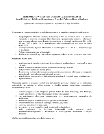 PRZEDMIOTOWY SYSTEM OCENIANIA Z INFORMATYKI Zespół Szkół nr 1 Publiczne Gimnazjum nr 5 im. I.J. Paderewskiego w Siedlcach opracowała i stosuje na zajęciach z informatyki p. mgr Ewa Wiak Przedmiotowy system oceniania został skonstruowany w oparciu o następujące dokumenty: Rozporządzenie Ministra Edukacji Narodowej z dnia 30 kwietnia 2007 r. w sprawie warunków i sposobu oceniania, klasyfikowania i promowania uczniów i słuchaczy oraz przeprowadzania sprawdzianów i egzaminów w szkołach publicznych (Dz. U. Nr 83, poz. 562, z późn. zm.) - ujednolicony tekst rozporządzenia wg stanu na dzień 01.09.2009 Wewnątrzszkolny System Oceniania w Gimnazjum nr 5 im I. J. Paderewskiego w Siedlcach. Podstawę programową z informatyki. Realizowany materiał wg zatwierdzonego przez dyrektora szkoły programu nauczania. Ocenianie ma na celu: poinformowanie ucznia o poziomie jego osiągnięć edukacyjnych i postępach w tym zakresie, pomoc uczniowi w samodzielnym planowaniu własnego rozwoju, motywowanie ucznia do dalszej pracy, dostarczenie rodzicom (prawnym opiekunom) i nauczycielom informacji o postępach, trudnościach i specjalnych uzdolnieniach ucznia, umożliwienie nauczycielom doskonalenia organizacji i metod pracy dydaktyczno wychowawczej. Ocenianie ucznia w procesie kształcenia informatyki powinno wiązać się z szukaniem odpowiedzi na pytanie, w jakim stopniu w obrębie danego konkretnego zagadnienia programowego uczeń: 1. rozumie pojęcia z nim związane, potrafi podać dla nich przykłady, zna definicje, potrafi uczestniczyć w klasyfikowaniu i definiowaniu pojęć; 2. zna podstawowe algorytmy postępowania przy rozwiązywaniu standardowych problemów; 3. umie rozwiązywać problemy o wyższym stopniu trudności; 4. opanował materiał nauczania z danego semestru, czy roku; 5. aktywnie uczestniczy w zajęciach; 6. uczestniczy w pracy pozalekcyjnej, konkursach, olimpiadach; 7. umie posługiwać się językiem informatyki, umie stosować swoje wiadomości i umiejętności z informatyki w rozwiązywaniu problemów z innych dziedzin. Ogólne składniki stanowiące przedmiot oceny to: zakres wiadomości i umiejętności, rozumienie materiału naukowego, umiejętność stosowania wiedzy, kultura przekazywania wiadomości. Oceny są jednocześnie informacją dla rodziców, wychowawcy klasy, dyrektora szkoły i nadzoru pedagogicznego: efektywności procesu nauczania i uczenia się, wkładzie uczniów w pracę nad własnym rozwojem, postępach uczniów Jawność ocen 1. Nauczyciel na początku każdego roku szkolnego poinformuje uczniów i ich rodziców (prawnych opiekunów) o wymaganiach edukacyjnych wynikających z realizowanego przez niego programu nauczania oraz o sposobach sprawdzania osiągnięć edukacyjnych uczniów. 2. Oceny są jawne zarówno dla ucznia jak i jego rodziców (prawnych opiekunów). Sprawdzone i ocenione prace kontrolne uczeń i jego rodzice (prawni opiekunowie) mogą otrzymać do wglądu do końca danego roku szkolnego. 3. Na miesiąc przed końcowym (semestralnym) klasyfikacyjnym posiedzeniem rady pedagogicznej nauczyciel wystawia w dzienniku przewidywane oceny klasyfikacyjne. I. Cele edukacyjne: Rozwijanie zainteresowań technikami informatycznymi. Kształtowanie umiejętności wykorzystywania poznanych wiadomości i umiejętności informatycznych w życiu codziennym i przyszłej pracy zawodowej. Wyrobienie nawyków stosowania programów multimedialnych oraz Internetu do pogłębiania wiedzy z różnych dziedzin nauki i rozwoju osobistego ucznia. Umiejętne współdziałanie w zespole. Integrowanie wiedzy informatycznej z innymi przedmiotami. Kształtowanie zasad ergonomicznej pracy przy komputerze. II. Obszary podlegające ocenie: Badanie umiejętności ucznia z informatyki odbywa się przy komputerze, dlatego każdy sprawdzian lub test planowany jest jako praktyczny - uczeń wykonuje zadania korzystając z komputera i odpowiedniego oprogramowania; forma zadań nie odbiega od ćwiczeń, które uczniowie wykonują na zajęciach. Badanie wiadomości ucznia z informatyki odbywa się w formie pisemnej, dlatego każdy sprawdzian lub kartkówka (komputerówka) planowana jest w formie pisemnej lub testu elektronicznego – uczeń odpowiada na pytania korzystając z zasobów wiedzy zdobytej na lekcji i utrwalonej w domu; pytania są zgodne z programem nauczania, oraz wiadomościami zdobytymi na zajęciach. Sprawdzanie umiejętności dotyczy: Rozwiązywania problemów za pomocą komputera, Łączenia umiejętności praktycznych z wiedzą teoretyczną oraz znajomości podstawowych metod pracy na komputerze, Znajomości wspólnych dla różnych programów mechanizmów i podstawowych pojęć i metod informatyki, Aktywności na lekcjach, Praca twórcza wkraczająca poza zakres programowy (praca własna), Udział w konkursach, Ze względu na specyfikę przedmiotu (wymagania sprzętowe) ocena pracy domowej lub zagadnień powtórzeniowych z lat ubiegłych nie jest w znaczącym stopniu uwzględniana przy wystawianiu ocen semestralnych jednakże jest brana pod uwagę przy wystawianiu ocen końcowych. III. Sposoby sprawdzania osiągnięć uczniów: Ocenianie bieżącej pracy ucznia na lekcji, Ocena projektu grupowego, Sprawdzian teoretyczny Sprawdzian praktyczny. Uczeń może poprawić jedną niekorzystną dla siebie ocenę z pisemnej pracy klasowej, w terminie ustalonym przez nauczyciela. Uczeń nieobecny dłużej niż 7 dni (nieobecność usprawiedliwiona) ma prawo do uzupełnienia zaległości powstałych w tym okresie; wykonuje pracę w terminie ustalonym przez nauczyciela. Pozostałe sprawdziany (kartkówki) nie podlegają poprawie. O postępach uczniów w nauce rodzice informowani są podczas zebrań rodziców, rozmów indywidualnych, poprzez comiesięczny wpis do dzienniczka ucznia przez wychowawcę. IV. Tryb oceniania: Rok szkolny dzieli się na dwa semestry. Oceny bieżące, oceny klasyfikacyjne śródroczne i oceny klasyfikacyjne końcowe w stopniu wg skali 1-6. W 