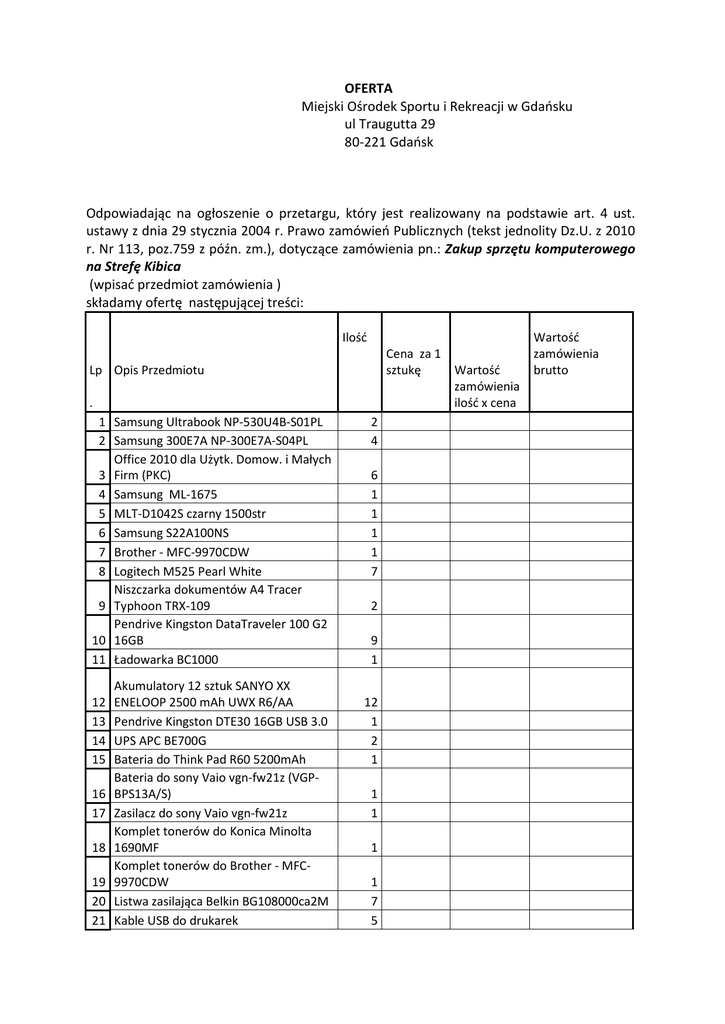 OFERTA Miejski Ośrodek Sportu i Rekreacji w Gdańsku ul Traugutta 29 80-221 Gdańsk Odpowiadając na ogłoszenie o przetargu, który jest realizowany na podstawie art. 4 ust. ustawy z dnia 29 stycznia 2004 r. Prawo zamówień Publicznych (tekst jednolity Dz.U. z 2010 r. Nr 113, poz.759 z późn. zm.), dotyczące zamówienia pn.: Zakup sprzętu komputerowego na Strefę Kibica (wpisać przedmiot zamówienia ) składamy ofertę następującej treści: Ilość Cena za 1 sztukę Wartość zamówienia ilość x cena Lp Opis Przedmiotu . 1 Samsung Ultrabook NP-530U4B-S01PL 2 Samsung 300E7A NP-300E7A-S04PL Office 2010 dla Użytk. Domow. i Małych 3 Firm (PKC) 4 Samsung ML-1675 5 MLT-D1042S czarny 1500str 6 Samsung S22A100NS 7 Brother - MFC-9970CDW 8 Logitech M525 Pearl White Niszczarka dokumentów A4 Tracer 9 Typhoon TRX-109 Pendrive Kingston DataTraveler 100 G2 10 16GB 11 Ładowarka BC1000 12 13 14 15 16 17 18 19 20 21 Akumulatory 12 sztuk SANYO XX ENELOOP 2500 mAh UWX R6/AA Pendrive Kingston DTE30 16GB USB 3.0 UPS APC BE700G Bateria do Think Pad R60 5200mAh Bateria do sony Vaio vgn-fw21z (VGPBPS13A/S) Zasilacz do sony Vaio vgn-fw21z Komplet tonerów do Konica Minolta 1690MF Komplet tonerów do Brother - MFC9970CDW Listwa zasilająca Belkin BG108000ca2M Kable USB do drukarek 2 4 6 1 1 1 1 7 2 9 1 12 1 2 1 1 1 1 1 7 5 Wartość zamówienia brutto 22 Targus TTL314EU Karta Graficzna PCI Express Gigabyte HD 23 5450 1GB DDR3 (GV-R545D3-1GI) 24 Torba Targus TBC005EU 25 Norton AntiVirus 2012 PL BOX Laserowa kolorowa drukarka Samsung 26 CLP-320 27 Kable sieciowe RJ45 5m 28 Windows 7 Home premium 29 Zestaw tonerów do CLP-320 30 logitech M310 31 Abby Fine Reader 11 Professional 32 Samsung Galaxy Tab 10.1 (P7500) Dysk twardy WDBACW0020H (My Book 33 2 TB) 1 1 4 5 3 30 1 4 4 1 5 1 RAZEM……………..zł…………….zł………………zł 1. Oferujemy wykonanie zamówienia za cenę netto.........................................................zł. Obowiązujący podatek VAT .......% .......................................................................zł. Cena brutto ...................................................................................................................zł. Słownie: ........................................................................................................................... 2. Do realizacji przyjmujemy warunki postawione przez Zamawiającego. 3. Oświadczamy, że firma jest płatnikiem podatku VAT o numerze identyfikacyjnym NIP .......................................................REGON.................................................................. ............................................................ podpis osoby upoważnionej UWAGA: W przypadku składania oferty drogą elektroniczną ( e-mail) koniecznym jest - pod rygorem odrzucenia - złożenie formularza oferty w formie pliku PDF