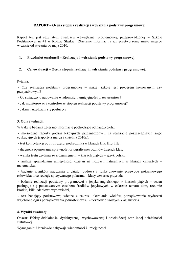 RAPORT – Ocena stopnia realizacji i wdrażania podstawy programowej