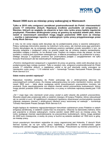 Nawet 3500 euro za miesiąc pracy wakacyjnej w Niemczech Tylko w 2010 roku emigranci zarobkowi przetransferowali do Polski równowartość prawie 17 miliardów złotych. Najwięcej środków pochodziło od emigrantów z Niemiec, których ze względu na otwarcie w tym roku rynku pracy będzie regularnie przybywać. Powodem atrakcyjności pracy za granicą są wysokie stawki płac, które nawet w sezonowych zawodach mogą sięgać poziomów 3500 euro za miesiąc – wynika z najnowszego raportu o wakacyjnym rynku pracy przygotowanego przez firmę Work Service. Z roku na rok coraz więcej osób decyduje się na podejmowanie pracy w sezonie wakacyjnym. Polacy wybierają różnorodne zawody na rodzimym rynku pracy, ale również poza jego granicami. Osoby decydujące się na emigrację zarobkową powinny pamiętać przede wszystkim o tym, że decyzja związana z podjęciem pracy za granicą wiąże się ze zmianą miejsca zamieszkania, nierzadko rozłąką z rodziną i to na dłuższy czas. Dopiero na miejscu może się okazać, że brak kontaktu z rodziną jest czynnikiem stresogennym, w efekcie prowadzącym do problemów w pracy. Dlatego decyzja o wyjeździe powinna być przemyślana, podjęta z uwzględnieniem nie tylko korzyści finansowych ale też ewentualnych niedogodności. „Pomimo niedogodności związanych z wyjazdami do pracy za granicę, wiele osób decyduje się na podejmowanie tego rodzaju wyzwań. Tylko w zeszłym roku, emigranci przetransferowali do Polski prawie 17 miliardów złotych, a największy udział w tej puli stanowiły osoby pracujące na niemieckim rynku pracy – 1,15 miliarda euro” – komentuje Tomasz Hanczarek Prezes Zarządu Work Service S.A. Gdzie można zarobić najwięcej? Najwyższe transfery pieniędzy do Polski pokrywają się z atrakcyjnością płacową na poszczególnych rynkach pracy. Za miesiąc wakacyjnej pracy na rynku niemieckim można zarobić nawet 3500 euro – takie płace występują wśród poszukiwanych pracowników montażu lub produkcji. Duże zapotrzebowanie ma miejsce również wśród pracowników budowlanych, którzy mogą zarobić przeszło 2000 euro miesięcznie, a w pracy w rolnictwie najniższą stawką jest 1100 euro. „Od 1 maja tego roku niemiecki rynek pracy został w pełni otwarty dla polskich pracowników. Wysokie stawki płac przekonały tylko w ostatnim miesiącu 40 tysięcy Polaków, którzy zdecydowali się na zarobki w euro. W najbliższych miesiącach będziemy obserwować porównywalnie wysokie migracje związane również z atrakcyjnymi ofertami pracy sezonowej na wakacje” – komentuje Tomasz Hanczarek Prezes Zarządu Work Service S.A. Anglia będąca do niedawna najpopularniejszym kierunkiem wybieranym przez Polaków w celach emigracji zarobkowej, w ostatnim czasie traci na znaczeniu. Obecnie na stanowisku kelnera, które jest popularne w okresie wakacyjnym, można zarobić nawet 2800 euro za miesiąc pracy. Na rynku występuje również zapotrzebowanie na pracowników budowlanych, którzy mogą zarabiać do 2400 euro miesięcznie, a osoby do pracy w kuchni są wstanie zarabiać od 1500 euro w górę, za miesiąc pracy. Innym popularnym kierunkiem wyjazdów do pracy zagranicznej jest Holandia. Z danych Work Service wynika, że na tym rynku pracy najłatwiej o zatrudnienie w sadownictwie, gdzie miesięcznie zarobki sięgają nawet 2100 euro za miesiąc. Poszukiwani są również pracownicy w rolnictwie i pracach kuchennych, którzy mogą liczyć na płace przekraczające 1000 euro za miesiąc. Praca wakacyjna w Polsce Pomoc biurowa, hostessa i kurier to wakacyjne zawody, które przyniosą tego lata największe średnie zyski na polskim rynku pracy. Najwyższe wynagrodzenie za prace wakacyjne można uzyskać jako hostessa. Stawki godzinowe w tej profesji dochodzą nawet do poziomu 18 zł netto. Wynagrodzenie hostessy może wahać się od ponad 8 zł za godzinę do 18 zł. Najmniejsze zróżnicowanie płacowe występuje wśród osób rozdających ulotki, natomiast najwyższe średnie zarobki można uzyskać pracując jako pomoc biurowa, na poziomie 13,4 złotych za godzinę. „W okresie letnim, w Polsce jak i innych krajach, bardzo popularne są prace sezonowe związane z ogrodnictwem. Niestety na rodzimym rynku płace w tym sektorze są znacznie niższe niż za granicą, bo nie przekraczają one poziomu 10 zł za godzinę netto” – komentuje Krzysztof Inglot, Dyrektor Działu Rozwoju Rynków w Work Service. Zapotrzebowanie na pracowników sezonowych będzie zróżnicowane pod względem wielkości miejscowości jak i położenia na mapie Polski. Osoby poszukujące zatrudnienia w gastronomii w największym stopniu będą miały możliwość znalezienia pracy nad morzem oraz rodzimych kurortach. Osoby do pracy w ogrodnictwie będą poszukiwane na terenach wiejskich, a w profesjach najlepiej płatnych – pomoce biurowe oraz hostessy - pracę będzie można znaleźć w dużych i średnich miastach. Jak nie dać się oszukać, szukając pracy wakacyjnej? „Bardzo istotną sprawą jest zadbanie o współpracę z wiarygodnymi i rzetelnymi pracodawcami. Duże agencje pośrednictwa pracy, posiadające odpowiednie licencje i zezwolenia, gwarantują legalną i uczciwą pracę na wakacje” – mówi Krzysztof Inglot z Work Service. Przed podjęciem decyzji o wyborze agencji zatrudnienia, pracownik powinien przeprowadzić rozmowy z 3-5 różnymi agencjami, aby mieć skalę porównania i na tej podstawie dokonać wyboru najlepszej oferty. Zanim podejmiemy pracę należy dokładne przeczytać umowę oraz zapoznać się ze szczegółowymi warunkami pracy, w tym godzinowym wymiarem pracy. *** Grupa Kapitałowa Work Service S.A. świadczy usługi w obszarze zarządzania zasobami ludzkimi. Specjalizuje się w poszukiwaniu i rekrutacji wykwalifikowanych pracowników, doradztwie personalnym, pełnym outsourcingu funkcji związanych z zarządzaniem kadrami i procesami pomocniczymi w przedsiębiorstwach oraz oferowaniem rozw