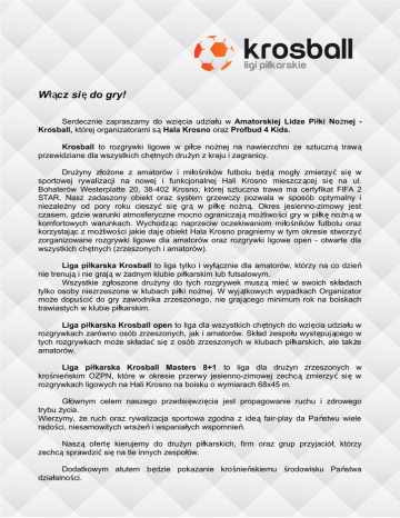 W łącz si ę do gry! Serdecznie zapraszamy do wzięcia udziału w Amatorskiej Lidze Piłki Nożnej Krosball, której organizatorami s ą Hala Krosno oraz Profbud 4 Kids. Krosball to rozgrywki ligowe w piłce nożnej na nawierzchni ze sztuczn ą traw ą przewidziane dla wszystkich ch ętnych drużyn z kraju i zagranicy. Drużyny złożone z amatorów i miłośników futbolu b ęd ą mogły zmierzy ć si ę w sportowej rywalizacji na nowej i funkcjonalnej Hali Krosno mieszcz ącej si ę na ul. Bohaterów Westerplatte 20, 38-402 Krosno, której sztuczna trawa ma certyfikat FIFA 2 STAR. Nasz zadaszony obiekt oraz system grzewczy pozwala w sposób optymalny i niezależny od pory roku cieszyć si ę gr ą w piłk ę nożn ą. Okres jesienno-zimowy jest czasem, gdzie warunki atmosferyczne mocno ograniczaj ą możliwo ści gry w piłk ę nożn ą w komfortowych warunkach. Wychodz ąc naprzeciw oczekiwaniom miło śników futbolu oraz korzystając z możliwości jakie daj ę obiekt Hala Krosno pragniemy w tym okresie stworzy ć zorganizowane rozgrywki ligowe dla amatorów oraz rozgrywki ligowe open - otwarte dla wszystkich chętnych (zrzeszonych i amatorów). Liga piłkarska Krosball to liga tylko i wyłącznie dla amatorów, którzy na co dzień nie trenują i nie graj ą w żadnym klubie piłkarskim lub futsalowym. Wszystkie zgłoszone drużyny do tych rozgrywek musz ą mie ć w swoich składach tylko osoby niezrzeszone w klubach piłki nożnej. W wyj ątkowych wypadkach Organizator może dopuścić do gry zawodnika zrzeszonego, nie graj ącego minimum rok na boiskach trawiastych w klubie piłkarskim. Liga piłkarska Krosball open to liga dla wszystkich ch ętnych do wzi ęcia udziału w rozgrywkach zarówno osób zrzeszonych, jak i amatorów. Skład zespołu wyst ępuj ącego w tych rozgrywkach może składać si ę z osób zrzeszonych w klubach piłkarskich, ale także amatorów. Liga piłkarska Krosball Masters 8+1 to liga dla drużyn zrzeszonych w krośnieńskim OZPN, które w okresie przerwy jesienno-zimowej zechc ą zmierzy ć si ę w rozgrywkach ligowych na Hali Krosno na boisku o wymiarach 68x45 m. Głównym celem naszego przedsi ęwzi ęcia jest propagowanie ruchu i zdrowego trybu życia. Wierzymy, że ruch oraz rywalizacja sportowa zgodna z ide ą fair-play da Pa ństwu wiele radości, niesamowitych wrażeń i wspaniałych wspomnień. Naszą ofertę kierujemy do drużyn piłkarskich, firm oraz grup przyjaciół, którzy zechcą sprawdzić się na tle innych zespołów. Dodatkowym atutem b ędzie pokazanie kro śnieńskiemu środowisku Państwa działalności. Występuj ąc pod nazw ą swojej firmy b ęd ą Państwo kojarzeni nie tylko ze sportowymi rozgrywkami, ale także z tym co robi ą Państwo na co dzień. Dzięki relacjom w lokalnych mediach, a także d zięki naszemu partnerowi firmie Stimo.net, która będzie pokazywała mecze na żywo b ęd ą Państwo mogli dotrze ć do większej liczby klientów. Warunkiem uczestnictwa jest dostarczenie Organizatorowi wypełnionego formularza zgłoszeń, oświadczeń zawodników odno śnie stanu zdrowia oraz zaznajomieniem si ę z Regulaminem rozgrywek i Regulaminem Hali Krosno, a tak że opłaty wpisowej. Organizator prosi o zaopatrzenie si ę w koszulki z widocznym numerem na plecach ułatwiaj ących identyfikacj ę zawodników podczas gry. Formularz zgłoszeń, oświadczenia, numer konta do wpłaty wpisowego można pobrać na naszej stronie. W przypadku dużej liczby zainteresowanych naszymi rozgrywkami Organizator zastrzega sobie prawo ograniczenia liczby drużyn o zgłoszeniu zadecyduje kolejno ść zgłoszeń oraz dopełnienie warunków uczestnictwa. Regulamin Krosball Liga Masters sezon 2016/2017 Rozgrywki 1. Liga piłkarska Krosball Masters to liga dla drużyn zrzeszonych w krośnieńskim OZPN, które w okresie przerwy jesienno-zimowej zechc ą zmierzy ć si ę w rozgrywkach ligowych na Hali Krosno. 2. Zespoły zmierzą się systemem “każdy z każdym”. 3. W przypadku mniejszej ilości zgłoszonych drużyn Organizator przedstawi na spotkaniu przedsezonowym drugi wariant rozgrywek, maj ący na celu uatrakcyjnienie zmagań. 4. Mecze rozgrywane będ ą w 9-cio osobowym składzie (8+1) na obiekcie Hala Krosno. 5. Czas trwania jednego spotkania to 2x30 min, z przerwą maksymalnie 5 minut. 6. O klasyfikacji końcowej w tabeli decyduj ą kolejno: Przy dwóch drużynach: a) ilość zdobytych punktów b) przy równej liczbie zdobytych punktów liczba zdobytych punktów pomi ędzy zainteresowanymi zespołami c) korzystniejsza różnica pomi ędzy zdobytymi i utraconymi bramkami w meczach pomiędzy zainteresowanymi ekipami d) przy dalszej równości korzystniejsza różnica bramek we wszystkich meczach e) następnie większa liczba bramek zdobytych we wszystkich meczach f) losowanie przeprowadzone przez organizatora rozgrywek. Przy więcej niż dwóch zespołach: a) ilość zdobytych punktów b) przy równej liczbie zdobytych punktów liczba zdobytych punktów pomi ędzy zainteresowanymi zespołami c) większa liczba bramek zdobytych w meczach mi ędzy zainteresowanymi ekipami d) przy dalszej równości korzystniejsza różnica bramek we wszystkich meczach e) losowanie przeprowadzone przez organizatora rozgrywek. 7. Organizator przed rozpoczęciem zmagań ligowych przedstawi planowany terminarz sezonu. 8. W wyjątkowych przypadkach istnieje możliwość przełożenia spotkania, na co zgod ę musi wyrazić Organizator i zainteresowane drużyny. W przypadku zdarzeń losowych o przełożeniu spotkania decyduj ę wyłącznie Organizator. 9. W przypadku przełożenia kolejki z uwagi na serwisowanie boisk lub innych zdarze ń wynikaj ących z użytkowanego obiektu Organizator ma obowi ązek powiadomi ć drużyny (bez ograniczeń czasowych, nawet dzień przed kolejk ą). Zgłoszenia 10. Każdy zespół powinien posiadać kapitana, który b ędzie odpowiedzialny za sprawy zgłoszenia oraz prowadzenia drużyny. Prosimy aby taka osoba była na mec