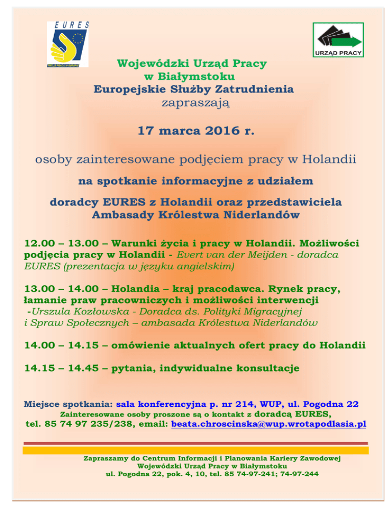 Wojewódzki Urząd Pracy w Białymstoku Europejskie Służby Zatrudnienia zapraszają 17 marca 2016 r. osoby zainteresowane podjęciem pracy w Holandii na spotkanie informacyjne z udziałem doradcy EURES z Holandii oraz przedstawiciela Ambasady Królestwa Niderlandów 12.00 – 13.00 – Warunki życia i pracy w Holandii. Możliwości podjęcia pracy w Holandii - Evert van der Meijden - doradca EURES (prezentacja w języku angielskim) 13.00 – 14.00 – Holandia – kraj pracodawca. Rynek pracy, łamanie praw pracowniczych i możliwości interwencji -Urszula Kozłowska - Doradca ds. Polityki Migracyjnej i Spraw Społecznych – ambasada Królestwa Niderlandów 14.00 – 14.15 – omówienie aktualnych ofert pracy do Holandii 14.15 – 14.45 – pytania, indywidualne konsultacje Miejsce spotkania: sala konferencyjna p. nr 214, WUP, ul. Pogodna 22 Zainteresowane osoby proszone są o kontakt z doradcą EURES, tel. 85 74 97 235/238, email: [email protected] Zapraszamy do Centrum Informacji i Planowania Kariery Zawodowej Wojewódzki Urząd Pracy w Białymstoku ul. Pogodna 22, pok. 4, 10, tel. 85 74-97-241; 74-97-244