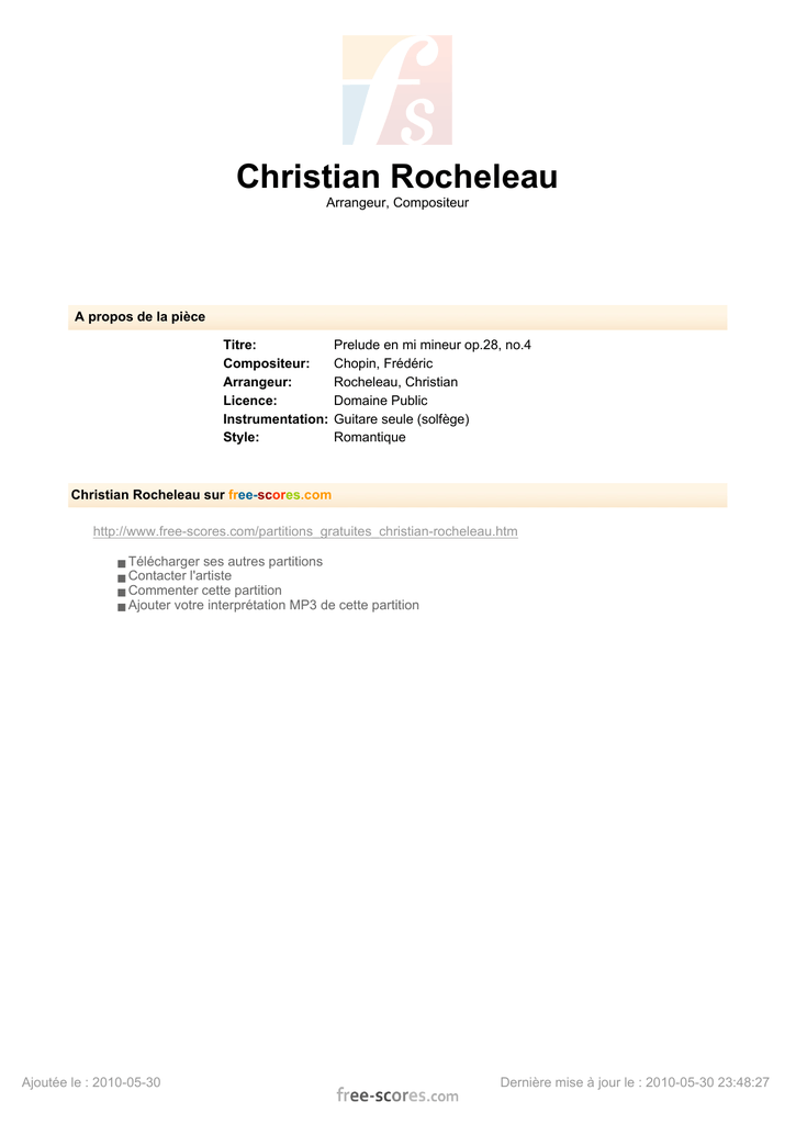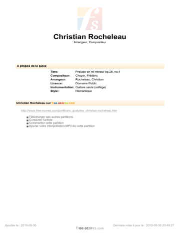 Christian Rocheleau Arrangeur, Compositeur A propos de la pièce Titre: Compositeur: Arrangeur: Licence: Instrumentation: Style: Prelude en mi mineur op.28, no.4 Chopin, Frédéric Rocheleau, Christian Domaine Public Guitare seule (solfège) Romantique Christian Rocheleau sur free-scores.com http://www.free-scores.com/partitions_gratuites_christian-rocheleau.htm ■ ■ ■ ■ Télécharger ses autres partitions Contacter l'artiste Commenter cette partition Ajouter votre interprétation MP3 de cette partition Ajoutée le : 2010-05-30 Dernière mise à jour le : 2010-05-30 23:48:27 Prélude en mi mineur op.28 no.4 Transcription de Christian Rocheleau Frédéric Chopin (1810-1849) 4 2 1 3 Largo IX Guitar VII œ œ ˙. œ œ œ œ œ œ œœ œœ œœ œœ œœ œœ œœœ œœœ œ. p # & CŒ Ó œ ˙. œœ œœ œœ œœ b œœ œœ œœ œœ œœœœ œœœœ 4 1 3 3 ˙ b œœ . œœ œœ nœ œ œ œœ œœ œœ œ œœ # œœ œœ œ œ œ 2 1 4 V 4 3 1 2 # ˙œ . œ œ œ œ & # œœ œœ œœ œœ n œœ 5 3 2 1 4 bœ œ #œ œ œœ œœ œœ # ˙œ œ œ œ 2œŒ œ# œœ œ & n œœ œœ œœ œœ 1œœ œœ œœ œœ 4 3 9 Œ œ 1˙ 1œ œ œ œ 2 œ œ œ œ 1œ œ œœ œœ œœ 1œœ œœ œœ œœ 3 3 VII Œ œ œ œœ œœ œœ œœ œ œ œ œ 3 œ œœ œ œ œœ œ Œ ˙ 2 œ œ œ œ 2œ 1œœ œœ œœ œœ œ #œ 4 3 1 3 (0) œœ œœ œ œœ œ VII Œ ˙ œœ œœ œ œ œœ œœ œ œ # œœ œœ œ œ 4 œ œ œ ˙. œ # œ œ œ œ #œ œ œœ œœ œœ œœ œœ œœ œœ œœ & # œœ œœœœœœœœ œ Œ Ó 13 IX œ ˙. œ. œ œœœ œœœœœœœ œ œœ œœ œœ œœ œœ œœ œœ œœ œœ œœ œœ œ ˙ œœ œœ œ œ œ œ œ œ # œœ œœ œœ œœ 4 4 Œ œj œ œœ œœ œœ œœ œœœœ VII (1) (2) ˙œ . œ œ œ b œ œ œœ œ b ˙œ œ œ œ Œ œ œœ œœ œœ œœ n œœ œœ œœ œœ b n œœ œœ œœ œœ # œœœ œœœ œœœ œœœ VII ©2010 Christian Rocheleau 4 1 3 3 1 2 Prélude en mi mineur op.28 no.4 2 stretto # 3œœ . & (0) œœ 2 (2) 17 4 VII (0) 2 VII V œ œ #œ œ œ1 œ œ ‹ œ 3œ n œ3 œ . œ # œœ œœ n œœ œœœ œ # œœœ œœ œœœ œœœ œœœ œœ œœ œœœ œœ 2#3 œœœ ‰ # œ œnœœ œ 2 1 4 # ˙œ . œ & œœ œœ 20 1 1 2 1 3 2 (3) (0) (2) (0) (4) (5) 1 4 # ˙ & ˙ b ˙˙(5) (6) VII œ œ œœœ œ œœ œ œœ . œ œ œœ œœ œœ œ Œ . œ ˙ œ œ œ œ œ œ œ œ œ œ œ œ œœ œœ 4 ˙œ . œ œ œ b œ œ œœ œ ˙œ . œ # œ œ n œ œ œœ œœ œœ œœ œœ œœ œœ œœ œœ œœ # œœ œœ œœ œœ œ œ œ œ œ œ œœ œœ œœ œœ œœ œœ œœ œœ 2 j œ (0) U Ó ˙˙ ˙ ˙ π # ˙˙ ˙ ˙ j œ œœ œ dim. (6) 24 3 4 3 2 œ œœ œœ œœ 1 3 2 U w ww w w révision du 30 mai 2010 [email protected]