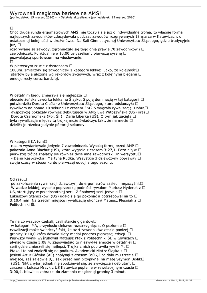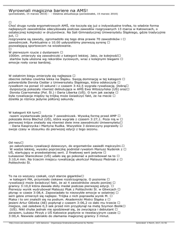 Wyrownali magiczna bariere na AMS! (poniedziałek, 15 marzec 2010) - - Ostatnia aktualizacja (poniedziałek, 15 marzec 2010) Choć druga runda ergometrowych AMŚ, nie toczyła się już o indywidualne trofea, to właśnie forma najlepszych zawodników zdecydowała podczas zawodów rozgrywanych 13 marca w Katowicach, o ostatecznej kolejności w drużynówce. Na Sali Gimnastycznej Uniwersytetu Śląskiego, gdzie tradycyjnie już, rozgrywane są zawody, zgromadziło się tego dnia prawie 70 zawodników i zawodniczek. Punktualnie o 10.00 usłyszeliśmy pierwszą syrenę pozwalającą sportowcom na wiosłowanie. W pierwszym rzucie z dystansem 1000m. zmierzyły się zawodniczki z kategorii lekkiej. Jako, że kolejność startów była ułożona wg rekordów życiowych, wraz z kolejnymi biegami emocje rosły coraz bardziej. W ostatnim biegu zmierzyła się najlepsza obecnie żeńska czwórka lekka na Śląsku. Swoją dominację w tej kategorii potwierdziła Dorota Cieślar z Uniwersytetu Śląskiego, która odskoczyła rywalkom na ponad 10 sekund i z czasem 3:42,5 wygrała rywalizację. Dobrą dyspozycję pokazały również debiutująca w AMŚ Ewa Witoszyńska (UŚ) oraz Dorota Czarnomska (Pol. Śl.) i Daria Liberka (UŚ). O tym jak zacięta była rywalizacja między tą trójką może świadczyć fakt, że na mecie dzieliła je różnica jedynie półtorej sekundy. W kategorii KA tym razem wystartowało jedynie 7 zawodniczek. Wysoką formę przed AMP pokazała Anna Błachut (UŚ), która wygrała z czasem 3:27,1. Poza nią w pierwszej trójce znalazły się również dwie inne zawodniczki Uniwersytetu - Daria Kasprzycka i Martyna Rudka. Wszystkie 3 dziewczyny poprawiły swoje czasy w stosunku do pierwszej edycji z tego sezonu. Od razu po zakończeniu rywalizacji dziewczyn, do ergometrów zasiedli mężczyźni. W wadze lekkiej, wysoko poprzeczkę podniósł rywalom Mariusz Nyderek z UŚ, startujący w przedostatniej serii. Z finałowej serii jedynie Łukaszowi Staniczkowi (UŚ) udało się go pokonać a potrzebował na to 3:10,4 min. Na trzecim miejscu rywalizację ukończył Mateusz Pleśniak z Politechniki Śl. To na co wszyscy czekali, czyli starcie gigantów w kategorii MA, przyniosło ciekawe rozstrzygnięcia. O poziomie rywalizacji może świadczyć fakt, że aż 4 zawodników zeszło poniżej granicy 3:10,0 która dawała złoty medal podczas pierwszej edycji. Pierwszy wynik wyśrubował Mateusz Ptak z Politechniki Śl. w Gliwicach płynąc w czasie 3:08,4. Zapowiadało to niezwykłe emocje w ostatniej serii gdzie zmierzyli się najlepsi. Trójka z nich poprawiła wynik M. Ptaka i to oni znaleźli się na podium. Akademicki Mistrz Śląska z jesieni Artur Główka (AE) popłynął z czasem 3:06,2 co dało mu trzecie miejsce, zaś zaledwie 0,3 sek przed nim przypłynął na metę Szymon Biolik (UŚ). Nikt chyba jednak nie spodziewał się, że zwycięzca i debiutant zarazem, Łukasz Mrzyk z UŚ Katowice popłynie w rewelacyjnym czasie 3:00,4. Niewiele zabrakło do złamania magicznej granicy 3 minut. http://www.azs.katowice.pl - AZS Katowice - Organizacja ŚrodowiskowaPowered by Mambo Generated: 4 March, 2017, 01:56 Po zakończeniu wszystkich "biegów" przyszedł czas na podliczanie punktów i najważniejsze rozstrzygnięcia - klasyfikację drużynową. Po dwóch edycjach wśród kobiet pewnie zwyciężyła reprezentacja Uniwersytetu Śląskiego w Katowicach, wyprzedzając Politechnikę Śląska z Gliwic i Akademię Ekonomiczną Katowice. Łącznie sklasyfikowano 6 zespołów. 1. UŚ Katowice 2. Pol. Śl. Gliwice 3. AE Katowice 4. AWF Katowice 5. GWSP Chorzów 6. WSB Chorzów Wśród mężczyzn kolejność na podium była identyczna jak u Pań, z przewagą 60 pkt pewnie wygrał Uniwersytet Śląski. Gdyby jednak o drugim miejscu miała decydować tylko druga edycja, to z pewnością Politechnika Śląska musiała by walczyć zaciekle o obronę drugiego miejsca z Akademią Ekonomiczną. Zwiastuje to duże emocje na przyszły sezon. Łącznie w tegorocznej edycji Akademickich Mistrzostw Śląska w Ergometrze Mężczyzn wzięło udział 7 uczelni. 1. UŚ Katowice 2. Pol. Śl. Gliwice 3. AE Katowice 4. AWF Katowice 5. GWSP Chorzów 6. WSB Chorzów 7. GWSH Katowice Warto również dodać, że w ramach II edycji Akademickich Mistrzostw Śląska rozgrywane były Mistrzostwa Uniwersytetu Śląskiego w Ergometrze dla studentów I roku. Pomysł okazał się jak najbardziej udany bo pierwszoroczniacy mocnym akcentem zapisali się w klasyfikacjach indywidualnych i podnieśli poprzeczkę rutynowanym zawodnikom. Na najlepszych oczywiście czekały upominkowe nagrody i dyplomy. A już za miesiąc czekają nas kolejne emocje z udziałem naszych zawodników. W dniach 15-16 kwietnia koła ergometrów rozpędzą się na sali Uniwersytetu Warszawskiego podczas Akademickich Mistrzostw Polski. Już teraz trzymamy kciuki! Pełne wyniki rywalizacji Galeria zdjęć z zawodów http://www.azs.katowice.pl - AZS Katowice - Organizacja ŚrodowiskowaPowered by Mambo Generated: 4 March, 2017, 01:56