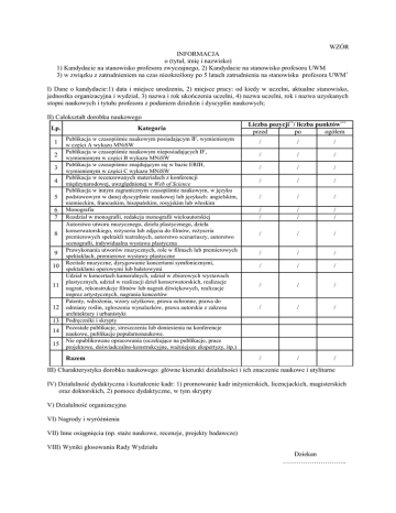 WZÓR INFORMACJA o (tytuł, imię i nazwisko) 1) Kandydacie na stanowisko profesora zwyczajnego, 2) Kandydacie na stanowisko profesora UWM 3) w związku z zatrudnieniem na czas nieokreślony po 5 latach zatrudnienia na stanowisku profesora UWM* I) Dane o kandydacie:1) data i miejsce urodzenia, 2) miejsce pracy: od kiedy w uczelni, aktualne stanowisko, jednostka organizacyjna i wydział, 3) nazwa i rok ukończenia uczelni, 4) nazwa uczelni, rok i nazwa uzyskanych stopni naukowych i tytułu profesora z podaniem dziedzin i dyscyplin naukowych; II) Całokształt dorobku naukowego Lp. 1 2 3 4 5 6 7 8 9 10 11 12 13 14 15 Kategoria Publikacja w czasopiśmie naukowym posiadającym IF, wymienionym w części A wykazu MNiSW Publikacja w czasopiśmie naukowym nieposiadających IF, wymienionym w części B wykazu MNiSW Publikacja w czasopiśmie znajdującym się w bazie ERIH, wymienionym w części C wykazu MNiSW Publikacja w recenzowanych materiałach z konferencji międzynarodowej, uwzględnionej w Web of Science Publikacja w innym zagranicznym czasopiśmie naukowym, w języku podstawowym w danej dyscyplinie naukowej lub językach: angielskim, niemieckim, francuskim, hiszpańskim, rosyjskim lub włoskim Monografia Rozdział w monografii, redakcja monografii wieloautorskiej Autorstwo utworu muzycznego, dzieła plastycznego, dzieła konserwatorskiego, reżyseria lub zdjęcia do filmów, reżyseria premierowych spektakli teatralnych, autorstwo scenariuszy, autorstwo scenografii, indywidualna wystawa plastyczna Prawykonania utworów muzycznych, role w filmach lub premierowych spektaklach, premierowe wystawy plastyczne Recitale muzyczne, dyrygowanie koncertami symfonicznymi, spektaklami operowymi lub baletowymi Udział w koncertach kameralnych, udział w zbiorowych wystawach plastycznych, udział w realizacji dzieł konserwatorskich, realizacje nagrań, rekonstrukcje filmów lub nagrań dźwiękowych, realizacje imprez artystycznych, nagrania koncertów Patenty, wdrożenia, wzory użytkowe, prawa ochronne, prawa do odmiany roślin, zgłoszenia wynalazków, prawa autorskie z zakresu architektury i urbanistyki Podręczniki i skrypty Pozostałe publikacje, streszczenia lub doniesienia na konferencje naukowe, publikacje popularnonaukowe. Nie opublikowane opracowania (oczekujące na publikacje, prace projektowe, doświadczalno-konstrukcyjne, ważniejsze ekspertyzy, itp.) Razem Liczba pozycji**/ liczba punktów*** przed po ogółem / / / / / / / / / / / / / / / / / / / / / / / / / / / / / / / / / / / / / / / III) Charakterystyka dorobku naukowego: główne kierunki działalności i ich znaczenie naukowe i utylitarne IV) Działalność dydaktyczna i kształcenie kadr: 1) promowanie kadr inżynierskich, licencjackich, magisterskich oraz doktorskich, 2) pomoce dydaktyczne, w tym skrypty V) Działalność organizacyjna VI) Nagrody i wyróżnienia VII) Inne osiągnięcia (np. staże naukowe, recenzje, projekty badawcze) VIII) Wyniki głosowania Rady Wydziału Dziekan ……………………….. * wybrać odpowiednie ** 1) na stanowisko profesora zwyczajnego przed i po uzyskaniu tytułu profesora 2) na stanowisko profesora UWM przed i po uzyskaniu stopnia doktora habilitowanego 3) przedłużenie zatrudnienia na czas nieokreślony przed zatrudnieniem na stanowisko profesora UWM i po 5 latach pracy na tym stanowisku *** definicje kategorii i punktacja według rozporządzenia Ministra Nauki i Szkolnictwa Wyższego z dnia 13 lipca 2012 r. w sprawie kryteriów i trybu przyznawania kategorii naukowej jednostkom naukowym UWAGA! Kandydaci z obszaru nauk ścisłych i inżynierskich oraz nauk o życiu powinni w punkcie III informacji podać sumaryczny impact factor publikacji, liczbę cytowań i indeks Hirscha według Web of Science. Kandydaci z obszaru nauk humanistycznych i społecznych (nauk humanistycznych, nauk teologicznych, nauk społecznych, nauk ekonomicznych i nauk prawnych) mogą usunąć z tabeli wiersze 8-11. Kandydaci z obszaru nauk ścisłych i inżynierskich (nauk chemicznych, nauk fizycznych, nauk matematycznych i nauk technicznych) oraz nauk o życiu (nauk biologicznych, nauk farmaceutycznych, nauk leśnych, nauk medycznych, nauk o kulturze fizycznej, nauk o Ziemi, nauk o zdrowiu, nauk rolniczych i nauk weterynaryjnych) mogą usunąć z tabeli wiersz 5 i wiersze 8-11.