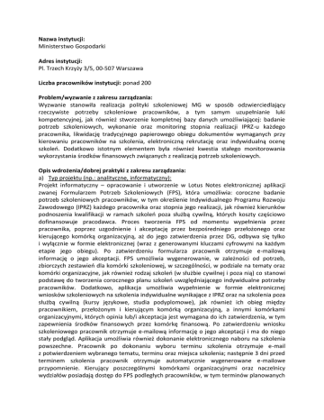 Nazwa instytucji: Ministerstwo Gospodarki Adres instytucji: Pl. Trzech Krzyży 3/5, 00-507 Warszawa Liczba pracowników instytucji: ponad 200 Problem/wyzwanie z zakresu zarządzania: Wyzwanie stanowiła realizacja polityki szkoleniowej MG w sposób odzwierciedlający rzeczywiste potrzeby szkoleniowe pracowników, a tym samym uzupełnianie luki kompetencyjnej, jak również stworzenie kompletnej bazy danych umożliwiającej: badanie potrzeb szkoleniowych, wykonanie oraz monitoring stopnia realizacji IPRZ-u każdego pracownika, likwidację tradycyjnego papierowego obiegu dokumentów wymaganych przy kierowaniu pracowników na szkolenia, elektroniczną rekrutację oraz indywidualną ocenę szkoleo. Dodatkowo istotnym elementem była również kwestia stałego monitorowania wykorzystania środków finansowych związanych z realizacją potrzeb szkoleniowych. Opis wdrożenia/dobrej praktyki z zakresu zarządzania: a) Typ projektu (np.: analityczne, informatyczny): Projekt informatyczny – opracowanie i utworzenie w Lotus Notes elektronicznej aplikacji zwanej Formularzem Potrzeb Szkoleniowych (FPS), która umożliwia: coroczne badanie potrzeb szkoleniowych pracowników, w tym określenie Indywidualnego Programu Rozwoju Zawodowego (IPRZ) każdego pracownika oraz stopnia jego realizacji, jak również kierunków podnoszenia kwalifikacji w ramach szkoleo poza służbą cywilną, których koszty częściowo dofinansowuje pracodawca. Proces tworzenia FPS od momentu wypełnienia przez pracownika, poprzez uzgodnienie i akceptację przez bezpośredniego przełożonego oraz kierującego komórką organizacyjną, aż do jego zatwierdzenia przez DG, odbywa się tylko i wyłącznie w formie elektronicznej (wraz z generowanymi kluczami cyfrowymi na każdym etapie jego obiegu). Po zatwierdzeniu formularza pracownik otrzymuje e-mailową informację o jego akceptacji. FPS umożliwia wygenerowanie, w zależności od potrzeb, zbiorczych zestawieo dla komórki szkoleniowej, w szczególności, w podziale na tematy oraz komórki organizacyjne, jak również rodzaj szkoleo (w służbie cywilnej i poza nią) co stanowi podstawę do tworzenia corocznego planu szkoleo uwzględniającego indywidualne potrzeby pracowników. Dodatkowo, aplikacja umożliwia wypełnienie w formie elektronicznej wniosków szkoleniowych na szkolenia indywidualne wynikające z IPRZ oraz na szkolenia poza służbą cywilną (kursy językowe, studia podyplomowe), jak również ich obieg między pracownikiem, przełożonym i kierującym komórką organizacyjną, a innymi komórkami organizacyjnymi, których opinia lub/i akceptacja jest wymagana do ich zatwierdzenia, w tym zapewnienia środków finansowych przez komórkę finansową. Po zatwierdzeniu wniosku szkoleniowego pracownik otrzymuje e-mailową informację o jego akceptacji i ma do niego stały podgląd. Aplikacja umożliwia również dokonanie elektronicznego naboru na szkolenia powszechne. Pracownik po dokonaniu wyboru terminu szkolenia otrzymuje e-mail z potwierdzeniem wybranego tematu, terminu oraz miejsca szkolenia; następnie 3 dni przed terminem szkolenia pracownik otrzymuje automatycznie wygenerowane e-mailowe przypomnienie. Kierujący poszczególnymi komórkami organizacyjnymi oraz naczelnicy wydziałów posiadają dostęp do FPS podległych pracowników, w tym terminów planowanych i odbywanych przez pracowników szkoleo. Ponadto aplikacja generuje w bazie danych listy osób, które zgłosiły się na szkolenia ze wskazaniem konkretnego tematu, wybranego terminu oraz pokazaniem, z której komórki organizacyjnej ile osób wybrało dane szkolenie, jak również globalnej liczby osób na dany termin i dane szkolenie. Ponadto, aplikacja zapewnia wypełnienie elektronicznej Ankiety Indywidualnej Oceny Szkolenia (AIOS), do której link jest automatycznie wysyłany do pracownika po odbytym szkoleniu. Jego wypełnienie jest obowiązkowym elementem podnoszenia kwalifikacji, który umożliwia wypełnienie wniosku na kolejne szkolenie. Wypełnione AIOS-y umożliwiają generowanie różnorodnych zestawieo w zależności od potrzeb komórki szkoleniowej. Ponadto aplikacja umożliwia komórce szkoleniowej i finansowej bieżący monitoring w zakresie etapu na jakim znajdują się poszczególne szkolenia, w tym zbliżające się płatności, czy też koniecznośd wyksięgowania zaangażowanych wcześniej środków finansowych. Powyższe możliwe jest dzięki automatycznej zmianie kolorystki każdego wniosku, w zależności od etapu na jakim się on znajduje, i tak: kolor czarny – wniosek w obiegu ze wskazaniem pracownika, u którego aktualnie się on znajduje, kolor zielony – wniosek zaakceptowany – przed terminem szkolenia, kolor fioletowy – szkolenie zrealizowane, należy dostarczyd fakturę, kolor czerwony – szkolenie odwołane lub brak zgody. b) Cele projektu: Celem projektu jest: - unowocześnienie dotychczasowej formy realizacji polityki szkoleniowej (zamiana tradycyjnej, czasochłonnej formy papierowej tylko i wyłącznie na elektroniczny obieg dokumentów), - zintegrowanie i zwiększenie efektywności procesu szkoleniowego poprzez wprowadzenie elektronicznych: FPS-ów, IPRZ-ów, AIOS-ów, wniosków szkoleniowych, rekrutacji i rejestracji, informacji o zatwierdzeniu IPRZ-u, o wyrażonej zgodzie na szkolenie, o dokonanym przez pracownika wyborze szkolenia w ramach szkoleo powszechnych wraz z automatyczną informacją i przypomnieniem. Komórka szkoleniowa posiada dostęp do pełnej wiedzy na temat planowanej ścieżki rozwoju zawodowego oraz poszczególnych etapów jej realizacji przez pracowników, - usprawnienie realizacji procesu podnoszenia kwalifikacji zawodowych pracownika, (pracownik posiada dostęp do podglądu FPS, który zawiera, w szczególności, IPRZ, wnioski szkoleniowe i AIOS-y, natomiast przełożony do FPS-ów podległych mu pracowników), - oszczędnośd czasu osób zaangażowanych w obieg dokumentów (dyrektorzy, bezpośredni przełożeni, sekretariaty, pracow